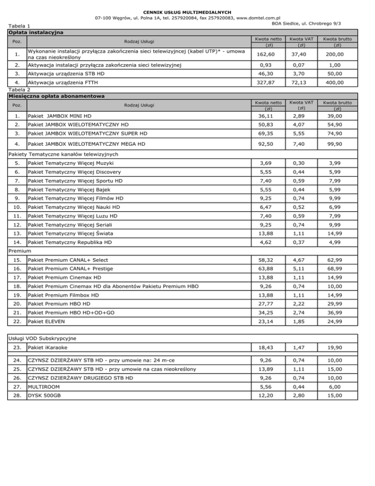 Tabela 1 Opłata instalacyjna CENNIK USŁUG MULTIMEDIALNYCH 07-100 Węgrów, ul. Polna 1A, tel. 257920084, fax 257920083, www.domtel.com.pl BOA Siedlce, ul. Chrobrego 9/3 Poz. Rodzaj Usługi 1. Wykonanie instalacji przyłącza zakończenia sieci telewizyjncej (kabel UTP)* - umowa na czas nieokreślony 2. Aktywacja instalacji przyłącza zakończenia sieci telewizyjnej 3. Aktywacja urządzenia STB HD 4. Aktywacja urządzenia FTTH Kwota netto Kwota VAT Kwota brutto (zł) (zł) (zł) 162,60 37,40 200,00 0,93 0,07 1,00 46,30 3,70 50,00 327,87 72,13 400,00 Tabela 2 Miesięczna opłata abonamentowa Poz. Rodzaj Usługi Kwota netto (zł) Kwota VAT (zł) Kwota brutto (zł) 1. Pakiet JAMBOX MINI HD 36,11 2,89 39,00 2. Pakiet JAMBOX WIELOTEMATYCZNY HD 50,83 4,07 54,90 3. Pakiet JAMBOX WIELOTEMATYCZNY SUPER HD 69,35 5,55 74,90 4. Pakiet JAMBOX WIELOTEMATYCZNY MEGA HD 92,50 7,40 99,90 Pakiety Tematyczne kanałów telewizyjnych 5. Pakiet Tematyczny Więcej Muzyki 3,69 0,30 3,99 6. Pakiet Tematyczny Więcej Discovery 5,55 0,44 5,99 7. Pakiet Tematyczny Więcej Sportu HD 7,40 0,59 7,99 8. Pakiet Tematyczny Więcej Bajek 5,55 0,44 5,99 9. Pakiet Tematyczny Więcej Filmów HD 9,25 0,74 9,99 10. Pakiet Tematyczny Więcej Nauki HD 6,47 0,52 6,99 11. Pakiet Tematyczny Więcej Luzu HD 7,40 0,59 7,99 12. Pakiet Tematyczny Więcej Seriali 9,25 0,74 9,99 13. Pakiet Tematyczny Więcej Świata 13,88 1,11 14,99 14. Pakiet Tematyczny Republika HD 4,62 0,37 4,99 Premium 15. Pakiet Premium CANAL+ Select 58,32 4,67 62,99 16. Pakiet Premium CANAL+ Prestige 63,88 5,11 68,99 17. Pakiet Premium Cinemax HD 13,88 1,11 14,99 18. Pakiet Premium Cinemax HD dla Abonentów Pakietu Premium HBO 9,26 0,74 10,00 19. Pakiet Premium Filmbox HD 13,88 1,11 14,99 20. Pakiet Premium HBO HD 27,77 2,22 29,99 21. Pakiet Premium HBO HD+OD+GO 34,25 2,74 36,99 22. Pakiet ELEVEN 23,14 1,85 24,99 18,43 1,47 19,90 9,26 0,74 10,00 13,89 1,11 15,00 Usługi VOD Subskrypcyjne 23. Pakiet iKaraoke 24. CZYNSZ DZIERŻAWY STB HD - przy umowie na: 24 m-ce 25. CZYNSZ DZIERŻAWY STB HD - przy umowie na czas nieokreślony 26. CZYNSZ DZIERŻAWY DRUGIEGO STB HD 9,26 0,74 10,00 27. MULTIROOM 5,56 0,44 6,00 28. DYSK 500GB 12,20 2,80 15,00 Tabela 3 Nazwa usługi CENNIK USŁUG MULTIMEDIALNYCH 07-100 Węgrów, ul. Polna 1A, tel. 257920084, fax 257920083, www.domtel.com.pl BOA Siedlce, ul. Chrobrego 9/3 Poz. Rodzaj Usługi Kwota VAT (zł) Kwota brutto (zł) 8,13 1,87 10,00 40,65 9,35 50,00 Kwota netto (zł) 1. Aneks do umowy 2. Switch 5-port 100MB 3. Switch 5-port 1GB 81,30 18,70 100,00 4. Router Wi-Fi, AC, 4x1 Gigabit LAN z konfiguracją 219,51 50,49 270,00 5. Router Wi-Fi, N300, 4x100 Megabit LAN z konfiguracją 162,60 37,40 200,00 40,65 9,35 50,00 40,65 9,35 50,00 16,26 3,74 20,00 16,26 3,74 20,00 Przystosowanie instalacji w lokalu Klienta do podziału na dwa komputery: 6. - ułożenie przewodów w lokalu 7. Konfiguracja Acces Point / routera/STB (urządzenia Klienta) Wyjazd serwisu na żądanie Abonenta w przypadku nieuzasadnionego wezwania serwisu Naprawa istniejącej instalacji (z tych samych materiałów), uszkodzonej z winy Abonenta 8. 9. 10. Usługa serwisowa w siedzibie Klienta każda kolejna godzina 40,65 9,35 50,00 11. Ułożenie dodatkowych przewodów w lokalu / modernizacja instalacji w lokalu 40,65 9,35 50,00 Wymiana lub naprawa instalacji uszkodzonej z winy Abonenta 40,65 9,35 50,00 40,65 9,35 50,00 12. Zmiana lokalizacji świadczenia usługi 13. (jeśli istnieją możliwości techniczne świadczenia usługi w nowej lokalizacji) Obiór urządzenia dostępowego STB przez serwisanta z lokalu abonenta po rozwiązaniu umowy Tabela 4 Kary umowne/ windykacja należności 14. Poz. Rodzaj Usługi 40,65 9,35 Kwota (zł) Regulamin lub Regulamin Promocji 1. Kwota za zerwanie warunków umowy 2. Kwota za udostępnianie usługi poza lokal, po bezskutecznym informowaniu o zaniechaniu 1 000,00 3. Kwota za dokonywanie jakichkolwiek zmian technicznych w użyczonym urządzeniu dostępowym STB, w tym przełamywanie zabezpieczeń, przerabianie itp. 1 000,00 4. Opłata za niezwrócenie (powyżej 7 dni), uszkodzenie urządzenia dostępowego STB lub zwrot niekompletnego urządzenia dostępowego STB, zwrócony sprzęt nosi znamiona nadmiernego używania 400,00 5. Opłata za niezwrócenie (powyżej 7 dni), uszkodzenie DYSKU lub zwrot niekompletnego urządzenia, zwrócony sprzęt nosi znamiona nadmiernego używania 400,00 6. Opłata za niezwrócenie (powyżej 7 dni), uszkodzenie urządzenia FTTH lub zwrot niekompletnego urządzenia, zwrócony sprzęt nosi znamiona nadmiernego używania 400,00 * 50,00 w przypadku braku instalacji w lokalu Cennik obowiązuje Abonentów, których Umowa o świadczenie Usługi Telewizji Cyfrowej lub Aneks do Umowy został podpisany po dniu: 01.12.2016r.