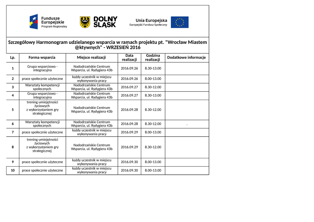 Szczegółowy Harmonogram udzielanego wsparcia w ramach projektu pt. "Wrocław Miastem @ktywnych" - WRZESIEŃ 2016 Lp. Forma wsparcia Miejsce realizacji Data realizacji Godzina realizacji 1 Grupa wsparciowo integracyjna Nadodrzańskie Centrum Wsparcia, ul. Rydygiera 43b 2016.09.26 8.30-13.00 2 prace społecznie użyteczne 2016.09.26 8.00-13.00 3 Warsztaty kompetencji społecznych Grupa wsparciowo integracyjna trening umiejętności życiowych z wykorzystaniem gry strategicznej każdy uczestnik w miejscu wykonywania pracy Nadodrzańskie Centrum Wsparcia, ul. Rydygiera 43b Nadodrzańskie Centrum Wsparcia, ul. Rydygiera 43b 2016.09.27 8.30-12.00 2016.09.27 8.30-13.00 Nadodrzańskie Centrum Wsparcia, ul. Rydygiera 43b 2016.09.28 8.30-12.00 2016.09.28 8.30-12.00 2016.09.29 8.00-13.00 4 5 6 Warsztaty kompetencji społecznych 7 prace społecznie użyteczne Nadodrzańskie Centrum Wsparcia, ul. Rydygiera 43b każdy uczestnik w miejscu wykonywania pracy 8 trening umiejętności życiowych z wykorzystaniem gry strategicznej Nadodrzańskie Centrum Wsparcia, ul. Rydygiera 43b 2016.09.29 8.30-12.00 9 prace społecznie użyteczne 2016.09.30 8.00-13.00 10 prace społecznie użyteczne każdy uczestnik w miejscu wykonywania pracy każdy uczestnik w miejscu wykonywania pracy 2016.09.30 8.00-13.00 Dodatkowe informacje .