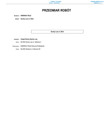 STRONA TYTUŁOWA Temat nr : 003-001-001 PRZEDMIAR ROBÓT Budowa : Obiekt : ENERGO-TELE Suchy Las ul. Świt Suchy Las ul. Świt Inwestor : Adres : Wykonawca : Adres : Urząd Gminy Sychu Las 62-002 Suchy Las ul. Szkolna 2 ENERGO-TELE Edmund Pokładecki 62-200 Gniezno ul. Boczna 25 ORGBUD-SERWIS Poznań KOBRA wer. 13 PRZEDMIAR ROBÓT Temat nr : 003-001-001 ORGBUD-SERWIS Poznań KOBRA wer. 13 Suchy Las ul. Świt Budowa : ENERGO-TELE Obiekt : Suchy Las ul. Świt Data: 2016-11-17 Lp. Podstawa kalkulacji / opis pozycji Ilość Jedn. miary 1 Linia kablowa nn 0,4kV wraz ze słupami 1 ZAŁ.1 - KNNR 005-0701-02-00 MRRiB [ Wydanie - Warszawa 26.09.2000 r. ] 36,160 m3 Ręczne kopanie rowów dla kabli, w gruncie : kat. III 113 * 0.8 * 0.4 = Razem = 2 ZAŁ.1 - KNNR 005-0702-02-00 MRRiB [ Wydanie - Warszawa 26.09.2000 r. ] 36,160 36,160 m3 27,120 m3 Ręczne zasypywanie rowów dla kabli, w gruncie : kat. III 113 * 0.6 * 0.4 = Razem = 3 ZAŁ.1 - KNNR 005-0706-01-00 MRRiB [ Wydanie - Warszawa 26.09.2000 r. ] 27,120 27,120 m3 226,000 m Nasypanie warstwy piasku na dnie rowu kablowego o szerokości: do 0,4 m 2 * 113 = Razem = 4 ZAŁ.1 - KNNR 005-0705-01-00 MRRiB [ Wydanie - Warszawa 26.09.2000 r. ] 226,000 226,000 m 4,000 m Ułożenie rur osłonowych: z PCW, o śr.do 140 mm 5 ZAŁ.1 - KNNR 005-0707-03-00 MRRiB [ Wydanie - Warszawa 26.09.2000 r. ] 109,000 m Ręczne układanie kabli w rowach kablowych, o masie pon. 1,0 do 2,0 kg/m, z przykryciem kabli: folią z PCW uplast.gr.pow.0,4-0,6 mm gat.I/II 6 ZAŁ.1 - KNNR 005-0713-03-00 MRRiB [ Wydanie - Warszawa 26.09.2000 r. ] 4,000 m Układanie kabli w rurach, pustakach lub kanałach zamkniętych, o masie: ponad 1,0 do 3,0 kg/m 7 ZAŁ.1 - KNNR 005-0715-03-00 MRRiB [ Wydanie - Warszawa 26.09.2000 r. ] 12,000 m Układanie kabli w budynkach, budowlach lub na estakadach, z mocowaniem, o masie: ponad 1,0 do 2,0 kg/m 8 Pozycja 135,000 kpl Dostawa kabla YAKY 4x25mm2 9 ZAŁ.1 - KNNR 005-0726-10-00 MRRiB [ Wydanie - Warszawa 26.09.2000 r. ] 6,000 szt Obróbka na sucho kabli na nap.do 1 kV, o izolacji i powłoce z tworzyw sztucznych zarobienie na sucho końca kabla 5-żyłowego, o przekroju żył: ponad 16 do 50 mm2 10 ZAŁ.1 - KNNR 005-1001-02-00 MRRiB [ Wydanie - Warszawa 26.09.2000 r. ] 3,000 szt Montaż i stawianie słupów oświetleniowych, o masie: pon.100 do 300 kg - stalowych 11 ZAŁ.1 - KNNR 005-1003-03-00 MRRiB [ Wydanie - Warszawa 26.09.2000 r. ] 1,000 kpl Montaż przewodów do opraw oświetleniowych, przez wciąganie w słupy, rury osłonowe i wysięgniki, przy wysokości latarń: ponad 7 do 10 m 12 ZAŁ.1 - KNNR 005-1004-02-00 MRRiB [ Wydanie - Warszawa 26.09.2000 r. ] 1,000 szt Montaż opraw oświetlenia zewnetrznego - na wysięgnikach 13 ZAŁ.1 - KNNR 005-0602-04-00 MRRiB [ Wydanie - Warszawa 26.09.2000 r. ] 232,000 m Montaż przewodów uziemiających i wyrównawczych wykonanych z bednarki ocynkowanej o przekroju do 120 mm2: ułożonych luzem 14 ZAŁ.1 - KNNR 005-1302-03-00 MRRiB [ Wydanie - Warszawa 26.09.2000 r. ] Badanie linii kablowej: niskiego napięcia - kabel 4-żyłowy 7,000 odc PRZEDMIAR ROBÓT Temat nr : 003-001-001 ORGBUD-SERWIS Poznań KOBRA wer. 13 Suchy Las ul. Świt 1. Linia kablowa nn 0,4kV wraz ze słupami Data: 2016-11-17 Lp. Podstawa kalkulacji / opis pozycji 15 ZAŁ.1 - KNNR 005-1304-01-00 MRRiB [ Wydanie - Warszawa 26.09.2000 r. ] Ilość Jedn. miary 7,000 szt Badania i pomiary instalacji uziemienia ochronnego lub roboczego: - pierwszy pomiar 2 Wytyczenie i inwentaryzacja geodezyjna 16 Pozycja 1,000 kpl Wytyczenie i inwentaryzacja geodezyjna - - - Koniec wydruku - - - NAKŁADY RMS Temat nr : 003-001-001 ORGBUD-SERWIS Poznań KOBRA wer. 13 Suchy Las ul. Świt Budowa : ENERGO-TELE Obiekt : Suchy Las ul. Świt NAKŁADY RMS Data: 2016-11-17 Lp. Alt. Gr. / Symbol KMB / Producent Inw. Opis czynnika R,M,S Ilość J.m. Robocizna 1. 999 Robocizna 210,85220 r-g Nakład robocizny : 210,85220 r-g Materiały 1. 2. 3. 4. 5. 6. 7. 8. 9. 10. 11. 12. 13. 14. 15. 16. 1034799 1121099 1560199 1601799 2220699 5000999 7341399 7341399 7593500 7620520 7648099 7660199 7959999 7999999 8110199 8190601 Wazeliny techniczne Bednarka stalowa ocynkowana Folie PVC Piaski do nawierzchni drogowych fundament stabilizujący B-80 rura AROT DVK 50 oprawa oświetleniowa SGS 104/100 źródło światła SON Plus 100W tabliczka bezpiecznikowa IZK końcówka kablowa Al 25mm2 Opaski kablowe instalacyjne (OKI) Uchwyty kablowe uniwersalne (UKU) przewód YDY 3x1,5mm2 kabel YAKY 4x25mm2 słup SO 6/3 Słupki oznaczeniowe SO 1,73140 241,28000 45,78000 12,65600 3,00000 4,16000 1,00000 1,00000 3,00000 24,00000 17,82000 6,00000 7,00000 140,40000 3,00000 1,63500 kg m m2 m3 szt m szt szt szt szt szt szt m m szt szt 0,24000 4,22050 3,19730 0,56250 1,20000 1,80800 1,26000 0,56250 6,82080 m-g m-g m-g m-g m-g m-g m-g m-g m-g Sprzęt 1. 2. 3. 4. 5. 6. 7. 8. 9. 11111 31100 39000 39100 39650 39810 39912 39970 72121 Kop.-spych.lub kop.-ładow. 0,15 (1) Żuraw samochodowy (1) Środek transportowy (1) Ciągnik kołowy (1) Przyczepa dłużycowa Samochód samowyładowczy (1) Podnośnik montażowy PMH samochodowy (1) Przyczepa do przewożenia kabli Spawarka elektr.transformatorowa do 500 A UWAGA: Zestawienie obejmuje wyłącznie czynniki RMS występujące w pozycjach kosztorysu sporządzonych metodą szczegółową. - - - Koniec wydruku zestawienia nakładów R, M, S - - -