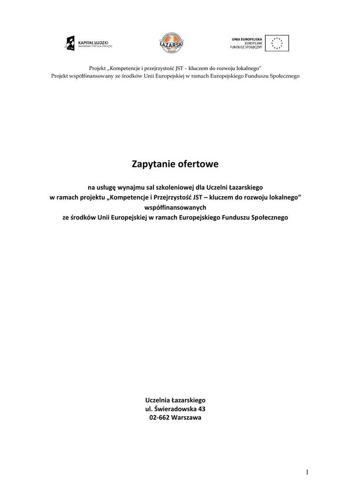Projekt „Kompetencje i przejrzystość JST – kluczem do rozwoju lokalnego” Projekt współfinansowany ze środków Unii Europejskiej w ramach Europejskiego Funduszu Społecznego Zapytanie ofertowe na usługę wynajmu sal szkoleniowej dla Uczelni Łazarskiego w ramach projektu „Kompetencje i Przejrzystość JST – kluczem do rozwoju lokalnego” współfinansowanych ze środków Unii Europejskiej w ramach Europejskiego Funduszu Społecznego Uczelnia Łazarskiego ul. Świeradowska 43 02-662 Warszawa 1 Projekt „Kompetencje i przejrzystość JST – kluczem do rozwoju lokalnego” Projekt współfinansowany ze środków Unii Europejskiej w ramach Europejskiego Funduszu Społecznego ZAPYTANIE OFERTOWE Wykonanie usługi wynajmu Sali szkoleniowej Uczelnia Łazarskiego, ul Świeradowska 43, 02-662 Warszawa jako realizator projektu „Kompetencje i Przejrzystość JST – kluczem do rozwoju lokalnego” w ramach Programu Operacyjnego Kapitał Ludzki współfinansowanego ze środków Unii Europejskiej w ramach Europejskiego Funduszu Społecznego poszukuje wykonawcy usługi cateringowej. Opis usługi 1. Miejsce i termin szkolenia: 1. Białowieża, 1-2 lipca 2011r. 2. Liczba osób: obiad (36osób), przerwa kawowa (36 osób), śniadania (2 osoby) 3. Szczegółowy zakres usługi: 1. Zakres przedmiotowy dot. usługi wynajmu Sali szkoleniowej obejmującej: Wynajem Sali szkoleniowej wyposażonej w infrastrukturę multimedialną w dniach 01 i 02 lipca 2011r.. W dniu 01.07.2011r. sala dostępna dla Zamawiającego od godziny 13.30 do 18.00 W dniu 02.07.2011r. sala dostępna dla Zamawiającego od godziny 8.30 do 17.00 2 Projekt „Kompetencje i przejrzystość JST – kluczem do rozwoju lokalnego” Projekt współfinansowany ze środków Unii Europejskiej w ramach Europejskiego Funduszu Społecznego 4.Procedura i kryteria oceny oferty Zamówienie udzielone jest w trybie zapytania ofertowego. Zamawiający przyjmuje następujące kryteria oceny oferty – Cena- waga 100% 5.Sposób przygotowania oferty oraz miejsce i termin składania ofert W związku z powyższym, w przypadku zainteresowania wykonaniem usługi, prosimy o przedstawienie oferty zawierającej następujące elementy: 1. Nazwa firmy, adres, NIP, Regon oraz wskazania osoby upoważnionej do złożenia oferty (jeśli jest to konieczne). 2. Termin ważności oferty. 3. Cena całkowita oferty netto i brutto. 4. Oferty należy przesłać na adres e-mail: [email protected] w nieprzekraczalnym terminie do 29 czerwca 2011r. do godziny 12.00 3 Projekt „Kompetencje i przejrzystość JST – kluczem do rozwoju lokalnego” Projekt współfinansowany ze środków Unii Europejskiej w ramach Europejskiego Funduszu Społecznego Istotne postanowienia umowy 1. Przedmiotem umowy jest usługa wynajmu Sali wykładowej w dniu 01-02.07.2011r. w Białowieży. 2. Zgodnie z ofertą Wykonawcy z dnia ………………….. r. stanowiącą załącznik Nr 1 do umowy oraz Szczegółowym Opisem Przedmiotu Zamówienia stanowiącym załącznik Nr 2 do umowy. Przewiduje się, iż: szkolenie o którym mowa w pkt.1 odbędzie się dnia 01-02.07.2011, w Białowieży. 3. Harmonogram szkolenia, zostanie podany Wykonawcy przez Zamawiającego w formie elektronicznej (e-mail) niezwłocznie po zawarciu niniejszej umowy. 4. Płatność za usługę realizowana będzie po zakończeniu szkolenia w terminie 30 dni kalendarzowych od dnia otrzymania przez Zamawiającego prawidłowo wystawionej faktury VAT, przelewem na rachunek bankowy. 5. Zamawiający najpóźniej na 1 dzień kalendarzowe przed terminem rozpoczęcia szkolenia przekaże Wykonawcy, w formie elektronicznej (e-mail), ostateczną liczbę uczestników seminarium. 6. Za dzień zapłaty wynagrodzenia uważany będzie dzień wydania przez Zamawiającego dyspozycji przelewu z rachunku Zamawiającego. 7. Podstawą wystawienia faktury VAT będzie protokół odbioru bez zastrzeżeń sporządzony po wykonaniu usługi za usługę cateringową. 8. Zamawiający sporządzi protokół odbioru w terminie 7 dni od dnia wykonania usługi. Wierzytelności wynikające z umowy bez zgody Zamawiającego nie mogą być przenoszone na osoby trzecie. 9. Wykonawca zobowiązany jest zapłacić Zamawiającemu kary umowne w wysokości: 1. 10% wartości brutto przewidzianej za wykonanie przedmiotu na seminarium, w razie niewykonania lub nienależytego wykonania umowy na tym seminarium, zgodnie z wymogami zawartymi w umowie, w tym w Załączniku nr 1 i 2 do umowy; 2. 10% wartości brutto w przypadku, gdy Zamawiający odstąpi od umowy z powodu okoliczności, za które odpowiada Wykonawca. 4 Projekt „Kompetencje i przejrzystość JST – kluczem do rozwoju lokalnego” Projekt współfinansowany ze środków Unii Europejskiej w ramach Europejskiego Funduszu Społecznego 10. W przypadku, gdy suma kar umownych będzie równa bądź przekroczy 30% wynagrodzenia, Zamawiający może niezwłocznie odstąpić od umowy, zawiadamiając o tym pisemnie Wykonawcę. 11. Zamawiający może żądać odszkodowania uzupełniającego na zasadach ogólnych w przypadku, gdy szkoda przekracza wysokość kary umownej. 12. Wykonawca oświadcza, że ma odpowiednie doświadczenie do wykonania umowy i zobowiązuje się do starannego jej wykonania z zachowaniem wymaganego w tym zakresie profesjonalizmu. 13. Ewentualne spory wynikające na tle realizacji umowy będą rozstrzygane przez Strony w drodze negocjacji. W przypadku nieosiągnięcia przez Strony porozumienia wszelkie spory rozstrzygane będą przez sąd właściwy dla siedziby Zamawiającego. 14. Zakazuje się istotnych zmian postawień zawartej umowy w stosunku do treści oferty, na podstawie której dokonano wyboru Wykonawcy. 15. Przewiduje się możliwość zmiany postanowień zawartej umowy w zakresie: 1. miejsca realizacji szkolenia, gdy konieczność jej dokonania wynika z przyczyn losowych, niezależnych od Zamawiającego; 2. terminu realizacji szkolenia, w uzasadnionych przypadkach przyczyn niezależnych od Zama