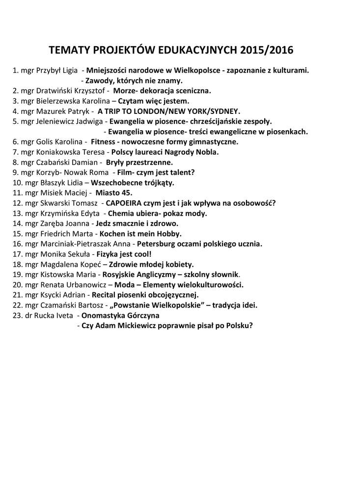 TEMATY PROJEKTÓW EDUKACYJNYCH 2015/2016 1. mgr Przybył Ligia - Mniejszości narodowe w Wielkopolsce - zapoznanie z kulturami. - Zawody, których nie znamy. 2. mgr Dratwiński Krzysztof - Morze- dekoracja sceniczna. 3. mgr Bielerzewska Karolina – Czytam więc jestem. 4. mgr Mazurek Patryk - A TRIP TO LONDON/NEW YORK/SYDNEY. 5. mgr Jeleniewicz Jadwiga - Ewangelia w piosence- chrześcijańskie zespoły. - Ewangelia w piosence- treści ewangeliczne w piosenkach. 6. mgr Golis Karolina - Fitness - nowoczesne formy gimnastyczne. 7. mgr Koniakowska Teresa - Polscy laureaci Nagrody Nobla. 8. mgr Czabański Damian - Bryły przestrzenne. 9. mgr Korzyb- Nowak Roma - Film- czym jest talent? 10. mgr Błaszyk Lidia – Wszechobecne trójkąty. 11. mgr Misiek Maciej - Miasto 45. 12. mgr Skwarski Tomasz - CAPOEIRA czym jest i jak wpływa na osobowość? 13. mgr Krzymińska Edyta - Chemia ubiera- pokaz mody. 14. mgr Zaręba Joanna - Jedz smacznie i zdrowo. 15. mgr Friedrich Marta - Kochen ist mein Hobby. 16. mgr Marciniak-Pietraszak Anna - Petersburg oczami polskiego ucznia. 17. mgr Monika Sekuła - Fizyka jest cool! 18. mgr Magdalena Kopeć – Zdrowie młodej kobiety. 19. mgr Kistowska Maria - Rosyjskie Anglicyzmy – szkolny słownik. 20. mgr Renata Urbanowicz – Moda – Elementy wielokulturowości. 21. mgr Ksycki Adrian - Recital piosenki obcojęzycznej. 22. mgr Czamański Bartosz - „Powstanie Wielkopolskie” – tradycja idei. 23. dr Rucka Iveta - Onomastyka Górczyna - Czy Adam Mickiewicz poprawnie pisał po Polsku?