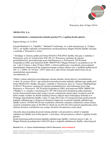 2013 r. do Spółki wpłynęło zawiadomienie od akcjonariusza Magna Polonia Spółka Akcyjna