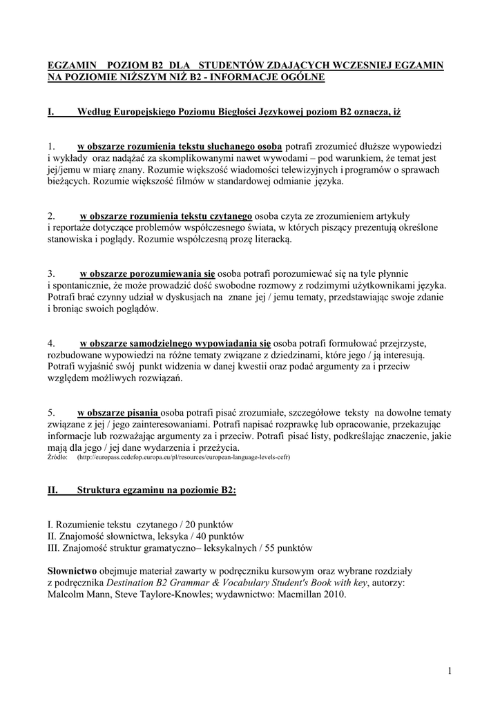EGZAMIN POZIOM B2 DLA STUDENTÓW ZDAJĄCYCH WCZESNIEJ EGZAMIN NA POZIOMIE NIŻSZYM NIŻ B2 - INFORMACJE OGÓLNE I. Według Europejskiego Poziomu Biegłości Językowej poziom B2 oznacza, iż 1. w obszarze rozumienia tekstu słuchanego osoba potrafi zrozumieć dłuższe wypowiedzi i wykłady oraz nadążać za skomplikowanymi nawet wywodami – pod warunkiem, że temat jest jej/jemu w miarę znany. Rozumie większość wiadomości telewizyjnych i programów o sprawach bieżących. Rozumie większość filmów w standardowej odmianie języka. 2. w obszarze rozumienia tekstu czytanego osoba czyta ze zrozumieniem artykuły i reportaże dotyczące problemów współczesnego świata, w których piszący prezentują określone stanowiska i poglądy. Rozumie współczesną prozę literacką. 3. w obszarze porozumiewania się osoba potrafi porozumiewać się na tyle płynnie i spontanicznie, że może prowadzić dość swobodne rozmowy z rodzimymi użytkownikami języka. Potrafi brać czynny udział w dyskusjach na znane jej / jemu tematy, przedstawiając swoje zdanie i broniąc swoich poglądów. 4. w obszarze samodzielnego wypowiadania się osoba potrafi formułować przejrzyste, rozbudowane wypowiedzi na różne tematy związane z dziedzinami, które jego / ją interesują. Potrafi wyjaśnić swój punkt widzenia w danej kwestii oraz podać argumenty za i przeciw względem możliwych rozwiązań. 5. w obszarze pisania osoba potrafi pisać zrozumiałe, szczegółowe teksty na dowolne tematy związane z jej / jego zainteresowaniami. Potrafi napisać rozprawkę lub opracowanie, przekazując informacje lub rozważając argumenty za i przeciw. Potrafi pisać listy, podkreślając znaczenie, jakie mają dla jego / jej dane wydarzenia i przeżycia. Źródło: (http://europass.cedefop.europa.eu/pl/resources/european-language-levels-cefr) II. Struktura egzaminu na poziomie B2: I. Rozumienie tekstu czytanego / 20 punktów II. Znajomość słownictwa, leksyka / 40 punktów III. Znajomość struktur gramatyczno – leksykalnych / 55 punktów Słownictwo obejmuje materiał zawarty w podręczniku kursowym oraz wybrane rozdziały z podręcznika Destination B2 Grammar & Vocabulary Student's Book with key, autorzy: Malcolm Mann, Steve Taylore-Knowles; wydawnictwo: Macmillan 2010. 1 Wybrane rozdziały z podręcznika Destination B2: 1. Travel and transport 2. Health and fitness 3. Food and Drink 4. Work and business 5. Money and shopping Materiał gramatyczny zawarty jest w podręczniku Grammarway 3 Student's Book (with answers), autorzy: Virginia Evans, Jenny Dooley, wydawnictwo: Express Publishing 2006. Zakres materiału gramatycznego: − Czasy teraźniejsze: Present Simple, Present Continuous − Czasy przeszłe: Past Simple i Past Continuous. − Czasy Present Perfect oraz Present Perfect Continuous − Czasy przyszłe: Future Simple, Future Continuous, Future Perfect. − Konstrukcja: be going to. − Czasowniki modalne i ich funkcje oraz zasady użycia − Konstrukcja have something done − Stopniowanie przymiotników − Konstrukacja I wish − Strona bierna − Mowa zależna − Tryby warunkowe (zakres materiału obejmuje I, II oraz III tryb) − Czasowniki w formie gerunds oraz infinitives III. Forma pytań Test egzaminacyjny składa się z pytań o charakterze zamkniętym oraz otwartym. Zadania w formie zamkniętej mogą przyjąć formę: - ćwiczeń tzw. wielokrotnego wyboru - ćwiczeń typu: prawda– fałsz - ćwiczeń polegających na dopasowaniu elementów Zadania w formie otwartej mogą mieć formę: − ćwiczeń z luką do uzupełnienia. 2