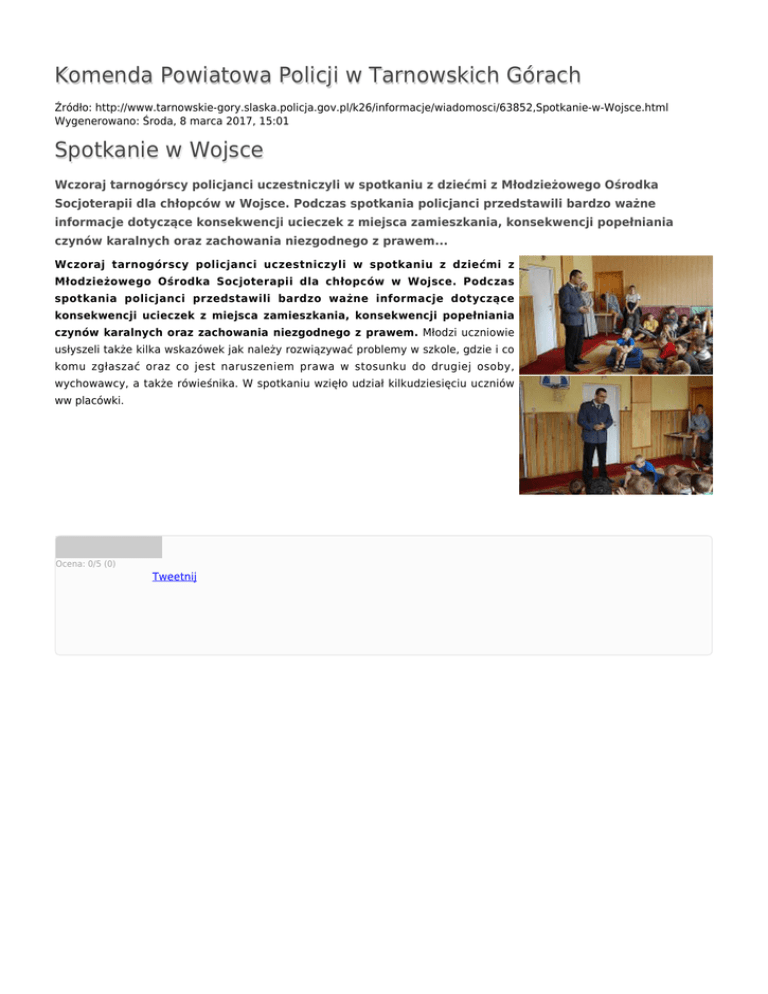 Komenda Powiatowa Policji w Tarnowskich Górach Źródło: http://www.tarnowskie-gory.slaska.policja.gov.pl/k26/informacje/wiadomosci/63852,Spotkanie-w-Wojsce.html Wygenerowano: Środa, 8 marca 2017, 15:01 Spotkanie w Wojsce Wczoraj tarnogórscy policjanci uczestniczyli w spotkaniu z dziećmi z Młodzieżowego Ośrodka Socjoterapii dla chłopców w Wojsce. Podczas spotkania policjanci przedstawili bardzo ważne informacje dotyczące konsekwencji ucieczek z miejsca zamieszkania, konsekwencji popełniania czynów karalnych oraz zachowania niezgodnego z prawem... Wczoraj tarnogórscy policjanci uczestniczyli w spotkaniu z dziećmi z Młodzieżowego Ośrodka Socjoterapii dla chłopców w Wojsce. Podczas spotkania policjanci przedstawili bardzo ważne informacje dotyczące konsekwencji ucieczek z miejsca zamieszkania, konsekwencji popełniania czynów karalnych oraz zachowania niezgodnego z prawem. Młodzi uczniowie usłyszeli także kilka wskazówek jak należy rozwiązywać problemy w szkole, gdzie i co komu zgłaszać oraz co jest naruszeniem prawa w stosunku do drugiej osoby, wychowawcy, a także rówieśnika. W spotkaniu wzięło udział kilkudziesięciu uczniów ww placówki. Ocena: 0/5 (0) Tweetnij