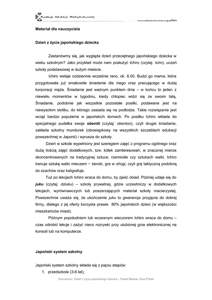 Materiał dla nauczyciela Dzień z życia japońskiego dziecka Zastanówmy się, jak wygląda dzień przeciętnego japońskiego dziecka w wieku szkolnym? Jako przykład może nam posłużyć Ichiro (czytaj: Iciro), uczeń szkoły podstawowej w dużym mieście . Ichiro wstaje codziennie wcześnie rano, ok. 6.00. Budzi go mama, która przygotowała już smakowite śniadanie dla niego oraz pracującego w dużej korporacji męża. Śniadanie jest ważnym punktem dnia – w końcu to jeden z niewielu momentów w tygodniu, kiedy chłopiec widzi się ze swoim tatą. Śniadanie, podobnie jak wszystkie pozostałe posiłki, podawane jest na niewysokim stoliku, do którego zasiada się na podłodze. Takie rozwiązanie jest wciąż bardzo popularne w japońskich domach. Po posiłku Ichiro wkłada do specjalnego pudełka swoje obentō (czytaj: obentoo), czyli drugie śniadanie, zakłada szkolny mundurek (obowiązkowy na wszystkich szczeblach edukacji powszechnej w Japonii) i wyrusza do szkoły. Dzień w szkole wypełniony jest szeregiem zajęć z programu ogólnego oraz dużą ilością zajęć dodatkowych, tzw. kółek zainteresowań, w znacznej mierze skoncentrowanych na tradycyjnej sztuce, rzemiośle czy sztukach walki. Ichiro trenuje sztukę walki mieczem − kendo, gra w shogi, czyli grę taktyczną podobną do szachów oraz kaligrafuje. Tuż po lekcjach Ichiro wraca do domu, by zjeść obiad. Później udaje się do juku (czytaj: dziuku) – szkoły prywatnej, gdzie uczestniczy w dodatkowych lekcjach, wyrównawczych lub poszerzających materiał szkoły macierzystej. Powszechnie uważa się, że ukończenie juku to gwarancja przyjęcia do dobrej firmy, dlatego z jej oferty korzysta prawie 80% japońskich dzieci (w większości mieszkańców miast). Późnym popołudniem lub wczesnym wieczorem Ichiro wraca do domu – czas odrobić lekcje i zażyć nieco rozrywki przy ulubionej grze elektronicznej na konsoli lub na komputerze. Japoński system szkolny Japoński system szkolny składa się z pięciu etapów: 1. przedszkole (3-6 lat), Scenariusz: Dzień z życia japońskiego dziecka – Paweł Błasiak, Ewa Pytlak 2. szkoła podstawowa (6-12 lat), 3. szkoła średnia niższego stopnia (12-15 lat), 4. szkoła średnia wyższego stopnia (15-18 lat), 5. szkoła wyższa. Minisłownik Konnichiwa – Dzień dobry Ohayō gozaimasu – Dzień dobry (bardziej formalne, używane przed godziną 10 rano) Konbanwa – Dobry wieczór Tada ima – powitanie po powrocie do domu Okaeri – powitanie po powrocie do domu do osób starszych Baibai! – Na razie! (między dziećmi) Sayonara – Do widzenia Sumimasen – Przepraszam Gomen nasai – Przepraszam (odpowiednik „Proszę mi wybaczyć”, np. jak kogoś potrącimy) Moshi wake arimasen – Przepraszam (bardzo formalne) Oyasumi nasai – Dobranoc (dosł. „odpoczywaj”) Itadakimas – Smacznego (dosł. „łaskawie jest mi dane”) Gochisōsama. – Dziękuję, było pyszne. (Po posiłku). Arigatō – Dziękuję Dōmo arigatō gozaimasu – Bardzo dziękuję (bardzo formalne) Dōzo – Proszę (np. przy podawaniu kawy) Dōzo yoroshiku – Proszę bardzo Yoroshiku onegai shimasu. – Polecam się pańskiej opiece. (Np. przy przedstawianiu się). Itterasshai – Do widzenia (używane wobec osoby o wyższej pozycji, np. dzieci żegnają tak ojca, który wyrusza do pracy, dosł. „łaskawie idziesz”) Asobo! – Pobawmy się! (między kolegami) Otsukare sama – pozdrowienie używane wobec osób wracających po pracy do domu (dosł. „szanowny, zmęczony pan) Tsumaranai mono. – To nic takiego. (Używane przez osobę wręczającą prezent, dosł. „nudna rzecz”). Ciekawostki na temat japońskiej szkoły Scenariusz: Dzień z życia japońskiego dziecka – Paweł Błasiak, Ewa Pytlak 1. W szkole obowiązuje system starszeństwa (kohai – senpai) – młodsi uczniowie sprzątają po starszych, używają wobec nich zwrotów grzecznościowych itp. Taka sama hierarchia obowiązuje również we wszystkich dziedzinach życia dorosłego Japończyka. 2. Klasy liczą zazwyczaj 40 osób, które podzielone są na zespoły odpowiadające każdorazowo za czystość własnych sal, korytarza oraz toalet. Sprzątanie szkoły bowiem to obowiązek uczniów a nie personelu sprzątającego. 3. Na większości tradycyjnych zajęć dodatkowych obowiązuje system dziesięciu stopni uczniowskich (kyū, czytaj: kiuu) i dziesięciu stopni mistrzowskich (dan) – w miarę postępów w nauce, uczniowie zdobywają kolejne stopnie odzwierciedlające poziom ich umiejętności. Stopnie te mają charakter certyfikatów narodowych, których ilość można zwiększać także po ukończeniu szkoły. 4. Japoński rok szkolny zaczyna się 1 kwietnia i kończy w połowie marca. W międzyczasie są kilkutygodniowe ferie letnie, dwutygodniowe ferie zimowe oraz dwutygodniowe ferie wiosenne, oddzielające miniony i przyszły rok szkolny. 5. Japońskie dzieci na okres wakacji mają zadawaną pracę domową. 6. Lekcje w japońskiej szkole trwają zwykle od 8.30 do 15.30, ale kółka zainteresowań kończą się nawet k. 18.00. 7. Reforma edukacji z 2001 roku zniosła obowiązkowe lekcje w soboty oraz zredukowała ilość materiału szkolnego. 8. Japończycy są mistrzami w rozwiązywaniu testów. Metoda testowa wykorzystywana jest do sprawdzania wiedzy na każdym etapie nauki. Przejście do kolejnej szkoły także wiąże się ze zdaniem egzaminu testowego. 9. Drugie śniadanie, obentō, to istne arcydzieło. Potraw jest dużo, choć w małej ilości, i są pięknie ułożone w specjalnych pojemniczkach. Przestrzegany jest zestaw kolorystyczny: biały, brązowy, zielony, różowy. Całość jest zawinięta w kolorową serwetkę. Do dyspozycji uczniów są również obiady w stołówce szkolnej. 10. Powszechnie obowiązującym strojem szkolnym jest mundurek, nieco inny w różnych regionach Japonii. W szkole podstawowej często wymaga się również, aby dzieci nosiły czapeczki, dzięki którym s