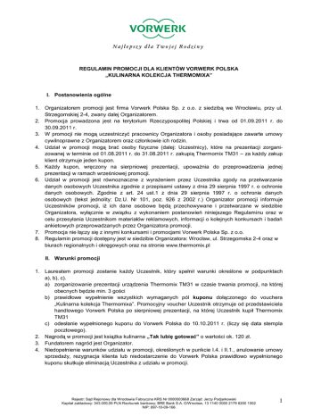 REGULAMIN PROMOCJI DLA KLIENTÓW VORWERK POLSKA „KULINARNA KOLEKCJA THERMOMIXA” I. Postanowienia ogólne 1. Organizatorem promocji jest firma Vorwerk Polska Sp. z o.o. z siedzibą we Wrocławiu, przy ul. Strzegomskiej 2-4, zwany dalej Organizatorem. 2. Promocja prowadzona jest na terytorium Rzeczypospolitej Polskiej i trwa od 01.09.2011 r. do 30.09.2011 r. 3. W promocji nie mogą uczestniczyć pracownicy Organizatora i osoby posiadające zawarte umowy cywilnoprawne z Organizatorem oraz członkowie ich rodzin. 4. Udział w promocji mogą brać osoby fizyczne (dalej: Uczestnicy), które na prezentacji zorganizowanej w terminie od 01.08.2011 r. do 31.08.2011 r. zakupią Thermomix TM31 – za każdy zakup klient otrzymuje jeden kupon. 5. Każdy kupon, wręczony na sierpniowej prezentacji, upoważnia do przeprowadzenia jednej prezentacji w ramach wrześniowej promocji. 6. Udział w promocji jest równoznaczne z wyrażeniem przez Uczestnika zgody na przetwarzanie danych osobowych Uczestnika zgodnie z przepisami ustawy z dnia 29 sierpnia 1997 r. o ochronie danych osobowych. Zgodnie z art. 24 ust.1 z dnia 29 sierpnia 1997 r. o ochronie danych osobowych (tekst jednolity: Dz.U. Nr 101, poz. 926 z 2002 r.) Organizator promocji informuje Uczestników promocji, iż ich dane osobowe będą przechowywane i przetwarzane w siedzibie Organizatora, wyłącznie w związku z wykonaniem postanowień niniejszego Regulaminu oraz w celu przesyłania Uczestnikom materiałów reklamowych, informacji o kolejnych konkursach i badań ankietowych przeprowadzanych przez Organizatora promocji. 7. Promocja nie łączy się z innymi konkursami i promocjami Vorwerk Polska Sp. z o.o. 8. Regulamin promocji dostępny jest w siedzibie Organizatora: Wrocław, ul. Strzegomska 2-4 oraz w biurach regionalnych i okręgowych oraz na stronie www.thermomix.pl II. Warunki promocji 1. Laureatem promocji zostanie każdy Uczestnik, który spełnił warunki określone w podpunktach a), b), c). a) zorganizowanie prezentacji urządzenia Thermomix TM31 w czasie trwania promocji, na której obecnych będzie min. 3 gości b) prawidłowe wypełnienie wszystkich wymaganych pól kuponu dołączonego do vouchera „Kulinarna kolekcja Thermomixa”. Promocyjny voucher Uczestnik otrzymuje od przedstawiciela handlowego Vorwerk Polska po sierpniowej prezentacji, na której Uczestnik kupił Thermomix TM31 c) odesłanie wypełnionego kuponu do Vorwerk Polska do 10.10.2011 r. (liczy się data stempla pocztowego). 2. Nagrodą w promocji jest książka kulinarna „Tak lubię gotować” o wartości ok. 120 zł. 3. Fundatorem nagród jest Organizator. 4. Niedopełnienie warunków udziału w promocji, określonych w punkcie I.4. i II.1., anulowanie umowy sprzedaży, rezygnacja klienta lub niedostarczenie do Vorwerk Polska prawidłowo wypełnionego kuponu skutkuje eliminacją Uczestnika z udziału w promocji. Rejestr: Sąd Rejonowy dla Wrocławia Fabryczna KRS Nr 0000003668 Zarząd: Jerzy Podjarkowski Kapitał zakładowy: 343.000,00 PLN Rachunek bankowy: BRE Bank S.A. O/Wrocław, 13 1140 0000 2179 8200 1002 NIP: 897-10-09-166 1 III. Przekazanie nagród 1. Nagroda, o której mowa w punkcie II.2. zostanie wysłana do Uczestnika przez Vorwerk Polska za pośrednictwem Poczty Polskiej, najpóźniej do 04.11.2011 r. 2. Uczestnik nie ma prawa domagać się wydania w miejsce nagrody jej ekwiwalentu pieniężnego, ani też nie ma prawa do zastrzegania sobie jej szczególnych właściwości. 3. Organizator zastrzega sobie możliwość zmiany nagrody na inną o tej samej wartości pieniężnej. 4. Uczestnik promocji ma możliwość rezygnacji z nagrody. Rezygnację w formie pisemnej należy doręczyć Organizatorowi najpóźniej do 3.10.2011 r. IV. Reklamacje i właściwość sądu 1. Reklamacje mogą być zgłaszane w formie pisemnej bezpośrednio na adres Organizatora promocji w terminie 14 dni od daty zakończenia promocji. 2. Postępowanie reklamacyjne trwa 14 dni. O wyniku postępowania reklamacyjnego Organizator pisemnie powiadamia Uczestnika promocji. 3. Po wyczerpaniu postępowania reklamacyjnego Uczestnikowi przysługuje prawo do dochodzenia nieuwzględnionych roszczeń w sądzie właściwym dla siedziby Organizatora promocji. 4. Uczestnik promocji nie może skutecznie domagać się od Organizatora promocji wydania nagrody, jeżeli upłynęło 30 dni od daty zakończenia promocji, a Uczestnik nie odebrał nagrody w terminie z przyczyn niezależnych od Organizatora promocji. Rejestr: Sąd Rejonowy dla Wrocławia Fabryczna KRS Nr 0000003668 Zarząd: Jerzy Podjarkowski Kapitał zakładowy: 343.000,00 PLN Rachunek bankowy: BRE Bank S.A. O/Wrocław, 13 1140 0000 2179 8200 1002 NIP: 897-10-09-166 2