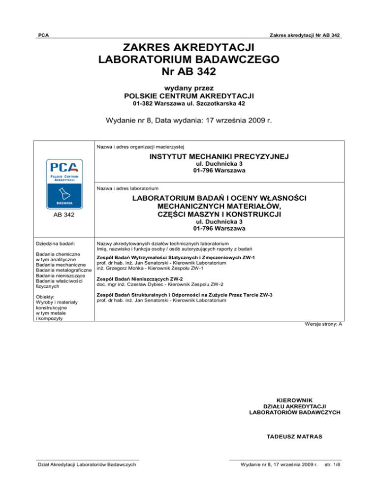 PCA Zakres akredytacji Nr AB 342 ZAKRES AKREDYTACJI LABORATORIUM BADAWCZEGO Nr AB 342 wydany przez POLSKIE CENTRUM AKREDYTACJI 01-382 Warszawa ul. Szczotkarska 42 Wydanie nr 8, Data wydania: 17 września 2009 r. Nazwa i adres organizacji macierzystej INSTYTUT MECHANIKI PRECYZYJNEJ ul. Duchnicka 3 01-796 Warszawa Nazwa i adres laboratorium AB 342 LABORATORIUM BADAŃ I OCENY WŁASNOŚCI MECHANICZNYCH MATERIAŁÓW, CZĘŚCI MASZYN I KONSTRUKCJI ul. Duchnicka 3 01-796 Warszawa Dziedzina badań: Badania chemiczne w tym analityczne Badania mechaniczne Badania metalograficzne Badania nieniszczące Badania właściwości fizycznych Obiekty: Wyroby i materiały konstrukcyjne w tym metale i kompozyty Nazwy akredytowanych działów technicznych laboratorium Imię, nazwisko i funkcja osoby / osób autoryzujących raporty z badań Zespół Badań Wytrzymałości Statycznych i Zmęczeniowych ZW-1 prof. dr hab. inż. Jan Senatorski - Kierownik Laboratorium inż. Grzegorz Mońka - Kierownik Zespołu ZW-1 Zespół Badań Nieniszczących ZW-2 doc. mgr inż. Czesław Dybiec - Kierownik Zespołu ZW-2 Zespół Badań Strukturalnych i Odporności na Zużycie Przez Tarcie ZW-3 prof. dr hab. inż. Jan Senatorski - Kierownik Laboratorium Wersja strony: A KIEROWNIK DZIAŁU AKREDYTACJI LABORATORIÓW BADAWCZYCH TADEUSZ MATRAS Dział Akredytacji Laboratoriów Badawczych Wydanie nr 8, 17 września 2009 r. str. 1/8 PCA Zakres akredytacji Nr AB 342 Zespół Badań Wytrzymałości Statycznych i Zmęczeniowych ZW-1 prof. dr hab. inż. Jan Senatorski inż. Grzegorz Mońka Badane obiekty / Grupa obiektów Stale, metale nieżelazne i ich stopy po różnych obróbkach Stale, metale nieżelazne i ich stopy po różnych obróbkach Stale, metale nieżelazne i ich stopy po różnych obróbkach Stale, metale nieżelazne i ich stopy po różnych obróbkach Drut o 3 mm÷ 10 mm - stal, - metale kolorowe Wyroby hutnicze, bednarki, blachy Badane cechy i metody badawcze Wyznaczona w próbie rozciągania: R0,05, R0,2, E, Re, Rr, Rm , A, Z Re, Rm zakres: 0 kN - 350 kN R0,05, R0,2, ReL, ReH, Rm , A, Z zakres: 0 kN - 100 kN Wyznaczona w próbie zginania: Rg0,2, Rge, E, Rg zakres: 0 kN - 100 kN Rg zakres: 0 kN - 350 kN Wytrzymałość zmęczeniowa w warunkach osiowego rozciąganiaściskania Zrc ( Zr, Zrj, Zc, Zcj) Fmax od 0,12 kN do 1,5 kN, częstotliwość fmax = 450 Hz Wytrzymałość zmęczeniowa w warunkach zginania obrotowego Zgo 6000 obr/min lub 12000 obr/min, max 900 MPa, częstotliwość f = 100Hz Wytrzymałość zmęczeniowa w warunkach zginania płaskiego Zg (Zgw, Zgj) max 30 Nm (moment zmienny), częstotliwość f = 25 Hz Wytrzymałość zmęczeniowa w warunkach skręcania Zs ( Zso, Zsj) max 30 Nm (moment zmienny), f = 25 Hz Twardość sposobem Vickersa obciążenie: 9,807 N - 980,7 N Twardość sposobem Rockwella skala A, B, C Twardość sposobem Brinella obciążenie: 1839 N - 29420 N Udarność w temperaturze pokojowej 50 J; 100 J; 150 J Udarność stali po starzeniu 50 J; 100 J; 150 J Normy i/lub udokumentowane procedury badawcze PN-EN 10002-1:2004 PN-EN ISO 898-1:2009 PN-EN ISO 3506-1:2000 PN-EN 1935:2003/AC:2005 PN-EN 10002-5:1998 PN-EN ISO 7438:2006 PN-74/H-04327 PN-76/H-04326 PN-76/H-04326 PN-76/H-04325 PN-EN ISO 6507-1:2007 PN-EN ISO 6508-1:2007/Ap1:2009 PN-EN ISO 6506-1:2008 PN-EN 10045-1:1994 PN-81/H-04373 PN-EN 10045-1:1994 Technologiczna próba przeginania średnica: 0,3 mm - 10 mm PN-ISO 7801:1996 PN-EN ISO 7438:2006 Tłoczność metodą Erichsena grubość blach: 0,2 mm - 2 mm PN-EN ISO 20482:2004 Wersja strony: A Dział Akredytacji Laboratoriów Badawczych Wydanie nr 8, 17 września 2009 r. str. 2/8 PCA Zakres akredytacji Nr AB 342 Zespół Badań Nieniszczących ZW-2 doc. mgr inż. Czesław Dybiec Badane obiekty / Grupa obiektów Materiały ferromagnetyczne Materiały ferromagnetyczne z warstwami dyfuzyjnymi i utwardzonymi Materiały ferromagnetyczne z powłokami niemetalicznymi o grubości do 1,2 mm Materiały metalowe Badane cechy i metody badawcze Stan naprężeń własnych i wytworzonych Metoda prądów wirowych Nieciągłości powierzchniowe o głębokości do 5 mm. Nieciągłości podpowierzchniowe o głębokości do 2 mm Metoda prądów wirowych Normy i/lub udokumentowane procedury badawcze PB/2-16/LB-4, edycja 3 z 27.06.2005 PB/2-17/ LB-4, edycja 3 z 27.06.2005 Wersja strony: A Dział Akredytacji Laboratoriów Badawczych Wydanie nr 8, 17 września 2009 r. str. 3/8 PCA Zakres akredytacji Nr AB 342 Zespół Badań Strukturalnych i Odporności na Zużycie Przez Tarcie ZW-3 prof. dr hab. inż. Jan Senatorski Badane obiekty / Grupa obiektów Metale i ich stopy Warstwy dyfuzyjne Metalowe powłoki ochronne i techniczne Badane cechy i metody badawcze Odporność na zużycie przy tarciu suchym lub granicznym, w styku liniowym Smarność Prędkość obrotowa 290 obr/min Obciążenie do 23073 N Odporność na zużycie w ustalonym procesie zużycia w styku powierzchniowym lub liniowym, przy tarciu suchym lub granicznym. Współczynnik tarcia Prędkość obrotowa 200 obr/min lub 400 obr/min Obciążenie do 2000 N Odporność na zatarcie w styku powierzchniowym, suchym lub smarowanym Prędkość obrotowa 200 obr/min lub 400 obr/min Obciążenie do 2000 N Odporność na zużycie lub na zatarcie przy tarciu suchym lub granicznym, w 3-punktowym styku skoncentrowanym Prędkość obrotowa: 9,6 s-1, 24 s-1, -1 53,3 s Obciążenie do 1260 N Odporność na zużycie przy styku powierzchniowym płaskim oraz tarciu suchym, bądź tarciu w obecności ośrodka ciekłego czystego albo zawierającego zanieczyszczenia ścierne -1 -1 Prędkość obrotowa: 9,6 s , 24 s , -1 53,3 s Obciążenie do 1260 N Normy i/lub udokumentowane procedury badawcze PN-75/M-04308 (PB/2-18/LB-4, edycja 1 z 15.05.2002) PN-82/H-04332 (PB/2-19/LB-4, edycja 1 z 15.05.2002) PN-88/H-04337 (PB/2-20/LB-4, edycja 1 z 15.05.2002) PN-83/H-04302 (PB/2-21/LB-4, edycja 1 z 15.05.2002) PN-EN 1337-7:2003 (PB/2-22/LB-4, edycja 1 z 15.05.2002) Wersja strony: A Dział Akred