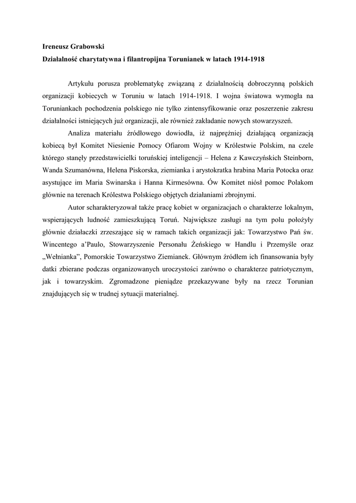 Ireneusz Grabowski Działalność charytatywna i filantropijna Torunianek w latach 1914-1918 Artykułu porusza problematykę związaną z działalnością dobroczynną polskich organizacji kobiecych w Toruniu w latach 1914-1918. I wojna światowa wymogła na Toruniankach pochodzenia polskiego nie tylko zintensyfikowanie oraz poszerzenie zakresu działalności istniejących już organizacji, ale również zakładanie nowych stowarzyszeń. Analiza materiału źródłowego dowiodła, iż najprężniej działającą organizacją kobiecą był Komitet Niesienie Pomocy Ofiarom Wojny w Królestwie Polskim, na czele którego stanęły przedstawicielki toruńskiej inteligencji – Helena z Kawczyńskich Steinborn, Wanda Szumanówna, Helena Piskorska, ziemianka i arystokratka hrabina Maria Potocka oraz asystujące im Maria Swinarska i Hanna Kirmesówna. Ów Komitet niósł pomoc Polakom głównie na terenach Królestwa Polskiego objętych działaniami zbrojnymi. Autor scharakteryzował także pracę kobiet w organizacjach o charakterze lokalnym, wspierających ludność zamieszkującą Toruń. Największe zasługi na tym polu położyły głównie działaczki zrzeszające się w ramach takich organizacji jak: Towarzystwo Pań św. Wincentego a’Paulo, Stowarzyszenie Personału Żeńskiego w Handlu i Przemyśle oraz „Wełnianka”, Pomorskie Towarzystwo Ziemianek. Głównym źródłem ich finansowania były datki zbierane podczas organizowanych uroczystości zarówno o charakterze patriotycznym, jak i towarzyskim. Zgromadzone pieniądze przekazywane były na rzecz Torunian znajdujących się w trudnej sytuacji materialnej.