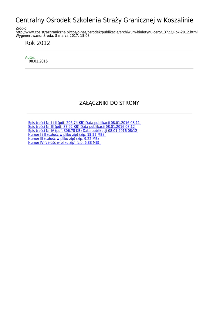 Centralny Ośrodek Szkolenia Straży Granicznej w Koszalinie Źródło: http://www.cos.strazgraniczna.pl/cos/o-nas/osrodek/publikacje/archiwum-biuletynu-osro/13722,Rok-2012.html Wygenerowano: Środa, 8 marca 2017, 15:03 Rok 2012 Autor: 08.01.2016 ZAŁĄCZNIKI DO STRONY Spis treści Nr I i II (pdf, 296.74 KB) Data publikacji 08.01.2016 08:11 Spis treści Nr III (pdf, 87.92 KB) Data publikacji 08.01.2016 08:12 Spis treści Nr IV (pdf, 306.78 KB) Data publikacji 08.01.2016 08:12 Numer I i II (całość w pliku zip) (zip, 15.57 MB) Numer III (całość w pliku zip) (zip, 9.22 MB) Numer IV (całość w pliku zip) (zip, 6.88 MB)