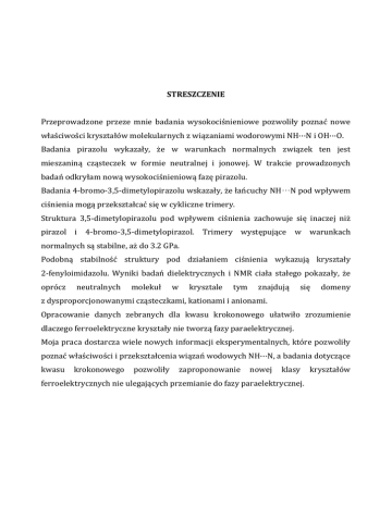 STRESZCZENIE Przeprowadzone przeze mnie badania wysokociśnieniowe pozwoliły poznać nowe właściwości kryształów molekularnych z wiązaniami wodorowymi NH···N i OH···O. Badania pirazolu wykazały, że w warunkach normalnych związek ten jest mieszaniną cząsteczek w formie neutralnej i jonowej. W trakcie prowadzonych badań odkryłam nową wysokociśnieniową fazę pirazolu. Badania 4-bromo-3,5-dimetylopirazolu wskazały, że łańcuchy NH···N pod wpływem ciśnienia mogą przekształcać się w cykliczne trimery. Struktura 3,5-dimetylopirazolu pod wpływem ciśnienia zachowuje się inaczej niż pirazol i 4-bromo-3,5-dimetylopirazol. Trimery występujące w warunkach normalnych są stabilne, aż do 3.2 GPa. Podobną stabilność struktury pod działaniem ciśnienia wykazują kryształy 2-fenyloimidazolu. Wyniki badań dielektrycznych i NMR ciała stałego pokazały, że oprócz neutralnych molekuł w krysztale tym znajdują się domeny z dysproporcjonowanymi cząsteczkami, kationami i anionami. Opracowanie danych zebranych dla kwasu krokonowego ułatwiło zrozumienie dlaczego ferroelektryczne kryształy nie tworzą fazy paraelektrycznej. Moja praca dostarcza wiele nowych informacji eksperymentalnych, które pozwoliły poznać właściwości i przekształcenia wiązań wodowych NH···N, a badania dotyczące kwasu krokonowego pozwoliły zaproponowanie nowej klasy ferroelektrycznych nie ulegających przemianie do fazy paraelektrycznej. kryształów