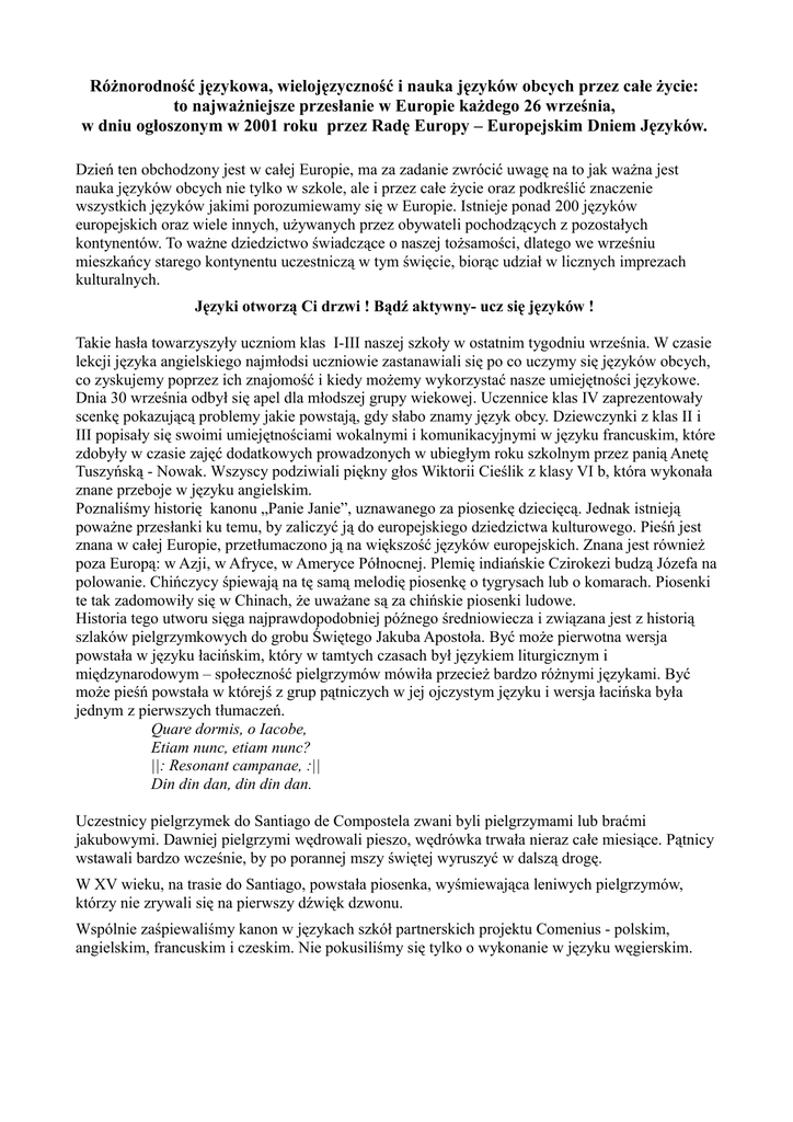 Różnorodność językowa, wielojęzyczność i nauka języków obcych przez całe życie: to najważniejsze przesłanie w Europie każdego 26 września, w dniu ogłoszonym w 2001 roku przez Radę Europy – Europejskim Dniem Języków. Dzień ten obchodzony jest w całej Europie, ma za zadanie zwrócić uwagę na to jak ważna jest nauka języków obcych nie tylko w szkole, ale i przez całe życie oraz podkreślić znaczenie wszystkich języków jakimi porozumiewamy się w Europie. Istnieje ponad 200 języków europejskich oraz wiele innych, używanych przez obywateli pochodzących z pozostałych kontynentów. To ważne dziedzictwo świadczące o naszej tożsamości, dlatego we wrześniu mieszkańcy starego kontynentu uczestniczą w tym święcie, biorąc udział w licznych imprezach kulturalnych. Języki otworzą Ci drzwi ! Bądź aktywny- ucz się języków ! Takie hasła towarzyszyły uczniom klas I-III naszej szkoły w ostatnim tygodniu września. W czasie lekcji języka angielskiego najmłodsi uczniowie zastanawiali się po co uczymy się języków obcych, co zyskujemy poprzez ich znajomość i kiedy możemy wykorzystać nasze umiejętności językowe. Dnia 30 września odbył się apel dla młodszej grupy wiekowej. Uczennice klas IV zaprezentowały scenkę pokazującą problemy jakie powstają, gdy słabo znamy język obcy. Dziewczynki z klas II i III popisały się swoimi umiejętnościami wokalnymi i komunikacyjnymi w języku francuskim, które zdobyły w czasie zajęć dodatkowych prowadzonych w ubiegłym roku szkolnym przez panią Anetę Tuszyńską - Nowak. Wszyscy podziwiali piękny głos Wiktorii Cieślik z klasy VI b, która wykonała znane przeboje w języku angielskim. Poznaliśmy historię kanonu „Panie Janie”, uznawanego za piosenkę dziecięcą. Jednak istnieją poważne przesłanki ku temu, by zaliczyć ją do europejskiego dziedzictwa kulturowego. Pieśń jest znana w całej Europie, przetłumaczono ją na większość języków europejskich. Znana jest również poza Europą: w Azji, w Afryce, w Ameryce Północnej. Plemię indiańskie Czirokezi budzą Józefa na polowanie. Chińczycy śpiewają na tę samą melodię piosenkę o tygrysach lub o komarach. Piosenki te tak zadomowiły się w Chinach, że uważane są za chińskie piosenki ludowe. Historia tego utworu sięga najprawdopodobniej późnego średniowiecza i związana jest z historią szlaków pielgrzymkowych do grobu Świętego Jakuba Apostoła. Być może pierwotna wersja powstała w języku łacińskim, który w tamtych czasach był językiem liturgicznym i międzynarodowym – społeczność pielgrzymów mówiła przecież bardzo różnymi językami. Być może pieśń powstała w którejś z grup pątniczych w jej ojczystym języku i wersja łacińska była jednym z pierwszych tłumaczeń. Quare dormis, o Iacobe, Etiam nunc, etiam nunc? ||: Resonant campanae, :|| Din din dan, din din dan. Uczestnicy pielgrzymek do Santiago de Compostela zwani byli pielgrzymami lub braćmi jakubowymi. Dawniej pielgrzymi wędrowali pieszo, wędrówka trwała nieraz całe miesiące. Pątnicy wstawali bardzo wcześnie, by po porannej mszy świętej wyruszyć w dalszą drogę. W XV wieku, na trasie do Santiago, powstała piosenka, wyśmiewająca leniwych pielgrzymów, którzy nie zrywali się na pierwszy dźwięk dzwonu. Wspólnie zaśpiewaliśmy kanon w językach szkół partnerskich projektu Comenius - polskim, angielskim, francuskim i czeskim. Nie pokusiliśmy się tylko o wykonanie w języku węgierskim. Panie Janie! Panie Janie! Rano wstań! Rano wstań! |: Wszystkie dźwony biją :| Bim, bam, bum, bim, bam, bum Are you sleeping, are you sleeping, Brother John, brother John, |: Morning Bells are ringing, :| Ding ding dong, ding ding dong. Frère Jacques, Frère Jacques Dormez-vous, dormez-vous? |: Sonnez les matines, :| Ding ding dong, ding ding dong. Bratře Kubo, Bratře Kubo, Ještě spíš, ještě spíš ? Venku slunce zárí, ty jsi na polštáři, vstávej již, vstávej již. János bácsi, János bácsi Keljen fel, keljen fel |: Szólnak a harangok :| Bim, bam, bom, bim, bam, bom Apel przygotowały uczennice z koła językowego dla klas II-III i Klubu Naturopea Comenius (kl.IV-VI) pod kierunkiem p. Renaty Adamczuk. Dziękujemy za pomoc paniom Izabeli DukBochnak i Anecie Nowak – Tuszyńskiej (prezentacje w języku francuskim) oraz panu Leszkowi Tarucowi, dzięki niemu w czasie przerw międzylekcyjnych słuchaliśmy przebojów z Wielkiej Brytanii, Czech, Węgier, Francji i Polski. Renata Adamczuk