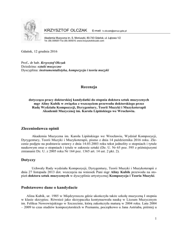 KRZYSZTOF OLCZAK E-mail: [email protected] Akademia Muzyczna im. S. Moniuszki, 80-743 Gdańsk, ul. Łąkowa 1/2 Tel. (58) 3009201 Fax (58) 3009210, www.krzysztofolczak.com Gdańsk, 12 grudnia 2016 Prof.. dr hab. Krzysztof Olczak Dziedzina: sztuki muzyczne Dyscyplina: instrumentalistyka, kompozycja i teoria muzyki Recenzja dotycząca pracy doktorskiej kandydatki do stopnia doktora sztuk muzycznych mgr Aliny Kubik w związku z wszczęciem przewodu doktorskiego przez Radę Wydziału Kompozycji, Dyrygentury, Teorii Muzyki i Muzykoterapii Akademii Muzycznej im. Karola Lipińskiego we Wrocławiu. Zleceniodawca opinii Akademia Muzyczna im. Karola Lipińskiego we Wrocławiu, Wydział Kompozycji, Dyrygentury, Teorii Muzyki i Muzykoterapii, pismo z dnia 14 października 2016 roku. Zlecenie podjęte na podstawie ustawy z dnia 14.03.2003 roku tekst jednolity o stopniach i tytule naukowym oraz o stopniach i tytule w zakresie sztuki (Dz. U. Nr 65 poz. 595 z późniejszymi zmianami Dz. U. z 2005 roku Nr 164 poz. 1365 art. 14 ust. 2 pkt. 2). Dotyczy Uchwały Rady wydziału Kompozycji, Dyrygentury, Teorii Muzyki i Muzykoterapii z dnia 27 listopada 2013 dot. wszczęcia na wniosek Pani mgr Aliny Kubik przewodu na stopień doktora sztuk muzycznych w dyscyplinie artystycznej Kompozycja i Teoria Muzyki. Podstawowe dane o kandydacie Alina Kubik, ur. 1985 w Międzyrzeczu gdzie ukończyła także szkołę muzyczną I stopnia w klasie skrzypiec. Również jako skrzypaczka kontynuowała naukę w Liceum Muzycznym im. Feliksa Nowowiejskiego w Szczecinie, którą zakończyła maturą w 2004 roku. Lata 2004 – 2009 to czas studiów kompozytorskich w Poznaniu, początkowo u Jana Astriaba, później u 1 Moniki Kędziory i Grażyny Pstrokońskiej-Nawratil. Po uzyskaniu dyplomu (2009) kontynuowała studia muzyczne na kierunku dyrygentura, specjalność dyrygentura symfoniczna w klasie Marcina Sompolińskiego (dyplom 2012). Od 2012 roku zatrudniona w poznańskiej Akademii Muzycznej. Prowadzi zajęcia związane z kompozycją (improwizacja, kontrapunkt, instrumentacja). Poza uczelnią uczy gry na skrzypcach i fortepianie, prowadzi również zajęcia umuzykalniające dla małych dzieci. W 2010 roku Kandydatka wybrana została na członka zarządu Koła Młodych Związku Kompozytorów Polskich, obecnie sprawując funkcję zastępcy przewodniczącego Koła Młodych ZKP. Występuje również jako instrumentalistka i wokalistka wykonując repertuar solowy i kameralny, w tym muzykę nową. Poprzez uczestnictwo w koncertach stara się obserwować polską i światową muzykę współczesną. Jak pisze w życiorysie – prawykonania własnych utworów są dla niej nieustanną lekcją kompozycji i stanowią ważną część inspiracji do własnych działań twórczych. Ocena działalności artystycznej i naukowej Dokumentacja do postępowania w sprawie przewodu doktorskiego została sporządzona w sposób rzetelny. Opatrzona jest szczegółowym spisem treści. Część pierwsza (oprócz standardowych informacji) zawiera trzy opinie: prof. Lidii Zielińskiej, prof. Antoniego Grefa i prof. Janusza Stalmierskiego, które stawiają sylwetkę Kandydatki w bardzo pozytywnym świetle. Część druga zawiera szczegółowe informacje dot. dokonań artystycznych Kandydatki. Chyba tylko przez przypadek zabrakło wykazu kompozycji. Ostatecznie jednak, po zapoznaniu się z listą utworów skomponowanych w okresie 2004 – 2016 stwierdzam, że jest to twórczość bogata i niezwykle różnorodna. Obejmuje 46 dzieł: orkiestrowych, kameralnych solowych, wokalno-instrumentalnych, chóralnych, elektroakustycznych i in. Spośród wymienionych w dokumentacji wykonań należy podkreślić: wykonanie kompozycji Urranium na taśmę w Kunsthaus Graz w Austrii, utworu symfonicznego Trzecia łza Wenus w Filharmonii Sudeckiej w Wałbrzychu, opery dziecięcej Magiczne kredki w Domu Kultury w Poznaniu, sztuki dźwiękowej w 3 aktach Dialogi w Centrum Kultury Zamek w Poznaniu, Perswazje na wiolonczelę i perkusję podczas koncertu finałowego 53 Konkursu Młodych Kompozytorów im. T. Bairda w Warszawie oraz Odgłosy nocy na kwartet smyczkowy i publiczność w Filharmonii Świętokrzyskiej w Kielcach. Za swoje kompozycje Kandydatka otrzymała również szereg nagród i wyróżnień: jako finalistka 53 Konkursu Młodych Kompozytorów im T. Bairda za Perswazje na wiolonczelę i perkusję, wyróżnienie przyznane Przez Centrum Sztuki Dziecka w Poznaniu za projekt Tutu oraz projekt Kulululu dla dzieci przedszkolnych, Nagroda Artystyczna Rektora Akademii Sztuk Pięknych w Poznaniu za performance Kobieta uskrzypcona, III nagroda w Konkursie Wrocławskiej Opery Kameralnej za operę dla dzieci Magiczne kredki. Godnym podkreślenia jest również fakt, iż Kandydatka występuje jako wykonawca. Dokumentacja odnotowuje szereg koncertów w których Alina Kubik wzięła udział jako skrzypaczka, wokalistka i dyrygentka. Współpracowała także jako skrzypaczka z Teatrem Wielkim w Poznaniu w jednym projekcie. Bacznie obserwowała a przygotowania do wielu innych premier - od baroku do współczesności, co było dla kompozytorki, jak pisze, istotną inspiracją. Nie bez przyczyny więc tematyka pracy doktorskiej skupia się na operze. W ramach działalności naukowej Kandydatka opublikowała w 16 numerze magazynu Glissando artykuł u otworze 1+1=1 Pierluigiego Bielone. Wygłosiła również referaty: Polska muzyka barokowa w świetle muzycznej retoryki na Ogólnopolskiej Sesji NaukowoWykonawczej w Poznaniu oraz Wykwintne osobowości zdradliwych spojrzeń w romansie 2 tradycji ze współczesnością na konferencji naukowej Opera wobec współczesności. Inspiracje – kierunki – pogranicza w Instytucie Muzykologii Uniwersytetu Jagiellońskiego. W podsumowaniu pragnę podkreślić, iż dorobek kompozytorski Kandydatki oceniam jako duży i znaczący. O jego różnorodności świadczą nie tylko dzieła orkiestrowe, kameralne, solowe, wokalno-instrumentalne, chóralne ale także