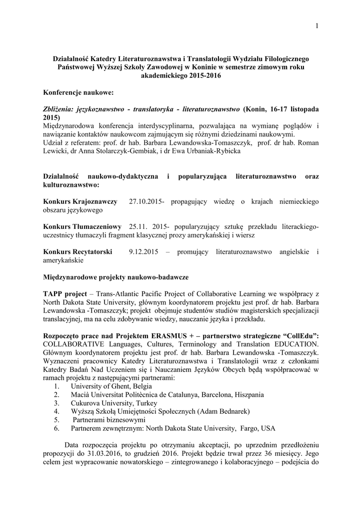 1 Działalność Katedry Literaturoznawstwa i Translatologii Wydziału Filologicznego Państwowej Wyższej Szkoły Zawodowej w Koninie w semestrze zimowym roku akademickiego 2015-2016 Konferencje naukowe: Zbliżenia: językoznawstwo - translatoryka - literaturoznawstwo (Konin, 16-17 listopada 2015) Międzynarodowa konferencja interdyscyplinarna, pozwalająca na wymianę poglądów i nawiązanie kontaktów naukowcom zajmującym się różnymi dziedzinami naukowymi. Udział z referatem: prof. dr hab. Barbara Lewandowska-Tomaszczyk, prof. dr hab. Roman Lewicki, dr Anna Stolarczyk-Gembiak, i dr Ewa Urbaniak-Rybicka Działalność naukowo-dydaktyczna kulturoznawstwo: Konkurs Krajoznawczy obszaru językowego i popularyzująca literaturoznawstwo oraz 27.10.2015- propagujący wiedzę o krajach niemieckiego Konkurs Tłumaczeniowy 25.11. 2015- popularyzujący sztukę przekładu literackiegouczestnicy tłumaczyli fragment klasycznej prozy amerykańskiej i wiersz Konkurs Recytatorski amerykańskie 9.12.2015 – promujący literaturoznawstwo angielskie i Międzynarodowe projekty naukowo-badawcze TAPP project – Trans-Atlantic Pacific Project of Collaborative Learning we współpracy z North Dakota State University, głównym koordynatorem projektu jest prof. dr hab. Barbara Lewandowska -Tomaszczyk; projekt obejmuje studentów studiów magisterskich specjalizacji translacyjnej, ma na celu zdobywanie wiedzy, nauczanie języka i przekładu. Rozpoczęto prace nad Projektem ERASMUS + – partnerstwo strategiczne “CollEdu”: COLLABORATIVE Languages, Cultures, Terminology and Translation EDUCATION. Głównym koordynatorem projektu jest prof. dr hab. Barbara Lewandowska -Tomaszczyk. Wyznaczeni pracownicy Katedry Literaturoznawstwa i Translatologii wraz z członkami Katedry Badań Nad Uczeniem się i Nauczaniem Języków Obcych będą współpracować w ramach projektu z następującymi partnerami: 1. University of Ghent, Belgia 2. Macià Universitat Politècnica de Catalunya, Barcelona, Hiszpania 3. Cukurova University, Turkey 4. Wyższą Szkołą Umiejętności Społecznych (Adam Bednarek) 5. Partnerami biznesowymi 6. Partnerem zewnętrznym: North Dakota State University, Fargo, USA Data rozpoczęcia projektu po otrzymaniu akceptacji, po uprzednim przedłożeniu propozycji do 31.03.2016, to grudzień 2016. Projekt będzie trwał przez 36 miesięcy. Jego celem jest wypracowanie nowatorskiego – zintegrowanego i kolaboracyjnego – podejścia do 2 (inter)kulturowej i językowej edukacji, a także uwrażliwienie studentów na wybrane problemy oraz zagadnienia kulturowo-historyczne regionu i świata. Projekt ma zaowocować wsparciem studentów w akwizycji rozmaitych kompetencji przygotowując ich do wkroczenia na Europejski i światowy rynek pracy. Działalność Kół Naukowych Koło Naukowe Anglistów Cooltura • udział w projekcie kulturoznawczym London National Theatre Live Koło Naukowe Germanistów • Konkurs krajoznawczy dla uczniów szkół ponadgimnazjalnych - 25.10.2015 • Wycieczka krajoznawcza dla Berlina - 11.12.2015 • Spotkanie z tłumaczem symultanicznym z Parlamentu Europejskiego - 18.12.2015 Wydarzenia planowane w semestrze letnim roku akademickiego 2015-2016 w Katedrze Literaturoznawstwa i Translatologii Wydziału Filologicznego Państwowej Wyższej Szkoły Zawodowej w Koninie Konferencje naukowo-dydaktyczne: IV Anglosaskie Spotkania z Kulturą 06.04.2016 – konferencja dla studentów I i II stopnia popularnonaukowa z zakresu literaturoznawstwa i kulturoznawstwa, referaty dr hab. Dagmary Drewniak z Wydziału Anglistyki UAM w Poznaniu i dr hab. Pawła Zająca z Wydziału Teologicznego UAM w Poznaniu, a także dr Ewy Urbaniak-Rybickiej z Katedry Literaturoznawstwa i Translatologii PWSZ w Koninie Kompetencje współczesnego tłumacza 30.05.2016 - otwarte spotkanie panelowe z udziałem specjalistów z zakresu translatologii z Państwowej Wyższej Szkoły Zawodowej w Koninie i Uniwersytetu Łódzkiego mające na celu zapoznanie studentów I i II stopnia z wybranymi elementami teorii i praktyki przekładu Działalność Kół Naukowych Koło Naukowe Anglistów Cooltura • Współpraca przy IV Anglosaskich Spotkaniach z Kulturą • cykliczne prelekcje studentów dotyczące ich projektów dyplomowych z zakresu literaturoznawstwa i kulturoznawstwa (drugi semestr roku akademickiego 2015/16) • spotkanie z mgr Joanną Wilk certyfikowanym nauczycielem języka angielskiego w International School of English w Birmie – kwiecień 2016 • spotkanie z tłumaczem literatury pięknej dr Krzysztofem Majerem - maj 2016 Koło Naukowe Germanistów • Niemieckie spotkania z kulturą - 17.03.2016 • Spotkanie z tłumaczką literatury pięknej - marzec 2016 • Wycieczka krajoznawcza do Drezna - kwiecień 201