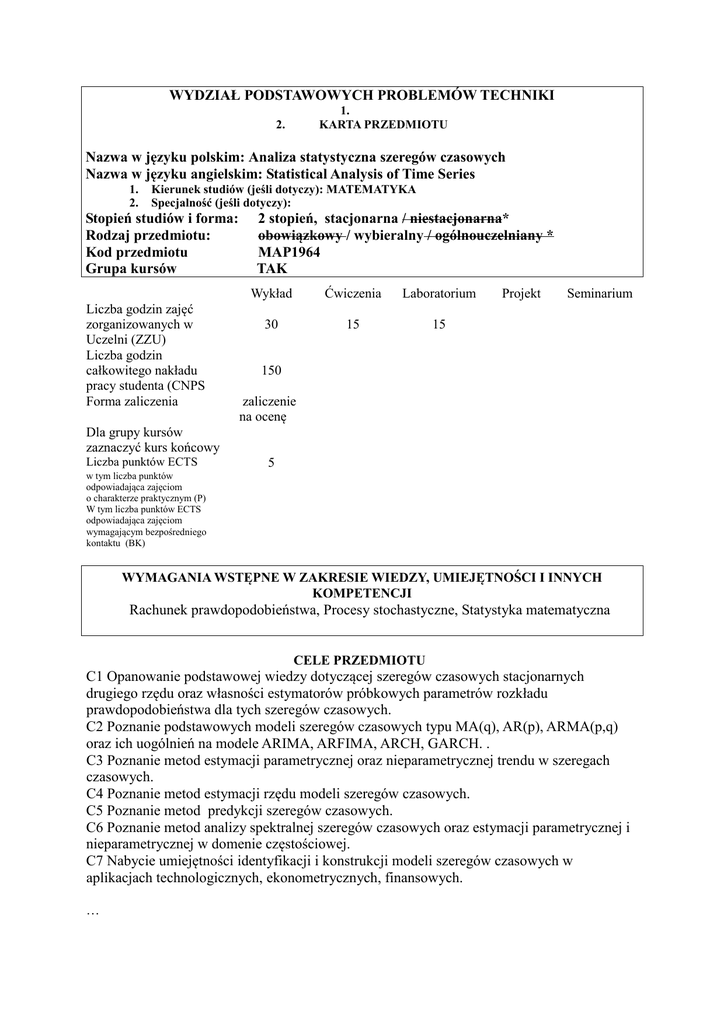 WYDZIAŁ PODSTAWOWYCH PROBLEMÓW TECHNIKI 1. KARTA PRZEDMIOTU 2. Nazwa w języku polskim: Analiza statystyczna szeregów czasowych Nazwa w języku angielskim: Statistical Analysis of Time Series 1. 2. Kierunek studiów (jeśli dotyczy): MATEMATYKA Specjalność (jeśli dotyczy): Stopień studiów i forma: Rodzaj przedmiotu: Kod przedmiotu Grupa kursów Liczba godzin zajęć zorganizowanych w Uczelni (ZZU) Liczba godzin całkowitego nakładu pracy studenta (CNPS Forma zaliczenia 2 stopień, stacjonarna / niestacjonarna* obowiązkowy / wybieralny / ogólnouczelniany * MAP1964 TAK Wykład Ćwiczenia Laboratorium 30 15 15 Projekt Seminarium 150 zaliczenie na ocenę Dla grupy kursów zaznaczyć kurs końcowy Liczba punktów ECTS 5 w tym liczba punktów odpowiadająca zajęciom o charakterze praktycznym (P) W tym liczba punktów ECTS odpowiadająca zajęciom wymagającym bezpośredniego kontaktu (BK) WYMAGANIA WSTĘPNE W ZAKRESIE WIEDZY, UMIEJĘTNOŚCI I INNYCH KOMPETENCJI Rachunek prawdopodobieństwa, Procesy stochastyczne, Statystyka matematyczna CELE PRZEDMIOTU C1 Opanowanie podstawowej wiedzy dotyczącej szeregów czasowych stacjonarnych drugiego rzędu oraz własności estymatorów próbkowych parametrów rozkładu prawdopodobieństwa dla tych szeregów czasowych. C2 Poznanie podstawowych modeli szeregów czasowych typu MA(q), AR(p), ARMA(p,q) oraz ich uogólnień na modele ARIMA, ARFIMA, ARCH, GARCH. . C3 Poznanie metod estymacji parametrycznej oraz nieparametrycznej trendu w szeregach czasowych. C4 Poznanie metod estymacji rzędu modeli szeregów czasowych. C5 Poznanie metod predykcji szeregów czasowych. C6 Poznanie metod analizy spektralnej szeregów czasowych oraz estymacji parametrycznej i nieparametrycznej w domenie częstościowej. C7 Nabycie umiejętności identyfikacji i konstrukcji modeli szeregów czasowych w aplikacjach technologicznych, ekonometrycznych, finansowych. … 1. PRZEDMIOTOWE EFEKTY KSZTAŁCENIA Z zakresu wiedzy student: PE_W01 ma podstawową wiedzę dotyczącą szeregów czasowych stacjonarnych drugiego rzędu oraz własności estymatorów próbkowych parametrów rozkładu prawdopodobieństwa dla tych szeregów czasowych PE_W02 zna podstawowe modele szeregów czasowych typu MA(q), AR(p), ARMA(p,q) oraz ich uogólnienia na modele ARIMA, ARFIMA, ARCH, GARCH PEK_W03 zna metody estymacji parametrycznej oraz nieparametrycznej trendu w szeregach czasowych PEK_W04 zna metody estymacji rzędu modeli szeregów czasowych PEK_W05 zna metody predykcji szeregów czasowych PEK_W06 zna metody analizy spektralnej szeregów czasowych oraz estymacji parametrycznej i nieparametrycznej w domenie częstościowej PEK_W07 zna metody identyfikacji modeli szeregów czasowych … Z zakresu umiejętności: PE_U01 potrafi przeprowadzić identyfikację modeli szeregów czasowych PE_U02 potrafi przeprowadzić procedurę estymacji rzędu modelu oraz parametrów modelu szeregu czasowego wraz z weryfikacją hipotez statystycznych oraz estymacją nieparametryczną odnośnie postaci modelu szeregu czasowego PEK_U03 potrafi przeprowadzić analizę symulacyjną związaną z estymacją, weryfikacją hipotez, identyfikacją i doborem modelu szeregu czasowego PEK_U04 potrafi uzasadnić własności stosowanych procedur statystycznych oraz dobranych modeli szeregów czasowych … Z zakresu kompetencji społecznych: PE_K01 potrafi korzystać z literatury naukowej, w tym docierać do materiałów źródłowych oraz dokonywać ich przeglądu PE_K02 potrafi poprawnie referować i przedstawiać rezultaty rozwiązywanych problemów. PEK_K03 rozumie konieczność systematycznej i samodzielnej pracy nad opanowaniem materiału kursu TREŚCI PROGRAMOWE 2. Forma zajęć – wykłady Definicja szeregu czasowego. Przykłady szeregów czasowych. Szeregi czasowe ściśle stacjonarne. Szeregi czasowe stacjonarne drugiego rzędu. Średnia próbkowa, wariancja próbkowa, autokowariancja Wy1 próbkowa, autokorelacja próbkowa. Sformułowanie własności zdefiniowanych estymatorów. Opis testów weryfikujących hipotezę, że szereg czasowy jest białym szumem. Asymptotyczna wariancja średniej próbkowej oraz rozkład asymptotyczny średniej próbkowej szeregu stacjonarnego drugiego Wy2 rzędu. Rozklad asymptotyczny autokorelacji próbkowej. Zastosowanie do konstrukcji asymptotycznych przedziałów ufności. Transformacja Boxa-Coxa. Metody estymacji i eliminacji trendu wielomianowego oraz trendu okresowego z zastosowaniem Wy3 operatorów różnicowania.Estymacja trendu będącego liniową kombinacją funkcji bazowych - model liniowy. Metody wygladzania w estymacji trendu. Nieparametryczna , jądrowa estymacja trendu. Filtr liniowy, czasowo-niezmienniczy. Funkcja transmitancji filtru Wy4 liniowego. Filtr rekursywny. Modele AR(p), MA(q), ARMA(p,q) szeregów czasowych. Własności modelu MA(q) szeregu czasowego. Model AR(p) szeregu Wy5 czasowego jako rozwiązanie niejednorodnego liniowego równania różnicowego. Równania Yule-Walkera. Estymatory Yule-Walkera parametrów Wy6 modelu AR(p) . Stacjonarność szeregu czasowego z modelu ARMA(p,q). Warunki Wy7 przyczynowości i odwracalności modelu ARMA(p,q). Funkcja częściowej autokorelacji (PACF) szeregu czasowego i jej Wy8 własności. Związek PACF z liniowwym średniokwadratowym predyktorem. Estymacja PACF. Liniowa średniokwadratowa predykcja szeregow czasowych, Wy9 stacjonarnych drugiego rzędu. Algorytm Durbina-Levinsona. Algorytm innowacji. Wy10 Estymacja rzędu modelu autoregresji. Metoda FPE. Metody estymacji wstępnej dla modelu ARMA(p,q). Algorytm Wy11 Hannana-Rissanena. Wy12 Metody doboru rzędu modelu dla modeli ARMA. Metoda Akaike, 2 2 2 2 2 2 2 2 2 2 2 2 BIC. Estymacja metodą najmniejszych kwadratów dla modeli ARMA. Estymacja metodą największej wiarogodności dla modeli ARMA. Estymacja w domenie częstościowej. Periodogram. Własności asymptotyczne periodogramu.Zastosowanie periodogramu do Wy13 weryfikacji hipotezy o okresowości trendu. Nieparametryczne 