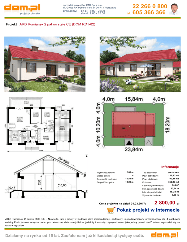 22 266 0 800 tel. 605 366 366 sprzedaż projektów: IMO Sp. z o.o., ul. Grupy AK Północ 4 lok. 9, 00-713 Warszawa pracujemy: pn-pt 8:00 - 20:00 sb-nd 9:00 - 15:00 Projekt ARD Rumianek 2 paliwo stałe CE (DOM RD1-82) Informacje 2,80 m Wysokość parteru: 4 Liczba pokoi: Typ zabudowy: parterowy Pow. zabudowy: 156,50 m2 Szerokość budynku: 15,84 m Pow. użytkowa: Długość budynku: 10,20 m Kubatura: 90,41 m2 350,90 m3 Kąt nachylenia dachu: 30,00 0 Min. szerokość działki: 23,84 m Min. długość działki: 18,20 m Wysokość budynku: 7,03 m Cena projektu na dzień 01.03.2017: 2 800,00 zł Pokaż projekt w internecie ARD Rumianek 2 paliwo stałe CE - Niewielki, tani i prosty w budowie dom jednorodzinny, parterowy, niepodpiwniczony przeznaczony dla 4 osobowej rodziny.Funkcjonalne wnętrze domu podzielono na dwie strefy.Salon, jadalnię i kuchnię zaprojektowano jako jedną przestrzeń.Z salonu wychodzi się na taras w ogrodzie. Działamy na rynku od 15 lat. Zaufało nam już kilkadziesiąt tysięcy osób.