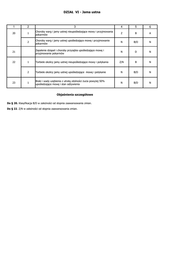 DZIAŁ VI - Jama ustna 1 2 3 4 5 6 20 1 Choroby warg i jamy ustnej nieupośledzające mowy i przyjmowania pokarmów Z B A 2 Choroby warg i jamy ustnej upośledzające mowę i przyjmowanie pokarmów N B/D N Zapalenie dziąseł i choroby przyzębia upośledzające mowę i przyjmowanie pokarmów N D N Z/N B N 21 22 23 1 Torbiele okolicy jamy ustnej nieupośledzające mowy i połykania 2 Torbiele okolicy jamy ustnej upośledzające mowę i połykanie N B/D N 1 Braki i wady uzębienia z utratą zdolności żucia powyżej 50% upośledzające mowę i stan odżywienia N B/D N Objaśnienia szczegółowe Do § 20. Klasyfikacja B/D w zależności od stopnia zaawansowania zmian. Do § 22. Z/N w zależności od stopnia zaawansowania zmian.