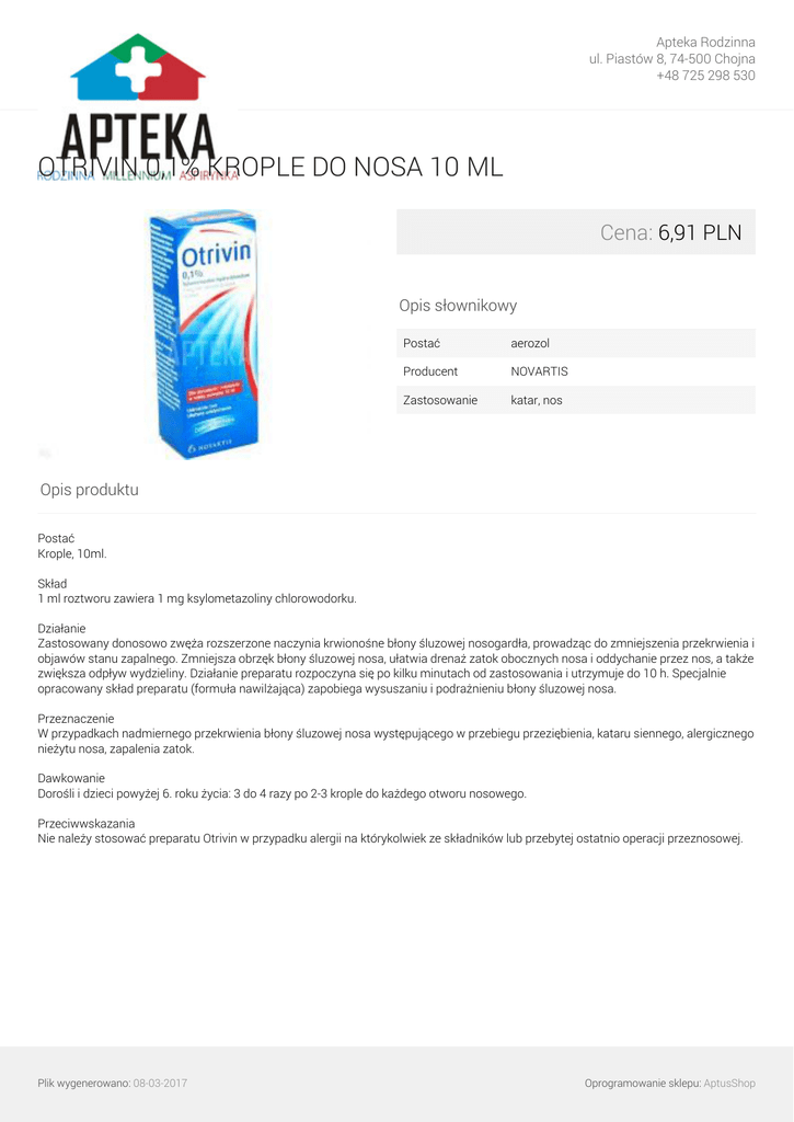 Apteka Rodzinna ul. Piastów 8, 74-500 Chojna +48 725 298 530 OTRIVIN 0,1% KROPLE DO NOSA 10 ML Cena: 6,91 PLN Opis słownikowy Postać aerozol Producent NOVARTIS Zastosowanie katar, nos Opis produktu Postać Krople, 10ml. Skład 1 ml roztworu zawiera 1 mg ksylometazoliny chlorowodorku. Działanie Zastosowany donosowo zwęża rozszerzone naczynia krwionośne błony śluzowej nosogardła, prowadząc do zmniejszenia przekrwienia i objawów stanu zapalnego. Zmniejsza obrzęk błony śluzowej nosa, ułatwia drenaż zatok obocznych nosa i oddychanie przez nos, a także zwiększa odpływ wydzieliny. Działanie preparatu rozpoczyna się po kilku minutach od zastosowania i utrzymuje do 10 h. Specjalnie opracowany skład preparatu (formuła nawilżająca) zapobiega wysuszaniu i podrażnieniu błony śluzowej nosa. Przeznaczenie W przypadkach nadmiernego przekrwienia błony śluzowej nosa występującego w przebiegu przeziębienia, kataru siennego, alergicznego nieżytu nosa, zapalenia zatok. Dawkowanie Dorośli i dzieci powyżej 6. roku życia: 3 do 4 razy po 2-3 krople do każdego otworu nosowego. Przeciwwskazania Nie należy stosować preparatu Otrivin w przypadku alergii na którykolwiek ze składników lub przebytej ostatnio operacji przeznosowej. Plik wygenerowano: 08-03-2017 Powered by TCPDF (www.tcpdf.org) Oprogramowanie sklepu: AptusShop
