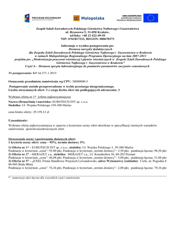Zespół Szkół Zawodowych Polskiego Górnictwa Naftowego i Gazownictwa ul. Brzozowa 5, 31-050 Kraków, tel/faks: +48 12 422-49-55 NIP: 6761817232, REGON: 000670373 Informuje o wyniku postępowania pn: Dostawa narzędzi dydaktycznych dla Zespołu Szkół Zawodowych Polskiego Górnictwa Naftowego i Gazownictwa w Krakowie w ramach Małopolskiego Regionalnego Programu Operacyjnego na lata 2007-2013 projektu pn: „Modernizacja pracowni wiertniczej i płynów wiertnicznych w Zespole Szkół Zawodowych Polskiego Górnictwa Naftowego i Gazownictwa w Krakowie” Część 6 - Dostawa sprzętu laboratoryjnego do pomiarów parametrów zaczynów cementowych Nr postępowania: KP.AI.271.1.2015 Oznaczenie przedmiotu zamówienia wg CPV: 38000000-5 Postępowanie zostało przeprowadzone w trybie przetargu nieograniczonego. Liczba otrzymanych ofert: 3 z czego liczba ofert nie podlegających odrzuceniu: 3 Wybrano ofertę nr 1* (oferta najkorzystniejsza) Nazwa (firma)/imię i nazwisko: EUROTECH INT sp. z o.o. Siedziba: Ul. Wojska Polskiego 339-300 Mielec cena brutto oferty: 29.159,12 zł Uzasadnienie: Wybrano ofertę najkorzystniejszą w oparciu o kryterium oceny ofert określone w specyfikacji istotnych warunków zamówienia spośród nieodrzuconych ofert. Streszczenie oceny i porównania złożonych ofert: 1 kryteria oceny ofert: cena – 95%, termin dostawy 5% 1) Oferta nr 1* - EUROTECH INT sp. z o.o., siedziba: Ul. Wojska Polskiego 3, 39-300 Mielec Punktacja w kryterium „cena”: 95,00 pkt, Punktacja w kryterium „termin dostawy”- 3,50 pkt, punktacja łączna: 98,50 pkt 2) Oferta nr 2* - MERAZET s.a., siedziba: MERAZET s.a., Ul. Krauthofera 36, 60-203 Poznań Punktacja w kryterium „cena”: 46,08 pkt, Punktacja w kryterium „termin dostawy”- 5,00 pkt, punktacja łączna: 51,08 pkt 3) Oferta nr 5* - „EXEL Firma Handlowa Wojciech Lewandowski, adres Wykonawcy (zakładu): Ciele, ul. Pogodna 8 86-005 Białe Błota Punktacja w kryterium „cena”: 76,36 pkt, Punktacja w kryterium „termin dostawy”- 2,80 pkt, punktacja łączna: 79,16 pkt * - numeracja ofert łączna dla wszystkich części zamówienia