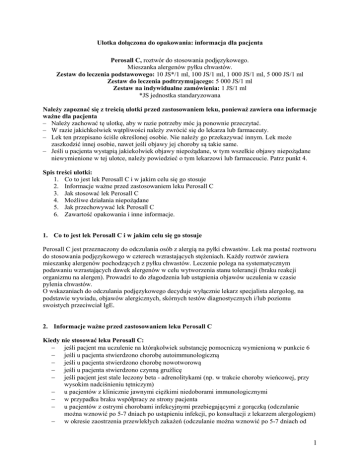 Ulotka dołączona do opakowania: informacja dla pacjenta Perosall C, roztwór do stosowania podjęzykowego. Mieszanka alergenów pyłku chwastów. Zestaw do leczenia podstawowego: 10 JS*/1 ml, 100 JS/1 ml, 1 000 JS/1 ml, 5 000 JS/1 ml Zestaw do leczenia podtrzymującego: 5 000 JS/1 ml Zestaw na indywidualne zamówienia: 1 JS/1 ml *JS jednostka standaryzowana Należy zapoznać się z treścią ulotki przed zastosowaniem leku, ponieważ zawiera ona informacje ważne dla pacjenta – Należy zachować tę ulotkę, aby w razie potrzeby móc ją ponownie przeczytać. – W razie jakichkolwiek wątpliwości należy zwrócić się do lekarza lub farmaceuty. – Lek ten przepisano ściśle określonej osobie. Nie należy go przekazywać innym. Lek może zaszkodzić innej osobie, nawet jeśli objawy jej choroby są takie same. – Jeśli u pacjenta wystąpią jakiekolwiek objawy niepożądane, w tym wszelkie objawy niepożądane niewymienione w tej ulotce, należy powiedzieć o tym lekarzowi lub farmaceucie. Patrz punkt 4. Spis treści ulotki: 1. Co to jest lek Perosall C i w jakim celu się go stosuje 2. Informacje ważne przed zastosowaniem leku Perosall C 3. Jak stosować lek Perosall C 4. Możliwe działania niepożądane 5. Jak przechowywać lek Perosall C 6. Zawartość opakowania i inne informacje. 1. Co to jest lek Perosall C i w jakim celu się go stosuje Perosall C jest przeznaczony do odczulania osób z alergią na pyłki chwastów. Lek ma postać roztworu do stosowania podjęzykowego w czterech wzrastających stężeniach. Każdy roztwór zawiera mieszankę alergenów pochodzących z pyłku chwastów. Leczenie polega na systematycznym podawaniu wzrastających dawek alergenów w celu wytworzenia stanu tolerancji (braku reakcji organizmu na alergen). Prowadzi to do złagodzenia lub ustąpienia objawów uczulenia w czasie pylenia chwastów. O wskazaniach do odczulania podjęzykowego decyduje wyłącznie lekarz specjalista alergolog, na podstawie wywiadu, objawów alergicznych, skórnych testów diagnostycznych i/lub poziomu swoistych przeciwciał IgE. 2. Informacje ważne przed zastosowaniem leku Perosall C Kiedy nie stosować leku Perosall C: jeśli pacjent ma uczulenie na którąkolwiek substancję pomocniczą wymienioną w punkcie 6 jeśli u pacjenta stwierdzono chorobę autoimmunologiczną jeśli u pacjenta stwierdzono chorobę nowotworową jeśli u pacjenta stwierdzono czynną gruźlicę jeśli pacjent jest stale leczony beta - adrenolitykami (np. w trakcie choroby wieńcowej, przy wysokim nadciśnieniu tętniczym) u pacjentów z klinicznie jawnymi ciężkimi niedoborami immunologicznymi w przypadku braku współpracy ze strony pacjenta u pacjentów z ostrymi chorobami infekcyjnymi przebiegającymi z gorączką (odczulanie można wznowić po 5-7 dniach po ustąpieniu infekcji, po konsultacji z lekarzem alergologiem) w okresie zaostrzenia przewlekłych zakażeń (odczulanie można wznowić po 5-7 dniach od 1 ustąpienia zaostrzenia, po konsultacji z lekarzem alergologiem) u pacjentów z niestabilnymi chorobami układu krążenia np. z niestabilną chorobą wieńcową (wymagającymi okresowego stosowania beta-adrenolityków lub inhibitorów ACE) u pacjentów z astmą ciężką, niestabilną – z pomiarami w spirometrii - FEV1 poniżej 70% wartości należnej u pacjentów z ciężkim atopowym zapaleniem skóry w zaostrzeniu. Ostrzeżenia i środki ostrożności jeśli pojawią się działania niepożądane, należy natychmiast powiadomić o nich lekarza w dniu przyjęcia leku należy unikać nadmiernego wysiłku, picia alkoholu oraz przegrzania (np. sauna, gorący prysznic, opalanie). Dzieci nie stosować leku Perosall C u dzieci poniżej 5. roku życia. Perosall C i inne leki równoczesne przyjmowanie leków przeciwalergicznych np. przeciwhistaminowych, kromonów, kortykosteroidów może modyfikować (przesunąć w czasie) rzeczywistą reakcję na lek jeżeli w jednym czasie zaplanowano rozpoczęcie odczulania (leczenie podstawowe) i szczepienie zgodnie z Programem Szczepień Ochronnych, odczulanie powinno być rozpoczęte po wykonaniu szczepienia jeżeli w jednym czasie zaplanowano dawki podtrzymujące i szczepienie zgodnie z Programem Szczepień Ochronnych, szczepienie należy wykonać pomiędzy kolejnymi dawkami podtrzymującymi i kontynuować odczulanie zgodnie ze schematem (nie stosować odczulania i szczepień ochronnych w tym samym dniu). Należy powiedzieć lekarzowi lub farmaceucie o wszystkich lekach przyjmowanych obecnie lub ostatnio a także o lekach, które pacjent planuje przyjmować. Perosall C z jedzeniem i piciem Lek należy stosować na czczo, co najmniej 15 minut przed posiłkiem. Ciąża i karmienie piersią Jeśli pacjentka jest w ciąży lub karmi piersią, przypuszcza, że może być w ciąży lub gdy planuje mieć dziecko, powinna poradzić się lekarza przed zastosowaniem tego leku. Podczas ciąży i w okresie karmienia piersią nie należy rozpoczynać terapii lekiem Perosall C. Jeżeli leczenie takie zostało rozpoczęte przed zajściem w ciążę, może być kontynuowane w porozumieniu z lekarzem prowadzącym. Obecnie brak jest odpowiednio udokumentowanych danych dotyczących stosowania odczulania alergenami u kobiet ciężarnych. Potencjalne ryzyko dla matki i płodu jest więc nieznane. Prowadzenie pojazdów i obsługiwanie maszyn Lek nie wpływa na zdolność prowadzenia pojazdów mechanicznych i obsługiwania maszyn. 3. Jak stosować lek Perosall C Lek Perosall C należy stosować przed sezonem pylenia roślin, zanim pojawią się objawy uczulenia. Stosować na czczo, co najmniej 15 minut przed posiłkiem. Odchylić nieco głowę do tyłu i wkrapiać pod język zalecaną ilość kropli. Butelka po przechyleniu sama dozuje krople dzięki odpowiedniej konstrukcji zakraplacza. Dziecku lek może podawać opiekun. 2 Leczenie dzieli się na dwa etapy: leczenie podstawowe – stopniowe zwiększanie dawki leczenie podtrzymujące – stała dawka. Leczenie pod