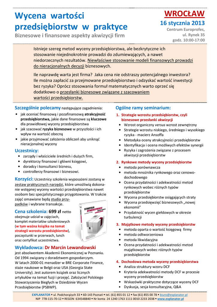 Wycena wartości przedsiębiorstw w praktyce Biznesowe i finansowe aspekty akwizycji firm WROCŁAW 16 stycznia 2013 Centrum Europrofes, ul. Rynek 35 godz. 10:00-17:00 Istnieje szereg metod wyceny przedsiębiorstwa, ale bezkrytyczne ich stosowanie niejednokrotnie prowadzi do zdumiewających, a nawet niedorzecznych rezultatów. Niewłaściwe stosowanie modeli finansowych prowadzi do nieracjonalnych decyzji biznesowych. Ile naprawdę warta jest firma? Jaka cena nie odstraszy potencjalnego inwestora? Ile można zapłacić za przejmowane przedsiębiorstwo i odzyskać wartość inwestycji bez ryzyka? Oprócz stosowania formuł matematycznych warto oprzeć się dodatkowo o przesłanki biznesowe związane z szacowaniem wartości przedsiębiorstw. Szczególnie polecamy następujące zagadnienia: Ogólne ramy seminarium: • jak oceniać finansową i pozafinansową atrakcyjność przedsiębiorstwa, jakie dane finansowe są kluczowe dla prawidłowej wyceny przedsiębiorstwa • jak szacować ryzyka biznesowe w przyszłości i ich wpływ na wartość obecną • jakie przyjmować założenia obliczeń aby uniknąć nieracjonalnej wyceny 1. Strategie wzrostu przedsiębiorstw, czyli biznesowe przesłanki akwizycji • Wzrost organiczny versus wzrost zewnętrzny • Strategie wzrostu niskiego, średniego i wysokiego ryzyka - macierz Ansoffa • Metodyka oceny atrakcyjności przedsiębiorstw • Identyfikacja i ocena możliwych efektów synergii • Ryzyka i zagrożenia związane z procesem akwizycji przedsiębiorstw Uczestnicy: • • • • zarządy i właściciele średnich i dużych firm, dyrektorzy finansowi i główni księgowi, doradcy i konsultanci biznesu, controllerzy finansowi i biznesowi. Korzyści: Uczestnicy szkolenia wyposażeni zostaną w zestaw praktycznych narzędzi, które umożliwią dokonanie wstępnej wyceny wartości przedsiębiorstwa nawet osobom bez specjalistycznego przygotowania. W trakcie zajęć omawiane będą studia przypadków i wybrane transakcje. Cena szkolenia: 699 zł netto obejmuje udział w zajęciach, komplet materiałów szkoleniowych (w tym ważna książka na temat strategii wzrostu przedsiębiorstw), poczęstunki w przerwach, lunch oraz certyfikat uczestnictwa. Wykładowca: Dr Marcin Lewandowski jest absolwentem Akademii Ekonomicznej w Poznaniu. Od 1994 związany z doradztwem gospodarczym. W latach 2000-01 menadżer w BRE Corporate Finance, staże naukowe w Belgii oraz USA (Georgia State University). Jest autorem książek oraz licznych artykułów na temat fuzji i przejęć. Założyciel Polskiego Stowarzyszenia Biegłych w Dziedzinie Wycen Przedsiębiorstw (PSBWP). 2. Rynkowe metody wyceny przedsiębiorstw • metoda porównawcza • metoda mnożnika rynkowego oraz cenowodochodowego • Ocena przydatności i adekwatności metod rynkowych wobec różnych typów przedsiębiorstw • Wycena przedsiębiorstw osiągających straty • Wycena przedsięwzięć biznesowych „nowej ekonomii” • Przydatność wycen giełdowych w okresie turbulencji 3. Majątkowe metody wyceny przedsiębiorstw • metoda oparta o wartość księgową firmy • metoda odtworzeniowa • metoda likwidacyjna • Ocena przydatności i adekwatności metod majątkowych wobec różnych typów przedsiębiorstw 4. Dochodowa metoda wyceny przedsiębiorstwa • Analiza struktury wzoru DCF • Kryteria adekwatności metody DCF w procesie wyceny przedsiębiorstw • Wskazówki praktyczne dotyczące wyceny DCF • Dyskusja, sesja konsultacyjna, Q&A EXPLANATOR ul. Podchorążych 33 60-143 Poznań tel. (61) 855 01 12 fax (61) 855 00 78 [email protected] NIP 778-115-70-12 REGON 634548840 Nr konta 24 1240 1763 1111 0010 2233 2038 www.explanator.pl Umowa zgłoszenie uczestnictwa Niniejszym zgłaszamy udział następujących osób w szkoleniu: Czytelnie wypełnione zgłoszenie prosimy przesłać faksem na nr: (61) 855 00 78 Wycena wartości przedsiębiorstw w praktyce Biznesowe i finansowe aspekty akwizycji firm WROCŁAW, 16 stycznia 2013 1. …………………………………………………………….. e-mail ………………………..…………………………………….. 2. …………………………………………………………….. e-mail ………………………..…………………………………….. 3. …………………………………………………………..… e-mail ………………………..…………………………………….. Nazwa firmy …………………………………………………………………………………..…………………………………….. …………………………………………………………………… NIP …………………..……………………………………..…….. Kod pocztowy ……………….….………… Miejscowość ………………………………………..……………….………. Adres …………………………………………………………….……………………………………………………………………… ………………………………………………………………………………………………..……………………………………..…….. Telefon ……………………………………………….… Faks .………………………………………..………………………….. Branża ………………………………………………….. Liczba zatrudnionych: do 20 do 50 pow.50 Zamawiający ……….………………………………… e-mail ………………………………………………..……………….. Informacje dodatkowe: Rabaty: 5% przy zgłoszeniu 2 i 3 osób, 10% przy zgłoszeniu powyżej 3 osób. Po przesłaniu niniejszego zgłoszenia otrzymają Państwo potwierdzenie jego przyjęcia, szczegóły organizacyjne oraz fakturę pro-forma. Faktura VAT zostanie wystawiona po dokonaniu płatności. Niedokonanie wpłaty nie jest rezygnacją z uczestn