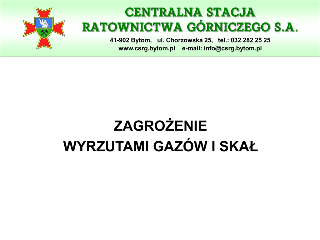 CENTRALNA STACJA RATOWNICTWA GÓRNICZEGO S.A. CENTRALNA STACJA RATOWNICTWA GÓRNICZEGO S.A. 41-902 Bytom, ul. Chorzowska 25, tel.: 032 282 25 25 www.csrg.bytom.pl e-mail: [email protected] ZAGROŻENIE WYRZUTAMI GAZÓW I SKAŁ GÓRNICZEGO S.A. CENTRALNA STACJA RATOWNICTWA G ÓRNICZEGO S.A. Prawo Geologiczne i Górnicze z dnia 4.02.1994 r. art. 73 (znowelizowane 27.07.2001 r.) 1. Przedsiębiorca jest zobowiązany w szczególności: rozpoznawać zagrożenia związane z ruchem zakładu górniczego i podejmować środki zmierzające do zapobiegania i usuwania tych zagrożeń, w tym oceniać i dokumentować ryzyko zawodowe występujące w ruchu zakładu górniczego oraz stosować niezbędne środki profilaktyczne zmniejszające to ryzyko. 2. Posiadać odpowiednie środki materialne i techniczne oraz właściwie zorganizowane służby ruchu do zapewnienia bezpieczeństwa pracowników i ruchu zakładu górniczego. CENTRALNA STACJA RATOWNICTWA GÓRNICZEGO S.A. Artykuł 73a 1. Występujące w zakładach górniczych zagrożenia naturalne: tąpaniami, metanowe, wyrzutami gazów i skał, wybuchem pyłu węglowego, wodne, erupcyjne, siarkowodorowe, radiacyjne naturalnymi substancjami promieniotwórczymi, a także działaniem pyłów szkodliwych dla zdrowia, podlegają zaliczeniu do poszczególnych stopni (kategorii, klas) zagrożeń. 2. Zaliczeń, o których mowa w ust. l, dokonuje właściwy organ nadzoru górniczego w drodze decyzji, jeżeli przepis szczególny nie stanowi inaczej. CENTRALNA STACJA RATOWNICTWA GÓRNICZEGO S.A. § 16. 1 Ustala się dwie kategorie zagrożenia wyrzutami metanu i skał w podziemnych zakładach górniczych wydobywających węgiel kamienny: 1) skłonne do występowania wyrzutów metanu i skał, 2) zagrożone wyrzutami metanu i skał. 2. Do kategorii skłonnych do występowania wyrzutów metanu i skał zalicza się pokłady węgla kamiennego lub ich części, w których: 1) metanonośność wynosi powyżej 8 m3/Mg, w przeliczeniu na czystą substancję węglową, a zwięzłość węgla jest mniejsza niż 0,3 lub 2) metanonośność wynosi powyżej 8 m3/Mg, w przeliczeniu na czystą substancję węglową, a zwięzłość węgla wynosi co najmniej 0,3 ale intensywność desorpcji metanu jest większa niż 1,2 kPa. CENTRALNA STACJA RATOWNICTWA GÓRNICZEGO S.A. 3. Do kategorii zagrożonych wyrzutami metanu i skał zalicza się pokłady węgla kamiennego lub ich części, w których: 1) wystąpił wyrzut metanu i skał lub 2) wystąpił nagły wypływ metanu, lub 3) stwierdzono występowanie innych, wymienionych w § 2 pkt 15, objawów wskazujących na wzrost zagrożenia wyrzutami metanu i skał. 4. Do kategorii zagrożonych wyrzutami metanu i skał zalicza się również pokłady węgla kamiennego lub ich części, skłonne do występowania wyrzutów metanu i skał, w których stwierdzono intensywność desorpcji metanu większą niż 1,2 kPa, oraz wystąpiły objawy, o których mowa w § 2 pkt 15. CENTRALNA STACJA RATOWNICTWA GÓRNICZEGO S.A. § 17. 1. W decyzji o zaliczeniu pokładu węgla kamiennego lub jego części: 1) do kategorii skłonnych do występowania wyrzutów metanu i skał ustala się także granice pokładów lub ich części skłonnych do występowania wyrzutów metanu i skał, 2) do kategorii zagrożonych wyrzutami metanu i skał ustala się także granice pól zagrożonych tymi wyrzutami. 2. Granice pokładów węgla kamiennego lub ich części skłonnych do występowania wyrzutów metanu i skał oraz granice pól zagrożonych wyrzutami metanu i skał powinny być ustalone w taki sposób, aby obejmowały wszystkie wyrobiska, w których skutki wyrzutu metanu i skał lub nagłego wypływu metanu mogą stworzyć zagrożenie zjawiskiem, o którym mowa w § 2 pkt 12 i 13, w tym również wyrobiska, którymi odprowadzany jest metan oraz w których skutki wyrzutu lub wypływu metanu mogą spowodować zaburzenia przewietrzania. CENTRALNA STACJA RATOWNICTWA GÓRNICZEGO S.A. § 18. Ustala się dwie kategorie zagrożenia wyrzutami gazów i skał w podziemnych zakładach górniczych wydobywających węgiel kamienny. Do pierwszej kategorii zagrożenia wyrzutami gazów i skał zalicza się pokłady lub ich części, w których nie wystąpiły wyrzuty gazów i skał. Do drugiej kategorii zagrożenia wyrzutami gazów i skał zalicza się: 1) pokłady lub ich części, w których wystąpiły wyrzuty gazów i skał, 2) pokłady lub ich części, w których nie wystąpiły wyrzuty gazów i skał, ale istnieją objawy określone w § 2 pkt 15. Pokładów lub ich części można nie zaliczać do zagrożonych wyrzutami gazów i skał albo wyłączyć z zaliczenia, jeżeli zostanie stwierdzone przez rzeczoznawcę, że: 1) całkowita gazonośność jest mniejsza od 6 m3/Mg czystej substancji węglowej, 2) całkowita gazonośność zawiera się w granicach od 6 do 16 m3/Mg czystej substancji węglowej, przy zwięzłości węgla większej od 0,8, 3) wyniki prognozy nie wskazują na możliwość wystąpienia zagrożenia wyrzutami gazów i skał. CENTRALNA STACJA RATOWNICTWA GÓRNICZEGO S.A. § 23. 1. Wniosek o zaliczenie złoża (pokładu) lub jego części do kategorii zagrożenia wyrzutami gazów i skał, o których mowa w § 16, 18 i 22, powinien zawierać: 1) opis budowy geologicznej złoża (pokładu) lub jego części, 2) opis czynników charakteryzujących zagrożenie wyrzutami gazów i skał, 3) propozycję zaliczenia złoża (pokładu) lub jego części do odpowiedniej kategorii zagrożenia wyrzutami gazów i skał, wraz z uzasadnieniem. 2. Do wniosku dołącza się: 1) charakterystyczne przekroje geologiczne, 2) mapy złoża (pokładu) lub jego części, w skali nie mniejszej niż 1:5 000, z oznaczeniem proponowanych granic kategorii zagrożenia wyrzutami gazów i skał. CENTRALNA STACJA RATOWNICTWA GÓRNICZEGO S.A. Prognozowanie zagrożenia wyrzutem metanu i skał w podziemnych zakładach górniczych Dla rozpoznania i kontroli stanu zagrożenia w pokładach węgla zaliczon