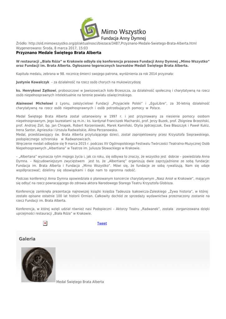 Źródło: http://old.mimowszystko.org/pl/aktualnosci/biezace/3487,Przyznano-Medale-Swietego-Brata-Alberta.html Wygenerowano: Środa, 8 marca 2017, 15:03 Przyznano Medale Świętego Brata Alberta W restauracji „Biała Róża” w Krakowie odbyła się konferencja prasowa Fundacji Anny Dymnej „Mimo Wszystko” oraz Fundacji im. Brata Alberta. Ogłoszono tegorocznych laureatów Medali Świętego Brata Alberta. Kapituła medalu, zebrana w 98. rocznicę śmierci swojego patrona, wyróżnienia za rok 2014 przyznała: Justynie Kowalczyk – za działalność na rzecz osób chorych na mukowizcydozę ks. Henrykowi Zątkowi, proboszczowi w Jawiszowicach koło Brzeszcza, za działalność społeczną i charytatywną na rzecz osób niepełnosprawnych intelektualnie na terenie powiatu oświęcimskiego. Alaineowi Michelowi z Lyonu, założycielowi Fundacji „Przyjaciele Polski” i „EguiLibre”, za 30-letnią działalność charytatywną na rzecz osób niepełnosprawnych i osób potrzebujących pomocy w Polsce. Medal Świętego Brata Alberta został ustanowiony w 1997 r. i jest przyznawany za niesienie pomocy osobom niepełnosprawnym. Jego laureatami są m.in.: ks. kardynał Franciszek Macharski, prof. Jerzy Buzek, prof. Zbigniew Brzeziński, prof. Andrzej Zoll, bp. Jan Chrapek, Robert Korzeniowski, Marek Kamiński, Otylia Jędrzejczak, Ewa Błaszczyk i Paweł Kukiz, Irena Santor, Agnieszka i Urszula Radwańskie, Alina Perzanowska. Medal, przedstawiający św. Brata Alberta przytulającego dzieci, został zaprojektowany przez Krzysztofa Sieprawskiego, podopiecznego schroniska w Radwanowicach. Wręczenie medali odbędzie się 9 marca 2015 r. podczas XV Ogólnopolskiego Festiwalu Twórczości Teatralno-Muzycznej Osób Niepełnosprawnych „Albertiana” w Teatrze im. Juliusza Słowackiego w Krakowie. – „Albertana” wyznacza rytm mojego życia i, jak co roku, się odbywa to znaczy, że wszystko jest dobrze – powiedziała Anna Dymna. – Najcudowniejszym zwycięstwem jest to, że „Albertianę” organizują dwie zaprzyjaźnione ze sobą fundacje: Fundacja im. Brata Alberta i Fundacja „Mimo Wszystko”. Mówi się, że fundacje ze sobą rywalizują. Nam się udaje współpracować; dzielimy się obowiązkami i daje nam to ogromna radość. Podczas konferencji Anna Dymna opowiedziała o planowanym koncercie charytatywnym „Nasz Anioł w Krakowie”, mającym się odbyć na rzecz powracającego do zdrowia aktora Narodowego Starego Teatru Krzysztofa Globisza. Konferencję zamknęła prezentacja najnowszej książki księdza Tadeusza Isakowicza-Zaleskiego „Żywa historia”, w której zostało opisane ostatnie 100 lat historii Ormian. Całkowity dochód ze sprzedaży wydawnictwa przeznaczony zostanie na rzecz Fundacji im. Brata Alberta. Konferencja, w której wzięli udział również nasi Podopieczni – Aktorzy Teatru „Radwanek”, została zorganizowana dzięki uprzejmości restauracji „Biała Róża” w Krakowie. Tweet Galeria Medal Świętego Brata Alberta Nasi Podopieczni Od lewej: ks. Tadeusz Isakowicz-Zaleski, Anna Dymna, Jan Bujnowicz z Fundacja Brata Alberta, Małgorzata Krynke, dyrektor zarządzająca Polskiego Towarzystwa Walki z Mukowiscydozą Konferencja została zorganizowana dzięki uprzejmości restauracji „Biała Róża” w Krakowie Podziel się: