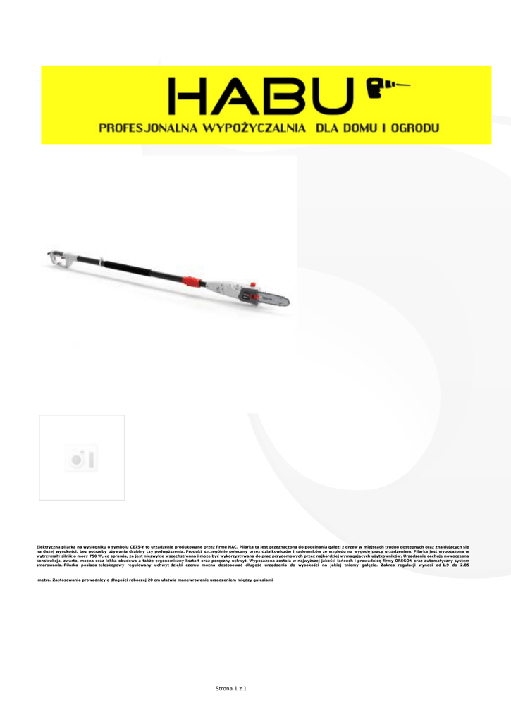 Elektryczna pilarka na wysięgniku o symbolu CE75-Y to urządzenie produkowane przez firmę NAC. Pilarka ta jest przeznaczona do podcinania gałęzi z drzew w miejscach trudno dostępnych oraz znajdujących się na dużej wysokości, bez potrzeby używania drabiny czy podwyższenia. Produkt szczególnie polecany przez działkowiczów i sadowników ze względu na wygodę pracy urządzeniem. Pilarka jest wyposażona w wytrzymały silnik o mocy 750 W, co sprawia, że jest niezwykle wszechstronna i może być wykorzystywana do prac przydomowych przez najbardziej wymagających użytkowników. Urządzenie cechuje nowoczesna konstrukcja, zwarta, mocna oraz lekka obudowa a także ergonomiczny kształt oraz poręczny uchwyt. Wyposażona została w najwyższej jakości łańcuch i prowadnicę firmy OREGON oraz automatyczny system smarowania. Pilarka posiada teleskopowy regulowany uchwyt dzięki czemu można dostosować długość urządzenia do wysokości na jakiej tniemy gałęzie. Zakres regulacji wynosi od 1.9 do 2.85 metra. Zastosowanie prowadnicy o długości roboczej 20 cm ułatwia manewrowanie urządzeniem między gałęziami Strona 1 z 1