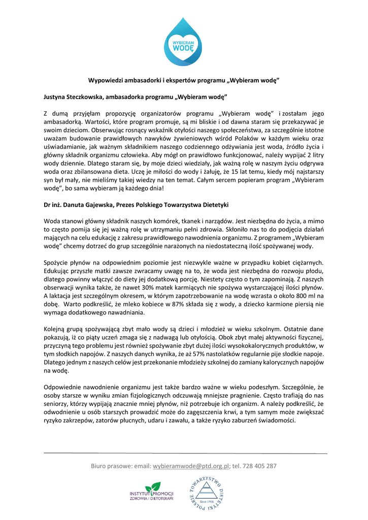 Wypowiedzi ambasadorki i ekspertów programu „Wybieram wodę” Justyna Steczkowska, ambasadorka programu „Wybieram wodę” Z dumą przyjęłam propozycję organizatorów programu „Wybieram wodę” i zostałam jego ambasadorką. Wartości, które program promuje, są mi bliskie i od dawna staram się przekazywać je swoim dzieciom. Obserwując rosnący wskaźnik otyłości naszego społeczeństwa, za szczególnie istotne uważam budowanie prawidłowych nawyków żywieniowych wśród Polaków w każdym wieku oraz uświadamianie, jak ważnym składnikiem naszego codziennego odżywiania jest woda, źródło życia i główny składnik organizmu człowieka. Aby mógł on prawidłowo funkcjonować, należy wypijać 2 litry wody dziennie. Dlatego staram się, by moje dzieci wiedziały, jak ważną rolę w naszym życiu odgrywa woda oraz zbilansowana dieta. Uczę je miłości do wody i żałuję, że 15 lat temu, kiedy mój najstarszy syn był mały, nie mieliśmy takiej wiedzy na ten temat. Całym sercem popieram program „Wybieram wodę”, bo sama wybieram ją każdego dnia! Dr inż. Danuta Gajewska, Prezes Polskiego Towarzystwa Dietetyki Woda stanowi główny składnik naszych komórek, tkanek i narządów. Jest niezbędna do życia, a mimo to często pomija się jej ważną rolę w utrzymaniu pełni zdrowia. Skłoniło nas to do podjęcia działań mających na celu edukację z zakresu prawidłowego nawodnienia organizmu. Z programem „Wybieram wodę” chcemy dotrzeć do grup szczególnie narażonych na niedostateczną ilość spożywanej wody. Spożycie płynów na odpowiednim poziomie jest niezwykle ważne w przypadku kobiet ciężarnych. Edukując przyszłe matki zawsze zwracamy uwagę na to, że woda jest niezbędna do rozwoju płodu, dlatego powinny włączyć do diety jej dodatkową porcję. Niestety często o tym zapominają. Z naszych obserwacji wynika także, że nawet 30% matek karmiących nie spożywa wystarczającej ilości płynów. A laktacja jest szczególnym okresem, w którym zapotrzebowanie na wodę wzrasta o około 800 ml na dobę. Warto podkreślić, że mleko kobiece w 87% składa się z wody, a dziecko karmione piersią nie wymaga dodatkowego nawadniania. Kolejną grupą spożywającą zbyt mało wody są dzieci i młodzież w wieku szkolnym. Ostatnie dane pokazują, iż co piąty uczeń zmaga się z nadwagą lub otyłością. Obok zbyt małej aktywności fizycznej, przyczyną tego problemu jest również spożywanie zbyt dużej ilości wysokokalorycznych produktów, w tym słodkich napojów. Z naszych danych wynika, że aż 57% nastolatków regularnie pije słodkie napoje. Dlatego jednym z naszych celów jest przekonanie młodzieży szkolnej do zamiany kalorycznych napojów na wodę. Odpowiednie nawodnienie organizmu jest także bardzo ważne w wieku podeszłym. Szczególnie, że osoby starsze w wyniku zmian fizjologicznych odczuwają mniejsze pragnienie. Często trafiają do nas seniorzy, którzy wypijają znacznie mniej płynów, niż potrzebuje ich organizm. A należy podkreślić, że odwodnienie u osób starszych prowadzić może do zagęszczenia krwi, a tym samym może zwiększać ryzyko zakrzepów, zatorów płucnych, udaru i zawału, a także ryzyko zaburzeń świadomości. Biuro prasowe: email: [email protected]; tel. 728 405 287 Właściwe nawodnienie organizmu jest także jednym z kluczowych elementów warunkujących sukcesy sportowe. Spożycie płynów na odpowiednim poziomie ma podstawowe znaczenie nie tylko dla osiąganych wyników, ale również zapobiega urazom. Niestety w praktyce okazuje się, że woda jest często niedocenianym składnikiem diety. Dlatego też edukacją chcielibyśmy objąć zarówno sportowców zawodowych, jak i amatorów. Mamy nadzieję, że działania Polskiego Towarzystwa Dietetyki w ramach programu „Wybieram wodę” będą efektywne i w ciągu najbliższych 3 lat uda nam się zwiększyć świadomość Polaków odnośnie korzyści, jakie daje prawidłowe nawodnienie organizmu. Prof. Kazimierz Banasik, Szkoła Główna Gospodarstwa Wiejskiego Problematyka wodna jest jednym z głównych obszarów badań i dydaktyki w Szkole Głównej Gospodarstwa Wiejskiego w Warszawie, jako uczelni przyrodniczo-rolniczej. Wynika to ze znaczenia, jakie ma woda w środowisku kształtowanym przez człowieka, czyli wszędzie tu, gdzie żyjemy. Wody potrzebujemy w naszych domach, potrzebuje jej przemysł, energetyka i rolnictwo, potrzebuje środowisko naturalne. Dla zintensyfikowania badań i edukacji w obszarze hydrotechniki, melioracji i gospodarki wodnej, utworzono w SGGW – przy wsparciu środków z Unii Europejskiej – Centrum Wodne, czyli zespół ponad dwudziestu specjalistycznych i nowoczesnych laboratoriów. Odnawialne zasoby wodne naszego kraju, choć jedne z najniższych w Europie – w przeliczeniu na mieszkańca – z nadmiarem zaspokajają nasze potrzeby bytowe, kiedy rozpatrujemy je, jako średnie w skali roku. Nie jest już tak dobrze, jeśli rozpatrywać będziemy zmienność w ciągu roku, a szczególnie, kiedy weźmiemy pod uwagę, iż w miesiącach o najmniejszych zasobach odnawialnych (w lipcu i sierpniu) zapotrzebowanie głównego konsumenta wody w Polsce – tj. energetyki, wykorzystującej wodę w celach chłodniczych – jest, z uwagi na zwiększone zapotrzebowanie prądu do urządzeń klimatyzacyjnych – dużo większe. Sytuację zbliżoną do krytycznej, z uwagi na zbyt małe ilości wody w rzekach do celów chłodniczych w elektrowniach, mieliśmy tego lata. Dzieje się to wszystko w sytuacji, kiedy nasze rolnictwo będące u progu unowocześnienia – pobiera nadal niewielkie ilości wody (stanowiące ok. 11% ogólnego poboru wód). Szansą zaspokojenia rosnących potrzeb energetyki, pozostałego przemysłu, a szczególnie nowoczesnego rolnictwa jest racjonalna gospodarka wodna oparta na retencjonowaniu wód w okresach jej nadmiaru (m.in. w okresach wiosennych) i wykorzystaniu w okresach deficytowych. Pro