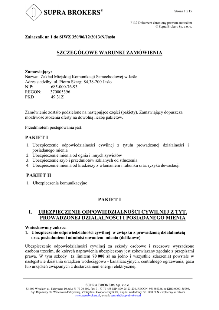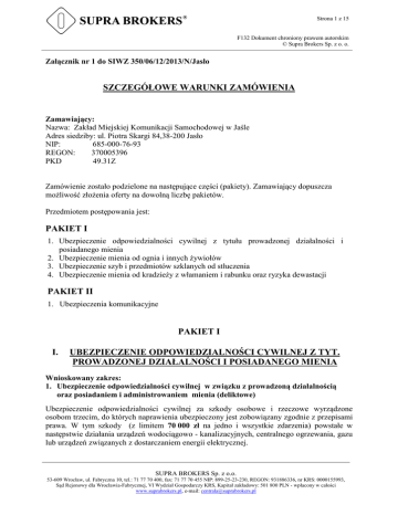 Strona 1 z 15 F132 Dokument chroniony prawem autorskim © Supra Brokers Sp. z o. o. Załącznik nr 1 do SIWZ 350/06/12/2013/N/Jasło SZCZEGÓŁOWE WARUNKI ZAMÓWIENIA Zamawiający: Nazwa: Zakład Miejskiej Komunikacji Samochodowej w Jaśle Adres siedziby: ul. Piotra Skargi 84,38-200 Jasło NIP: 685-000-76-93 REGON: 370005396 PKD 49.31Z Zamówienie zostało podzielone na następujące części (pakiety). Zamawiający dopuszcza możliwość złożenia oferty na dowolną liczbę pakietów. Przedmiotem postępowania jest: PAKIET I 1. Ubezpieczenie odpowiedzialności cywilnej z tytułu prowadzonej działalności i posiadanego mienia 2. Ubezpieczenie mienia od ognia i innych żywiołów 3. Ubezpieczenie szyb i przedmiotów szklanych od stłuczenia 4. Ubezpieczenie mienia od kradzieży z włamaniem i rabunku oraz ryzyka dewastacji PAKIET II 1. Ubezpieczenia komunikacyjne PAKIET I I. UBEZPIECZENIE ODPOWIEDZIALNOŚCI CYWILNEJ Z TYT. PROWADZONEJ DZIAŁALNOŚCI I POSIADANEGO MIENIA Wnioskowany zakres: 1. Ubezpieczenie odpowiedzialności cywilnej w związku z prowadzoną działalnością oraz posiadaniem i administrowaniem mienia (deliktowe) Ubezpieczenie odpowiedzialności cywilnej za szkody osobowe i rzeczowe wyrządzone osobom trzecim, do których naprawienia ubezpieczony jest zobowiązany zgodnie z przepisami prawa. W tym szkody (z limitem 70 000 zł na jedno i wszystkie zdarzenia) powstałe w następstwie działania urządzeń wodociągowo - kanalizacyjnych, centralnego ogrzewania, gazu lub urządzeń związanych z dostarczaniem energii elektrycznej. SUPRA BROKERS Sp. z o.o. 53-609 Wrocław, ul. Fabryczna 10, tel.: 71 77 70 400, fax: 71 77 70 455 NIP: 899-25-23-230, REGON: 931886336, nr KRS: 0000155993, Sąd Rejonowy dla Wrocławia-Fabrycznej, VI Wydział Gospodarczy KRS, Kapitał zakładowy: 501 800 PLN - wpłacony w całości www.suprabrokers.pl, e-mail: [email protected] Strona 2 z 15 F132 Dokument chroniony prawem autorskim © Supra Brokers Sp. z o. o. Odpowiedzialnością Zakładu Ubezpieczeń objęte są wypadki ubezpieczeniowe które zaszły w okresie ubezpieczenia, choćby roszczenia z ich tytułu zostały zgłoszone po tym okresie, jednakże przed upływem kodeksowego terminu przedawnienia. Przez wypadek ubezpieczeniowy rozumie się śmierć, uszkodzenie ciała, doznanie rozstroju zdrowia, utratę, zniszczenie, uszkodzenie rzeczy lub czystą stratę finansową. W ramach ubezpieczenia pokryte będą także koszty: 1. postępowania sądowego lub pojednawczego prowadzonego za zgodą Ubezpieczyciela, w związku z roszczeniami zgłoszonymi przez poszkodowanego, w tym także koszty wynagrodzenia adwokatów lub radców prawnych z tytułu uczestnictwa w procesie cywilnym, 2. uzasadnione koszty powołania za zgodą Ubezpieczyciela rzeczoznawców, 3. uzasadnione koszty działań mających na celu zapobieżeniu zwiększenia się szkody. SUMA GWARANCYJNA Suma gwarancyjna Wszystkie zdarzenia Limit na jedno zdarzenie Wysokość w zł 200 000 200 000 Rozszerzenia ubezpieczenia odpowiedzialności cywilnej o szkody: 1. Rozszerzenie zakresu o szkody powstałe w wyniku niewykonania lub nienależytego wykonania zobowiązania - odpowiedzialność kontraktowa. Limit: 200 000 zł na jedno i wszystkie zdarzenia w okresie ubezpieczenia 2. Rozszerzenie zakresu o szkody wyrządzone pracownikom ubezpieczonego, powstałe w następstwie wypadku przy pracy. Franszyza redukcyjna w kwocie wypłaconych świadczeń ZUS. Limit: 200 000 zł na jedno i wszystkie zdarzenia w okresie ubezpieczenia 3. Rozszerzenie zakresu o szkody powstałe w nieruchomościach, z których ubezpieczony korzystał na podstawie umowy najmu, dzierżawy, użytkowania, leasingu lub innej podobnej formy korzystania z cudzej rzeczy. Limit: 100 000 zł na jedno i wszystkie zdarzenia w okresie ubezpieczenia Udział własny: brak Franszyza integralna: brak Franszyza redukcyjna: brak Zamawiający wnioskuje o zastosowanie w ofercie ubezpieczenia następujących klauzul dodatkowych, które będą brane pod uwagę w ocenie kryterium warunki ubezpieczenia. 1. Klauzula stempla bankowego 2. Klauzula jurysdykcji SUPRA BROKERS Sp. z o.o. 53-609 Wrocław, ul. Fabryczna 10, tel.: 71 77 70 400, fax: 71 77 70 455 NIP: 899-25-23-230, REGON: 931886336, nr KRS: 0000155993, Sąd Rejonowy dla Wrocławia-Fabrycznej, VI Wydział Gospodarczy KRS, Kapitał zakładowy: 501 800 PLN - wpłacony w całości www.suprabrokers.pl, e-mail: [email protected] Strona 3 z 15 F132 Dokument chroniony prawem autorskim © Supra Brokers Sp. z o. o. 2. UBEZPIECZENIE MIENIA OD OGNIA I INNYCH ŻYWIOŁÓW 1. 1. 2. 3. 4. 5. 6. 7. 8. 9. 10. 11. 12. 13. 14. 15. 16. Zakres ubezpieczenia: pełny - obejmuje szkody będące następstwem minimum wymienionych poniżej ryzyk: Ogień, w tym również osmalenie i przypalenie, działanie dymu i sadzy, jeżeli pierwotną przyczyną był ogień, Bezpośrednie uderzenie pioruna, Eksplozja, Upadek statku powietrznego, jego części lub przewożonego ładunku, Uderzenie pojazdu w ubezpieczane mienie, Huk ponaddźwiękowy, Powódź rozumiana jako zalanie ubezpieczanego mienia wskutek podniesienia się poziomu wód w zbiornikach stojących i płynących, sztormu i podniesienia się poziomu wód morskich, tworzenia się zatorów lodowych, przerwania tam, zabezpieczeń przeciwpowodziowych, także wskutek nadmiernych opadów atmosferycznych lub w wyniku topnienia mas lodu i śniegu na tych zboczach lub stokach, spływu wody po zboczach lub stokach górskich oraz wystąpienie wody z systemów kanalizacyjnych będące następstwem wymienionych zjawisk. Deszcz nawalny, Huragan – wiatr o sile przynajmniej 17,1 m/s, Grad, Napór śniegu lub lodu – bezpośrednie działanie ciężaru śniegu lub lodu na przedmiot ubezpieczenia albo przewrócenie się pod wpływem ciężaru śniegu lub lodu mienia sąsiedniego na ubezpieczone mienie, Zapadanie lub osuwanie się ziemi, trzęsienie ziemi – nie będące następstwem działalności człowieka. Lawina śniegu, lodu, błota, 