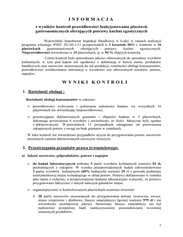INFORMACJA z wyników kontroli prawidłowości funkcjonowania placówek gastronomicznych oferujących potrawy kuchni egzotycznych Wojewódzki Inspektorat Inspekcji Handlowej w Łodzi w ramach realizacji programu własnego WIIH- ŻG-40-1/11 przeprowadził w I kwartale 2011 r. kontrole w 16 placówkach gastronomicznych oferujących potrawy kuchni egzotycznych. Nieprawidłowości stwierdzono w 15 placówkach, tj. w 94 % objętych kontrolą. Celem kontroli było sprawdzenie jakości oferowanych do sprzedaży wyrobów kulinarnych, w tym pod kątem ich zgodności z deklaracją w karcie menu, produktów handlowych oraz surowców stosowanych do ich produkcji, rzetelności obsługi konsumentów, prawidłowości uwidaczniania informacji o wysokości cen oferowanych towarów, potraw, napojów. WYNIKI KONTROLI 1. Rzetelność obsługi : Rzetelność obsługi konsumentów w zakresie: • prawidłowości wyliczania i pobierania należności badano we wszystkich 16 placówkach nie stwierdzając nieprawidłowości, • przestrzegania deklarowanych gramatur i objętości badano w 3 placówkach, dokonując przeważenia 6 wyrobów i stwierdzono, że ilości faktyczne były zgodne z deklarowanymi. W pozostałych 13 przypadkach odstąpiono od przeważenia zakupionych potraw z uwagi na brak gramatur w cennikach, W toku kontroli nie stwierdzono przypadków użycia do przygotowania potraw surowców mrożonych zamiast deklarowanych surowców świeżych. 2. Przestrzegania przepisów prawa żywnościowego: a) Jakość surowców, półproduktów, potraw i napojów • do badań laboratoryjnych pobrano 5 partii wyrobów kulinarnych wartości 52 zł, pochodzących z zakupów. W wyniku przeprowadzonych badań zakwestionowano 3 partie wyrobów kulinarnych (60% badanych) wartości 29 zł z powodu podmiany asortymentowej mięsa wchodzącego w skład potraw. Potrawy deklarowano w cenniku jako dania z cielęciny, a przeprowadzone badania laboratoryjne wykazały, że potrawy przygotowano faktycznie z innych tańszych gatunków mięsa. • organoleptycznie w kontrolowanych placówkach oceniono świeżość: 28 partii surowców stosowanych do przygotowania potraw (warzywa, owoce, mięso wieprzowe i drobiowe, tłuszcz smażalniczy) łącznej wartości 979 zł i nie stwierdzono niewłaściwej jakości. Stosowany tłuszcz smażalniczy nie był nadmiernie przepalony bądź zanieczyszczony pozostałościami wcześniej smażonych produktów; 1 30 partii wyrobów kulinarnych wartości 461 zł, pochodzących z zakupów nie wnosząc zastrzeżeń do cech organoleptycznych ocenianych potraw. Wobec 3 przedsiębiorców zostaną wszczęte z urzędu postępowania administracyjne w przedmiocie nałożenia kar pieniężnych wynikających z art. 40a ust. 1 pkt 4 ustawy z dnia 21 grudnia 2000 r. o jakości handlowej artykułów rolno – spożywczych (Dz. U. z 2005r. nr 187, poz. 1577 z późn. zm.) w związku z wprowadzeniem do sprzedaży zafałszowanych potraw. b) Prawidłowość oznakowania towarów badano we wszystkich placówkach obejmując kontrolą 68 partii towarów wartości 4.440 zł w tym napoje, przyprawy, przetwory zbożowe, ryby i owoce morza, mieszanki warzywne mrożone, grzyby. Nie stwierdzono nieprawidłowości w oznakowaniu. Na podstawie informacji uwidocznionych na opakowaniach stwierdzono, że sprawdzone produkty nie zawierały w swoim składzie substancji dodatkowych innych niż dozwolone. c) Warunki i sposób przechowywania surowców używanych do produkcji, towarów handlowych oraz gotowych wyrobów kulinarnych sprawdzono we wszystkich placówkach. Badaniem w tym zakresie objęto 102 partie łącznej wartości 5.814 zł. Nieprawidłowości stwierdzono w jednym barze, w którym poza urządzeniami chłodniczymi w temperaturze otoczenia (około 15°C) przechowywane były półprodukty i wyroby gotowe. d) Nieprawidłowości dotyczące stanu sanitarno – porządkowego stwierdzono w 2 placówkach. W jednym barze zamrażarka, w której przechowywano mięso do produkcji była oblodzona i brudna, do wydawania potraw używano naczyń wielokrotnego użytku, mytych pod bieżącą wodą, nie korzystając z zamontowanej zmywarki; w drugim surowce do produkcji, półprodukty oraz wyroby gotowe przechowywano w bardzo brudnych urządzeniach chłodniczych. e) Aktualność terminów przydatności do spożycia i dat minimalnej trwałości sprawdzono w 15 placówkach dla 121 partii surowców używanych do produkcji potraw oraz towarów handlowych łącznej wartości 7.792 zł nie stwierdzając ich przekroczenia. f) Aktualność orzeczeń lekarskich We wszystkich 16 placówkach zatrudniano osoby, które posiadały aktualne orzeczenia lekarskie wydawane do celów sanitarno – epidemiologicznych dla osób zatrudnionych przy produkcji i w obrocie środkami spożywczymi. g) Materiały do kontaktu z żywnością sprawdzono w 11 placówkach. Badaniem objęto 60 partii opakowań. Wszystkie posiadały oznaczenia dopuszczające je do bezpośredniego kontaktu z żywnością. h) Legalność działania przedsiębiorców Działalność gospodarcza we wszystkich kontrolowanych placówkach prowadzona była zgodnie z wpisami do rejestrów handlowych lub zaświadczeń o wpisie do ewidencji działalności gospodarczej. Wszyscy przedsiębiorcy prowadzili książki kontroli. i) Identyfikowalność towarów Przestrzeganie przepisów art. 18 ust. 2 rozporządzenia (WE) nr 178/2002 Parlamentu Europejskiego i Rady z dnia 28 stycznia 2002 r. ustanawiającego ogólne zasady i wymagania prawa żywnościowego, powołującego Europejski Urząd ds. Bezpieczeństwa Żywności oraz ustanawiającego procedury w zakresie bezpieczeństwa żywności (Dz. U. L31 z 01.02.2002) sprawdzono w 15 placówkach obejmując głównie surowce mięsne 2 oraz przetwory zbożowe i warzywa. We wszystkich zakładach okazano dokumenty, które umożliwiały identyfikację każdej osoby dostarczającej środek spożywczy do lokalu. 3. Inne zagadnienia • Aktualność cech legalizacji stosowanych