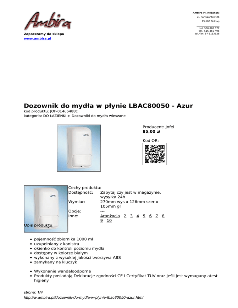 Ambira M. Różański ul. Partyzantów 26 19-500 Gołdap ___________________ tel. 500 088 577 tel.: 516 366 496 tel./fax: 87 6153626 Zapraszamy do sklepu www.ambira.pl Dozownik do mydła w płynie LBAC80050 - Azur kod produktu: JOF-014u6488c kategoria: DO ŁAZIENKI > Dozowniki do mydła wieszane Producent: Jofel 85,00 zł Kod QR: Cechy produktu: Dostępność: Zapytaj czy jest w magazynie, wysyłka 24h Wymiar: 270mm wys x 126mm szer x 105mm gł Opcje: --Inne: Aranżacja 2 3 4 5 6 7 8 9 10 Opis produktu: pojemność zbiornika 1000 ml uzupełniany z kanistra okienko do kontroli poziomu mydła dostępny w kolorze białym wykonany z wysokiej jakości tworzywa ABS zamykany na kluczyk Wykonanie wandaloodporne Produkty posiadają Deklaracje zgodności CE i Certyfikat TUV oraz jeśli jest wymagany atest higieny strona: 1/4 http://w.ambira.pl/dozownik-do-mydla-w-plynie-lbac80050-azur.html Grupa kapitałowa specjalizuje się w produkcji urządzeń higienicznych i papierów, posiada cztery fabryki w Hiszpanii i dwie w Ameryce Południowej. Zajmuje pozycję wiodącego na rynku światowym producenta artykułów higienicznych dla biur, zakładów przemysłowych, ośrodków służby zdrowia, hoteli, restauracji i innych tego typu miejsc pracy. Oferta zawiera kompletny i szeroki asortyment wysokiej jakości produktów, zaprojektowanych w celu usatysfakcjonowania nawet najbardziej wymagających klientów Zaopatrzyli się o nas m.in.: Sąd Rejonowy w Rzeszowie, Galeria Nowy Świat w Rzeszowie, Biurowiec Atrium w Katowicach, Green Park I w Katowicach, Expo Silesia - Centrum Targowo - Wystawiennicze, Sieć Salonów Meblowych BLACK RED WHITE, Centrum Handlowe Gala w Lublinie, Straż Pożarna w Katowicach, Decathlon w Sosnowcu, Sheraton Sopot Hotel, Conference Center & SPA, Miejska Biblioteka Publiczna w Jaworznie, Hotel Diament we Wrocławiu, Park Hotel Diament w Katowicach, SPA Hotel Diament w Ustroniu Ze wzgledu na specyficzna organizacje produkcji, gdzie produkty wykonuje sie partiami w odstępie kilku miesiecznym, przed zlożeniem zamowiania prosimy o zapytanie o stanie faktycznym magazynu. Zaopatrzenie co 2-6 tygodni. Dodatkowe: strona: 2/4 http://w.ambira.pl/dozownik-do-mydla-w-plynie-lbac80050-azur.html strona: 3/4 http://w.ambira.pl/dozownik-do-mydla-w-plynie-lbac80050-azur.html strona: 4/4 http://w.ambira.pl/dozownik-do-mydla-w-plynie-lbac80050-azur.html