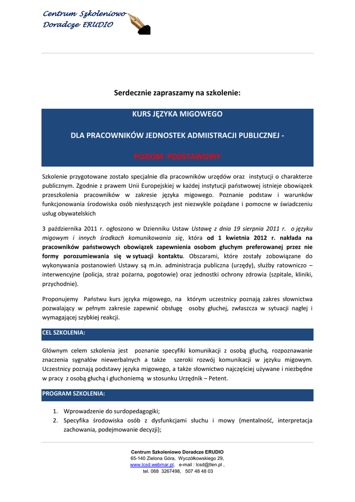 Centrum Szkoleniowo Doradcze ERUDIO Serdecznie zapraszamy na szkolenie: KURS JĘZYKA MIGOWEGO DLA PRACOWNIKÓW JEDNOSTEK ADMIISTRACJI PUBLICZNEJ POZIOM PODSTAWOWY Szkolenie przygotowane zostało specjalnie dla pracowników urzędów oraz instytucji o charakterze publicznym. Zgodnie z prawem Unii Europejskiej w każdej instytucji państwowej istnieje obowiązek przeszkolenia pracowników w zakresie języka migowego. Poznanie podstaw i warunków funkcjonowania środowiska osób niesłyszących jest niezwykle pożądane i pomocne w świadczeniu usług obywatelskich 3 października 2011 r. ogłoszono w Dzienniku Ustaw Ustawę z dnia 19 sierpnia 2011 r. o języku migowym i innych środkach komunikowania się, która od 1 kwietnia 2012 r. nakłada na pracowników państwowych obowiązek zapewnienia osobom głuchym preferowanej przez nie formy porozumiewania się w sytuacji kontaktu. Obszarami, które zostały zobowiązane do wykonywania postanowień Ustawy są m.in. administracja publiczna (urzędy), służby ratowniczo – interwencyjne (policja, straż pożarna, pogotowie) oraz jednostki ochrony zdrowia (szpitale, kliniki, przychodnie). Proponujemy Państwu kurs języka migowego, na którym uczestnicy poznają zakres słownictwa pozwalający w pełnym zakresie zapewnić obsługę osoby głuchej, zwłaszcza w sytuacji nagłej i wymagającej szybkiej reakcji. CEL SZKOLENIA: Głównym celem szkolenia jest poznanie specyfiki komunikacji z osobą głuchą, rozpoznawanie znaczenia sygnałów niewerbalnych a także szeroki rozwój komunikacji w języku migowym. Uczestnicy poznają podstawy języka migowego, a także słownictwo najczęściej używane i niezbędne w pracy z osobą głuchą i głuchoniemą w stosunku Urzędnik – Petent. PROGRAM SZKOLENIA: 1. Wprowadzenie do surdopedagogiki; 2. Specyfika środowiska osób z dysfunkcjami słuchu i mowy (mentalność, interpretacja zachowania, podejmowanie decyzji); Centrum Szkoleniowo Doradcze ERUDIO 65-140 Zielona Góra, Wyczółkowskiego 29, www.lcsd.webmar.pl, e-mail : [email protected] , tel. 068 3267498, 507 48 48 03 Centrum Szkoleniowo Doradcze ERUDIO 3. Rodzaje i możliwości komunikacji (język migowy, mimika, ekspresja ciała, krótkie informacje pisane); 4. Alfabet palcowy; 5. Podstawowe znaki języki migowego; 6. Ćwiczenia, symulacja wybranych sytuacji wynikających ze specyfiki działania urzędu (np. obsługa petenta). METODA SZKOLENIA: Nauka języka migowego prowadzona będzie metodą warsztatową. Uczestnicy po zapoznaniu się z kolejnymi grupami znaków, będą wykorzystywali je w zaaranżowanych sytuacjach, z którymi spotykają się na co dzień w pracy. Szkolimy uczestników w dwóch trybach języka migowego – zarówno SJM (System Językowo-Migowy) jak i PJM (Polski Język Migowy). WYKŁADOWCY: Wykładowcą na szkoleniu będzie wykwalifikowany specjalista, tłumacz języka migowego, posiadający certyfikat tłumacza (SJM) z ZG Polskiego Związku Głuchych w Warszawie oraz uprawnienia PJM na najwyższym poziomie językowym B2 zdobyte w Instytucie Polskiego Języka Migowego w Warszawie. ORGANIZACJA SZKOLENIA SZKOLENIA: Rozpoczęcie szkolenia 4 marca 2014 roku. Termin zgłoszenia upływa w dniu 25 lutego 2014 r. Program szkolenia obejmuje 40 godz. Szkolenie odbędzie się w centrum Zielonej Góry . KOSZT UCZESTNICTWA: 700 zł od osoby– szkolenie zostało częściowo dofinansowane przez zielonogórskie Stowarzyszenie „Ex Dono”. W ramach szkolenia zapewniamy: udział w zajęciach, ćwiczenia praktyczne, materiały piśmiennicze, serwis kawowy, zaświadczenie o ukończeniu szkolenia. Warunkiem uczestnictwa jest zgłoszenie uczestnictwa i przesłanie karty zgłoszenia na adres organizatora (karta zostanie przesłana na adres uczestnika po wpłynięciu zgłoszenia). Istnieje możliwość organizacji szkolenia zamkniętego tylko dla pracowników Państwa firmy, w takim przypadku cena ulegnie zmniejszeniu Centrum Szkoleniowo Doradcze ERUDIO 65-140 Zielona Góra, Wyczółkowskiego 29, www.lcsd.webmar.pl, e-mail : [email protected] , tel. 068 3267498, 507 48 48 03