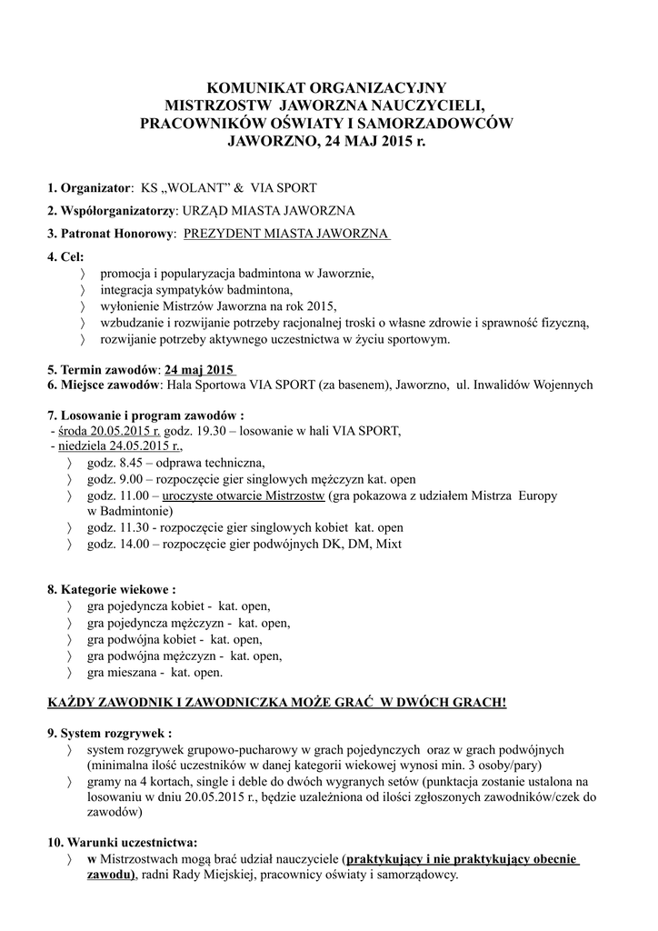 KOMUNIKAT ORGANIZACYJNY MISTRZOSTW JAWORZNA NAUCZYCIELI, PRACOWNIKÓW OŚWIATY I SAMORZADOWCÓW JAWORZNO, 24 MAJ 2015 r. 1. Organizator: KS „WOLANT” & VIA SPORT 2. Współorganizatorzy: URZĄD MIASTA JAWORZNA 3. Patronat Honorowy: PREZYDENT MIASTA JAWORZNA 4. Cel: promocja i popularyzacja badmintona w Jaworznie, integracja sympatyków badmintona, wyłonienie Mistrzów Jaworzna na rok 2015, wzbudzanie i rozwijanie potrzeby racjonalnej troski o własne zdrowie i sprawność fizyczną, rozwijanie potrzeby aktywnego uczestnictwa w życiu sportowym. 5. Termin zawodów: 24 maj 2015 6. Miejsce zawodów: Hala Sportowa VIA SPORT (za basenem), Jaworzno, ul. Inwalidów Wojennych 7. Losowanie i program zawodów : - środa 20.05.2015 r. godz. 19.30 – losowanie w hali VIA SPORT, - niedziela 24.05.2015 r., godz. 8.45 – odprawa techniczna, godz. 9.00 – rozpoczęcie gier singlowych mężczyzn kat. open godz. 11.00 – uroczyste otwarcie Mistrzostw (gra pokazowa z udziałem Mistrza Europy w Badmintonie) godz. 11.30 - rozpoczęcie gier singlowych kobiet kat. open godz. 14.00 – rozpoczęcie gier podwójnych DK, DM, Mixt 8. Kategorie wiekowe : gra pojedyncza kobiet - kat. open, gra pojedyncza mężczyzn - kat. open, gra podwójna kobiet - kat. open, gra podwójna mężczyzn - kat. open, gra mieszana - kat. open. KAŻDY ZAWODNIK I ZAWODNICZKA MOŻE GRAĆ W DWÓCH GRACH! 9. System rozgrywek : system rozgrywek grupowo-pucharowy w grach pojedynczych oraz w grach podwójnych (minimalna ilość uczestników w danej kategorii wiekowej wynosi min. 3 osoby/pary) gramy na 4 kortach, single i deble do dwóch wygranych setów (punktacja zostanie ustalona na losowaniu w dniu 20.05.2015 r., będzie uzależniona od ilości zgłoszonych zawodników/czek do zawodów) 10. Warunki uczestnictwa: w Mistrzostwach mogą brać udział nauczyciele (praktykujący i nie praktykujący obecnie zawodu), radni Rady Miejskiej, pracownicy oświaty i samorządowcy. zgłoszenia do zawodów do wszystkich gier można zgłaszać do 19 maja 2015 r. pocztą elektroniczną na adres - [email protected] oraz sms: 889-447-555 w zgłoszeniu należy podać: ◦ imię i nazwisko, wiek, miejsce zatrudnienia, ◦ rodzaj gier, w których bierze się udział - singiel/debel/mixt (podanie danych partnera/ki) posiadanie sprzętu sportowego do badmintona - strój, obuwie, rakieta do badmintona, (organizator zapewnia lotki do gry, a w razie potrzeby rakietę na czas rozegrania meczu) wpisowe do zawodów wynosi 10 zł od zawodnika/czki za grę singlową oraz 10 zł od zawodnika/czki za grę debel/mixt badanie lekarskie stwierdzające zdolność do gry, ewentualnie osobiście podpisane oświadczenie u organizatora zawodów o przystąpieniu do gry na własną odpowiedzialność. 11. Nagrody: Medale i puchary - miejsca I-III w grach pojedynczych, Medale i puchary - miejsca I-III w grach podwójnych, Nagrody rzeczowe dla najlepszych zawodników (w przypadku pozyskania sponsora) 12. Podczas Turnieju wykonywane będą zdjęcia. Po zakończeniu zawodów będą one prezentowane wraz z wynikami na stronie organizatora zawodów - www.kswolant.org oraz na fanpagu klubu www.facebook.com/kswolant. Każdy zawodnik może żądać usunięcia z ww. stron zdjęć ze swoim wizerunkiem oraz danych osobowych. W tym celu należy skontaktować się z Organizatorem lub powiadomić go o tym przed rozpoczęciem zwodów. 13. Osoba odpowiedzialna za organizację zawodów i nadzór sędziowski: Dariusz Opatrzyk, tel.889-447-555 14. Postanowienia końcowe: turniej przeprowadzony zostanie według aktualnie obowiązującego Regulaminu Sportowego PZBad, w sprawach spornych nie ujętych w niniejszym komunikacie decyduje organizator. www.kswolant.org