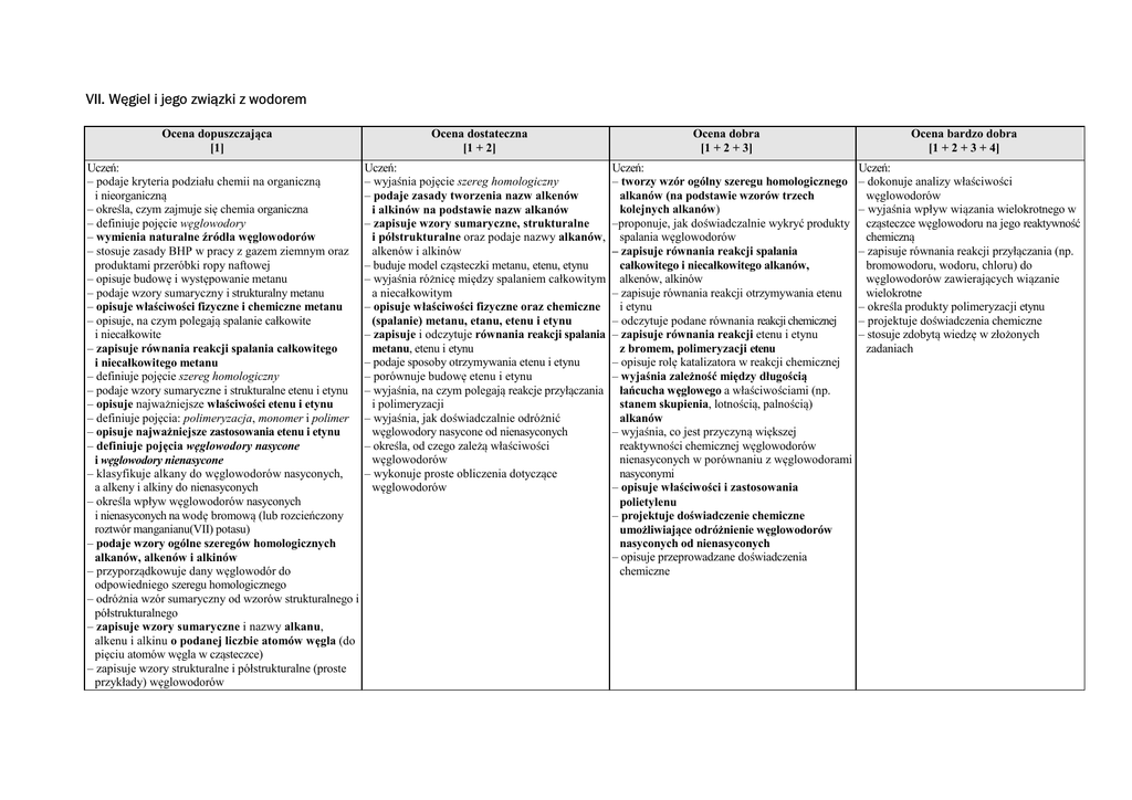 VII. Węgiel i jego związki z wodorem Ocena dopuszczająca [1] Uczeń: – podaje kryteria podziału chemii na organiczną i nieorganiczną – określa, czym zajmuje się chemia organiczna – definiuje pojęcie węglowodory – wymienia naturalne źródła węglowodorów – stosuje zasady BHP w pracy z gazem ziemnym oraz produktami przeróbki ropy naftowej – opisuje budowę i występowanie metanu – podaje wzory sumaryczny i strukturalny metanu – opisuje właściwości fizyczne i chemiczne metanu – opisuje, na czym polegają spalanie całkowite i niecałkowite – zapisuje równania reakcji spalania całkowitego i niecałkowitego metanu – definiuje pojęcie szereg homologiczny – podaje wzory sumaryczne i strukturalne etenu i etynu – opisuje najważniejsze właściwości etenu i etynu – definiuje pojęcia: polimeryzacja, monomer i polimer – opisuje najważniejsze zastosowania etenu i etynu – definiuje pojęcia węglowodory nasycone i węglowodory nienasycone – klasyfikuje alkany do węglowodorów nasyconych, a alkeny i alkiny do nienasyconych – określa wpływ węglowodorów nasyconych i nienasyconych na wodę bromową (lub rozcieńczony roztwór manganianu(VII) potasu) – podaje wzory ogólne szeregów homologicznych alkanów, alkenów i alkinów – przyporządkowuje dany węglowodór do odpowiedniego szeregu homologicznego – odróżnia wzór sumaryczny od wzorów strukturalnego i półstrukturalnego – zapisuje wzory sumaryczne i nazwy alkanu, alkenu i alkinu o podanej liczbie atomów węgla (do pięciu atomów węgla w cząsteczce) – zapisuje wzory strukturalne i półstrukturalne (proste przykłady) węglowodorów Ocena dostateczna [1 + 2] Uczeń: – wyjaśnia pojęcie szereg homologiczny – podaje zasady tworzenia nazw alkenów i alkinów na podstawie nazw alkanów – zapisuje wzory sumaryczne, strukturalne i półstrukturalne oraz podaje nazwy alkanów, alkenów i alkinów – buduje model cząsteczki metanu, etenu, etynu – wyjaśnia różnicę między spalaniem całkowitym a niecałkowitym – opisuje właściwości fizyczne oraz chemiczne (spalanie) metanu, etanu, etenu i etynu – zapisuje i odczytuje równania reakcji spalania metanu, etenu i etynu – podaje sposoby otrzymywania etenu i etynu – porównuje budowę etenu i etynu – wyjaśnia, na czym polegają reakcje przyłączania i polimeryzacji – wyjaśnia, jak doświadczalnie odróżnić węglowodory nasycone od nienasyconych – określa, od czego zależą właściwości węglowodorów – wykonuje proste obliczenia dotyczące węglowodorów Ocena dobra [1 + 2 + 3] Uczeń: – tworzy wzór ogólny szeregu homologicznego alkanów (na podstawie wzorów trzech kolejnych alkanów) –proponuje, jak doświadczalnie wykryć produkty spalania węglowodorów – zapisuje równania reakcji spalania całkowitego i niecałkowitego alkanów, alkenów, alkinów – zapisuje równania reakcji otrzymywania etenu i etynu – odczytuje podane równania reakcji chemicznej – zapisuje równania reakcji etenu i etynu z bromem, polimeryzacji etenu – opisuje rolę katalizatora w reakcji chemicznej – wyjaśnia zależność między długością łańcucha węglowego a właściwościami (np. stanem skupienia, lotnością, palnością) alkanów – wyjaśnia, co jest przyczyną większej reaktywności chemicznej węglowodorów nienasyconych w porównaniu z węglowodorami nasyconymi – opisuje właściwości i zastosowania polietylenu – projektuje doświadczenie chemiczne umożliwiające odróżnienie węglowodorów nasyconych od nienasyconych – opisuje przeprowadzane doświadczenia chemiczne Ocena bardzo dobra [1 + 2 + 3 + 4] Uczeń: – dokonuje analizy właściwości węglowodorów – wyjaśnia wpływ wiązania wielokrotnego w cząsteczce węglowodoru na jego reaktywność chemiczną – zapisuje równania reakcji przyłączania (np. bromowodoru, wodoru, chloru) do węglowodorów zawierających wiązanie wielokrotne – określa produkty polimeryzacji etynu – projektuje doświadczenia chemiczne – stosuje zdobytą wiedzę w złożonych zadaniach