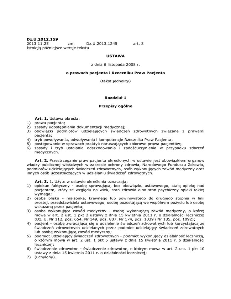 Dz.U.2012.159 2013.11.25 zm. Dz.U.2013.1245 Istnieją późniejsze wersje tekstu art. 8 USTAWA z dnia 6 listopada 2008 r. o prawach pacjenta i Rzeczniku Praw Pacjenta (tekst jednolity) Rozdział 1 Przepisy ogólne Art. 1. Ustawa określa: 1) prawa pacjenta; 2) zasady udostępniania dokumentacji medycznej; 3) obowiązki podmiotów udzielających świadczeń zdrowotnych związane z prawami pacjenta; 4) tryb powoływania, odwoływania i kompetencje Rzecznika Praw Pacjenta; 5) postępowanie w sprawach praktyk naruszających zbiorowe prawa pacjentów; 6) zasady i tryb ustalania odszkodowania i zadośćuczynienia w przypadku zdarzeń medycznych. Art. 2. Przestrzeganie praw pacjenta określonych w ustawie jest obowiązkiem organów władzy publicznej właściwych w zakresie ochrony zdrowia, Narodowego Funduszu Zdrowia, podmiotów udzielających świadczeń zdrowotnych, osób wykonujących zawód medyczny oraz innych osób uczestniczących w udzielaniu świadczeń zdrowotnych. Art. 3. 1. Użyte w ustawie określenia oznaczają: 1) opiekun faktyczny - osobę sprawującą, bez obowiązku ustawowego, stałą opiekę nad pacjentem, który ze względu na wiek, stan zdrowia albo stan psychiczny opieki takiej wymaga; 2) osoba bliska - małżonka, krewnego lub powinowatego do drugiego stopnia w linii prostej, przedstawiciela ustawowego, osobę pozostającą we wspólnym pożyciu lub osobę wskazaną przez pacjenta; 3) osoba wykonująca zawód medyczny - osobę wykonującą zawód medyczny, o której mowa w art. 2 ust. 1 pkt 2 ustawy z dnia 15 kwietnia 2011 r. o działalności leczniczej (Dz. U. Nr 112, poz. 654, Nr 149, poz. 887, Nr 174, poz. 1039 i Nr 185, poz. 1092); 4) pacjent - osobę zwracającą się o udzielenie świadczeń zdrowotnych lub korzystającą ze świadczeń zdrowotnych udzielanych przez podmiot udzielający świadczeń zdrowotnych lub osobę wykonującą zawód medyczny; 5) podmiot udzielający świadczeń zdrowotnych - podmiot wykonujący działalność leczniczą, o którym mowa w art. 2 ust. 1 pkt 5 ustawy z dnia 15 kwietnia 2011 r. o działalności leczniczej; 6) świadczenie zdrowotne - świadczenie zdrowotne, o którym mowa w art. 2 ust. 1 pkt 10 ustawy z dnia 15 kwietnia 2011 r. o działalności leczniczej; 7) (uchylony). 2. Ilekroć w ustawie jest mowa o lekarzu, rozumie się przez to także lekarza dentystę oraz felczera w zakresie wynikającym z przepisów o zawodzie felczera. Art. 4. 1. W razie zawinionego naruszenia praw pacjenta sąd może przyznać poszkodowanemu odpowiednią sumę tytułem zadośćuczynienia pieniężnego za doznaną krzywdę na podstawie art. 448 Kodeksu cywilnego. 2. W razie zawinionego naruszenia prawa pacjenta do umierania w spokoju i godności sąd może, na żądanie małżonka, krewnych lub powinowatych do drugiego stopnia w linii prostej lub przedstawiciela ustawowego, zasądzić odpowiednią sumę pieniężną na wskazany przez nich cel społeczny na podstawie art. 448 Kodeksu cywilnego. 3. Przepisu ust. 1 nie stosuje się do zawinionego naruszenia prawa pacjenta do: 1) przechowywania rzeczy wartościowych w depozycie podmiotu leczniczego wykonującego działalność leczniczą w rodzaju stacjonarne i całodobowe świadczenia zdrowotne; 2) informacji o rodzaju i zakresie świadczeń zdrowotnych udzielanych przez podmioty udzielające świadczeń zdrowotnych; 3) dostępu do dokumentacji medycznej dotyczącej jego stanu zdrowia; 4) zgłaszania działań niepożądanych produktów leczniczych. Art. 5. Kierownik podmiotu udzielającego świadczeń zdrowotnych lub upoważniony przez niego lekarz może ograniczyć korzystanie z praw pacjenta w przypadku wystąpienia zagrożenia epidemicznego lub ze względu na bezpieczeństwo zdrowotne pacjentów, a w przypadku praw, o których mowa w art. 33 ust. 1, także ze względu na możliwości organizacyjne podmiotu. Rozdział 2 Prawo pacjenta do świadczeń zdrowotnych Art. 6. 1. Pacjent ma prawo do świadczeń zdrowotnych odpowiadających wymaganiom aktualnej wiedzy medycznej. 2. Pacjent ma prawo, w sytuacji ograniczonych możliwości udzielenia odpowiednich świadczeń zdrowotnych, do przejrzystej, obiektywnej, opartej na kryteriach medycznych, procedury ustalającej kolejność dostępu do tych świadczeń. 3. Pacjent ma prawo żądać, aby udzielający mu świadczeń zdrowotnych: 1) lekarz zasięgnął opinii innego lekarza lub zwołał konsylium lekarskie; 2) pielęgniarka (położna) zasięgnęła opinii innej pielęgniarki (położnej). 4. Lekarz może odmówić zwołania konsylium lekarskiego lub zasięgnięcia opinii innego lekarza, jeżeli uzna, że żądanie, o którym mowa w ust. 3, jest bezzasadne. 5. Żądanie, o którym mowa w ust. 3, oraz odmowę, o której mowa w ust. 4, odnotowuje się w dokumentacji medycznej. 6. Przepisy ust. 4 i 5 stosuje się do pielęgniarki (położnej) w zakresie zasięgania opinii innej pielęgniarki (położnej). Art. 7. 1. Pacjent ma prawo do natychmiastowego udzielenia świadczeń zdrowotnych ze względu na zagrożenie zdrowia lub życia. 2. W przypadku porodu pacjentka ma prawo do uzyskania świadczeń zdrowotnych związanych z porodem. Art. 8. Pacjent ma prawo do świadczeń zdrowotnych udzielanych z należytą starannością przez podmioty udzielające świadczeń zdrowotnych w warunkach odpowiadających określonym w odrębnych przepisach wymaganiom fachowym i sanitarnym. Przy udzielaniu świadczeń zdrowotnych osoby wykonujące zawód medyczny kierują się zasadami etyki zawodowej określonymi przez właściwe samorządy zawodów medycznych. Rozdział 3 Prawo pacjenta do informacji Art. 9. 1. Pacjent ma prawo do informacji o swoim stanie zdrowia. 2. Pacjent, w tym małoletni, który ukończył 16 lat, lub jego ustawowy przedstawiciel mają prawo do uzyskania od lekarza przystępnej informacji o stanie zdrowia pacjenta, rozpoznaniu, proponowanych oraz możliwych metodach diagnostycznych i leczniczych, dających się przewidzieć następstwach ich zastosowan
