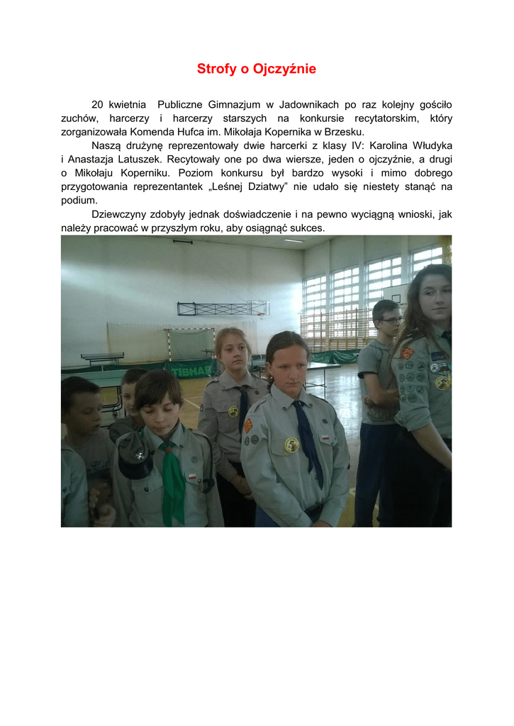 Strofy o Ojczyźnie 20 kwietnia Publiczne Gimnazjum w Jadownikach po raz kolejny gościło zuchów, harcerzy i harcerzy starszych na konkursie recytatorskim, który zorganizowała Komenda Hufca im. Mikołaja Kopernika w Brzesku. Naszą drużynę reprezentowały dwie harcerki z klasy IV: Karolina Włudyka i Anastazja Latuszek. Recytowały one po dwa wiersze, jeden o ojczyźnie, a drugi o Mikołaju Koperniku. Poziom konkursu był bardzo wysoki i mimo dobrego przygotowania reprezentantek „Leśnej Dziatwy” nie udało się niestety stanąć na podium. Dziewczyny zdobyły jednak doświadczenie i na pewno wyciągną wnioski, jak należy pracować w przyszłym roku, aby osiągnąć sukces.