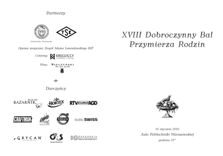 Partnerzy Politechnika Warszawska Oprawa muzyczna: Zespół Adama Lewandowskiego BAT XVIII Dobroczynny Bal P rzymierza R odzin Catering: Wino: q Darczyńcy 16 stycznia 2016 Aula Politechniki Warszawskiej godzina 2100 Patronat Pani Izabeli Dzieduszyckiej Magdalena Kiełczewska Przewodnicząca Stowarzyszenia Przymierze Rodzin Honorowej Przewodniczącej Stowarzyszenia Przymierze Rodzin ma zaszczyt zaprosić q Honorowi Goście Balu Pani Hanna Gronkiewicz-Waltz Prezydent Miasta Stołecznego Warszawy Pan Krzysztof Zanussi Reżyser q Komitet Honorowy Beata Balas-Noszczyk Radca Prawny Wojciech Bazarnik Przedsiębiorca Ludgarda Buzek Maciej Bednarkiewicz Adwokat Joanna Fabisiak Posłanka na Sejm RP Jacek Jezierski Marek Kobielski Prezes Firmy Dimension Data Maja Komorowska Aktorka Jerzy Koźmiński Prezes Polsko-Amerykańskiej Fundacji Wolności Andrzej Kubasiewicz Przedsiębiorca Waldemar Kuk Prezes EURO-net Jacek Kozłowski Jolanta Mycielska Jarosław Myjak Wiceprezes Zarządu PKO Bank Polski Ryszard Petru ......................................................................................................................................................................................................................... na XVIII Dobroczynny Bal Przy mie rza Ro dzin, dzin który odbędzie się w Auli Politechniki Warszawskiej dnia 16 stycznia 2016 roku o godzinie 2100 q Poseł na Sejm RP Maciej Radziwiłł Dyrektor artystyczny balu Przedsiębiorca Jarosław Sellin Sekretarz Stanu w Ministerstwie Kultury i Dziedzictwa Narodowego Jan Szmidt Rektor Politechniki Warszawskiej Joanna Święcicka Prezes Klubu Inteligencji Katolickiej Róża Thun Dorota Roqueplo q q Bal poprowadzą Dominika Wielowieyska i Andrzej Piotrowski Posłanka do Parlamentu Europejskiego Paweł Tyszkiewicz Dyrektor Stowarzyszenia Komunikacji Marketingowej Krzysztof Zakrzewski Radca Prawny q Stroje wieczorowe. Liczba miejsc ograniczona. Cały dochód z balu będzie przeznaczony na dofinansowanie działalności naszych świetlic środowiskowych i na inne cele statutowe. W przedsprzedaży taniej: Do 31 grudnia 2015 Karta wstępu na bal w cenie 450 i 350 zł od osoby, przelewem na konto 58 1240 6218 1111 0000 4617 0420 z dopiskiem „Cele statutowe. Impreza dobroczynna”. Od 2 do 14 stycznia 2016 Karta wstępu 490 i 390 zł od osoby do nabycia w sekretariacie Przymierza Rodzin, ul. Nowogrodzka 51 i w szkołach Przymierza Rodzin (Ursynów, Bielany, Mokotów) lub przelewem na konto 58 1240 6218 1111 0000 4617 0420 z dopiskiem „Cele statutowe. Impreza dobroczynna”. Przy odbiorze kart wstępu prosimy o okazanie dowodu wpłaty. q Sekretariat Przymierza Rodzin, ul. Nowogrodzka 51 tel. 22/625 51 05, 22/621 29 33, godz. 11.00-19.00 Szkola Przymierza Rodzin, ul. M. Grzegorzewskiej 10 tel. 22/641 36 50, 22/641 52 09, godz. 8.00-16.00 Zespól Szkół Przymierza Rodzin, ul. Nocznickiego 7 tel. 22/864 92 50, 22/864 51 24 Szkoła Przymierza Rodzin, ul. Racławicka 14 tel. 22/845 17 42, godz. 8.00 - 16.00 q Zapraszamy na stronę internetową www.balprzymierza.pl Nazwa użytkownika: bal Hasło: balPR2016 q Stowarzyszenie Przymierze Rodzin www.przymierze.org.pl, e-mail: [email protected] Szanowni Państwo, Drodzy Goście! W imieniu Stowarzyszenia Przymierze Rodzin zapraszam Państwa na 18. Charytatywny Bal Przymierza Rodzin, który odbędzie się 16 stycznia 2016 roku w Auli Politechniki Warszawskiej. Jak zwykle zapowiada się wspaniała zabawa do późnej nocy. Czekamy na Państwa z orkiestrą, wyśmienitą kuchnią i przednim winem. W poprzednim roku uzyskaliśmy dzięki Państwa wsparciu rekordowy przychód z balu w wysokości ponad 98 tys. zł. Pieniądze spożytkowaliśmy głównie na wsparcie naszych świetlic oraz na stypendia dla dzieci i młodzieży z naszych szkół. W oczekiwaniu na spotkanie z Państwem przesyłam serdeczności. Magdalena Kiełczewska Przewodnicząca Stowarzyszenia Przymierze Rodzin Stowarzyszenie Przymierze Rodzin jako organizacja pozarządowa powstało w 1983 roku. Obecnie zajmuje się działalnością edukacyjną oraz kulturalnowychowawczą. Praca Przymierza Rodzin odbywa się w grupach rówieśniczych dziecięco młodzieżowych, grupach rodziców i grupach rodzin w 13 Terenowych Ośrodkach Przymierza Rodzin. Poza tym Stowarzyszenie prowadzi wysoko cenione placówki oświatowe – 3 szkoły podstawowe, 4 gimnazja, 2 licea ogólnokształcące, Szkołę Wyższą, 3 świetlice środowiskowe (w Kutnie, Rawie Mazowieckiej i Ursusie) oraz przedszkole.