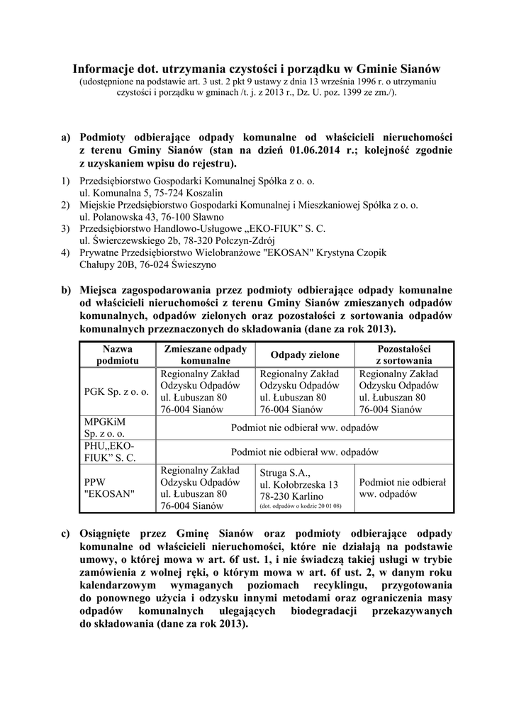 Informacje dot. utrzymania czystości i porządku w Gminie Sianów (udostępnione na podstawie art. 3 ust. 2 pkt 9 ustawy z dnia 13 września 1996 r. o utrzymaniu czystości i porządku w gminach /t. j. z 2013 r., Dz. U. poz. 1399 ze zm./). a) Podmioty odbierające odpady komunalne od właścicieli nieruchomości z terenu Gminy Sianów (stan na dzień 01.06.2014 r.; kolejność zgodnie z uzyskaniem wpisu do rejestru). 1) Przedsiębiorstwo Gospodarki Komunalnej Spółka z o. o. ul. Komunalna 5, 75-724 Koszalin 2) Miejskie Przedsiębiorstwo Gospodarki Komunalnej i Mieszkaniowej Spółka z o. o. ul. Polanowska 43, 76-100 Sławno 3) Przedsiębiorstwo Handlowo-Usługowe „EKO-FIUK” S. C. ul. Świerczewskiego 2b, 78-320 Połczyn-Zdrój 4) Prywatne Przedsiębiorstwo Wielobranżowe "EKOSAN" Krystyna Czopik Chałupy 20B, 76-024 Świeszyno b) Miejsca zagospodarowania przez podmioty odbierające odpady komunalne od właścicieli nieruchomości z terenu Gminy Sianów zmieszanych odpadów komunalnych, odpadów zielonych oraz pozostałości z sortowania odpadów komunalnych przeznaczonych do składowania (dane za rok 2013). Nazwa podmiotu PGK Sp. z o. o. MPGKiM Sp. z o. o. PHU„EKOFIUK” S. C. PPW "EKOSAN" Zmieszane odpady komunalne Regionalny Zakład Odzysku Odpadów ul. Łubuszan 80 76-004 Sianów Odpady zielone Regionalny Zakład Odzysku Odpadów ul. Łubuszan 80 76-004 Sianów Pozostałości z sortowania Regionalny Zakład Odzysku Odpadów ul. Łubuszan 80 76-004 Sianów Podmiot nie odbierał ww. odpadów Podmiot nie odbierał ww. odpadów Regionalny Zakład Odzysku Odpadów ul. Łubuszan 80 76-004 Sianów Struga S.A., ul. Kołobrzeska 13 78-230 Karlino Podmiot nie odbierał ww. odpadów (dot. odpadów o kodzie 20 01 08) c) Osiągnięte przez Gminę Sianów oraz podmioty odbierające odpady komunalne od właścicieli nieruchomości, które nie działają na podstawie umowy, o której mowa w art. 6f ust. 1, i nie świadczą takiej usługi w trybie zamówienia z wolnej ręki, o którym mowa w art. 6f ust. 2, w danym roku kalendarzowym wymaganych poziomach recyklingu, przygotowania do ponownego użycia i odzysku innymi metodami oraz ograniczenia masy odpadów komunalnych ulegających biodegradacji przekazywanych do składowania (dane za rok 2013). Nazwa podmiotu Gmina Sianów Osiągnięty poziom recyklingu, przygotowania do ponownego użycia i odzysku innymi metodami niektórych frakcji odpadów komunalnych Ppmts (%) 13 Osiągnięty poziom ograniczenia masy odpadów komunalnych ulegających biodegradacji przekazywanych do składowania Tr (%) 39,14 MPGKiM Sp. z o. o. Nie dotyczy (podmiot nie odbierał odpadów) PHU„EKO-FIUK” S. C. Nie dotyczy (podmiot nie odbierał odpadów) PPW "EKOSAN" 24 3,08 Osiągnięty w 2013r. przez Gminę Sianów poziom recyklingu, przygotowania do ponownego użycia i odzysku innymi metodami innych niż niebezpieczne odpadów budowlanych i rozbiórkowych P br (%) wyniósł 53,44%. Podmioty odbierające odpady komunalne od właścicieli nieruchomości, które nie działały na podstawie umowy, o której mowa w art. 6f ust. 1, i nie świadczyły takiej usługi w trybie zamówienia z wolnej ręki, o którym mowa w art. 6f ust. 2, nie odbierały w roku 2013 odpadów budowlanych i rozbiórkowych. d) Punkty selektywnego zbierania odpadów komunalnych: Punkt Selektywnego Zbierania Odpadów Komunalnych (PSZOK) znajduje się przy ul. Tylnej 34 w Sianowie. PSZOK czynny jest w każdy czwartek (za wyjątkiem dni ustawowo wolnych od pracy) w godz. 8:00 – 16:00. Prowadzącym punkt jest ZB ABK w Sianowie, ul Armii Polskiej 19, 76-004 Sianów. Podmiotem odbierający odpady z PSZOK-u jest Przedsiębiorstwo Gospodarki Komunalnej Spółka z o. o., ul. Komunalna 5, 75-724 Koszalin. Więcej informacji o punkcie można znaleźć TUTAJ (kliknij). e) Zbierający zużyty sprzęt elektryczny i elektroniczny pochodzący z gospodarstw domowych, o których mowa w ustawie z dnia 29 lipca 2005 r. o zużytym sprzęcie elektrycznym i elektronicznym (Dz. U. z 2013 r. poz. 1155): Zużyty sprzęt elektryczny i elektroniczny odbierało Przedsiębiorstwo Gospodarki Komunalnej Spółka z o.o z siedzibą w Koszalinie, ul. Komunalna 5, 75-724 Koszalin, w ramach odbioru odpadów z PSZOK oraz kwartalnego odbioru poprzez mobilne punkty zbiórki. Dodatkowo, w zakresie odbioru zużytych baterii, swoje punkty zbiórki w placówkach szkolnych utworzone miała REBA Organizacja Odzysku S.A., ul. Kubickiego 19 lok. 16, 02-954 Warszawa.