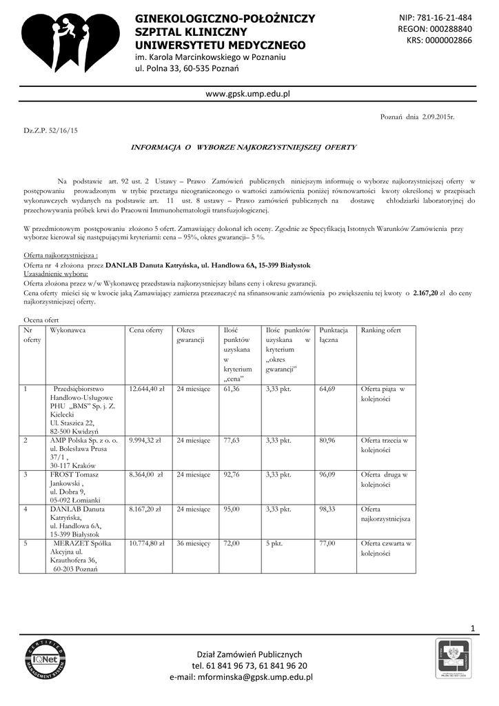NIP: 781-16-21-484 REGON: 000288840 KRS: 0000002866 GINEKOLOGICZNO-POŁOŻNICZY SZPITAL KLINICZNY UNIWERSYTETU MEDYCZNEGO im. Karola Marcinkowskiego w Poznaniu ul. Polna 33, 60-535 Poznań www.gpsk.ump.edu.pl Poznań dnia 2.09.2015r. Dz.Z.P. 52/16/15 INFORMACJA O WYBORZE NAJKORZYSTNIEJSZEJ OFERTY Na podstawie art. 92 ust. 2 Ustawy – Prawo Zamówień publicznych niniejszym informuję o wyborze najkorzystniejszej oferty w postępowaniu prowadzonym w trybie przetargu nieograniczonego o wartości zamówienia poniżej równowartości kwoty określonej w przepisach wykonawczych wydanych na podstawie art. 11 ust. 8 ustawy – Prawo zamówień publicznych na dostawę chłodziarki laboratoryjnej do przechowywania próbek krwi do Pracowni Immunohematologii transfuzjologicznej. W przedmiotowym postępowaniu złożono 5 ofert. Zamawiający dokonał ich oceny. Zgodnie ze Specyfikacją Istotnych Warunków Zamówienia przy wyborze kierował się następującymi kryteriami: cena – 95%, okres gwarancji– 5 %. Oferta najkorzystniejsza : Oferta nr 4 złożona przez DANLAB Danuta Katryńska, ul. Handlowa 6A, 15-399 Białystok Uzasadnienie wyboru: Oferta złożona przez w/w Wykonawcę przedstawia najkorzystniejszy bilans ceny i okresu gwarancji. Cena oferty mieści się w kwocie jaką Zamawiający zamierza przeznaczyć na sfinansowanie zamówienia po zwiększeniu tej kwoty o 2.167,20 zł do ceny najkorzystniejszej oferty. Ocena ofert Nr Wykonawca oferty Cena oferty Okres gwarancji 1 12.644,40 zł 2 3 4 5 Przedsiębiorstwo Handlowo-Usługowe PHU „BMS” Sp. j. Z. Kielecki Ul. Staszica 22, 82-500 Kwidzyń AMP Polska Sp. z o. o. ul. Bolesława Prusa 37/1 , 30-117 Kraków FROST Tomasz Jankowski , ul. Dobra 9, 05-092 Łomianki DANLAB Danuta Katryńska, ul. Handlowa 6A, 15-399 Białystok MERAZET Spółka Akcyjna ul. Krauthofera 36, 60-203 Poznań Ilośc punktów uzyskana w kryterium „okres gwarancji” Punktacja łączna Ranking ofert 24 miesiące Ilość punktów uzyskana w kryterium „cena” 61,36 3,33 pkt. 64,69 Oferta piąta w kolejności 9.994,32 zł 24 miesiące 77,63 3,33 pkt. 80,96 Oferta trzecia w kolejności 8.364,00 zł 24 miesiące 92,76 3,33 pkt. 96,09 Oferta druga w kolejności 8.167,20 zł 24 miesiące 95,00 3,33 pkt. 98,33 Oferta najkorzystniejsza 10.774,80 zł 36 miesięcy 72,00 5 pkt. 77,00 Oferta czwarta w kolejności 1 Dział Zamówień Publicznych tel. 61 841 96 73, 61 841 96 20 e-mail: [email protected]