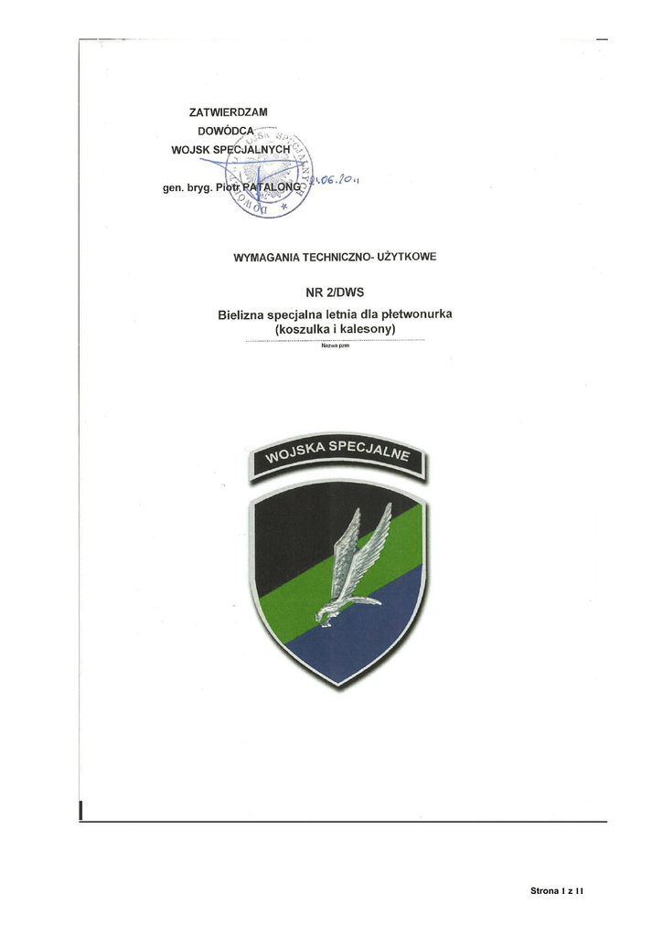 Strona 1 z 11 I. RYSUNEKI MODELOWE 1. Koszulka 2. Kalesony Strona 2 z 11 PRZEDMIOT WYMAGAŃ TECHNICZNO - UŻYTKOWYCH (WTU): II. Przedmiotem WTU są wymagania techniczno-użytkowe dla kompletu bielizny specjalnej letniej dla płetwonurka składającej się z następujących przedmiotów: III. - koszulki z długimi rękawami, - kalesonów długich. PRZEZNACZENIE Bielizna przeznaczona jest jako warstwa ocieplająca pod kombinezon płetwonurka typu suchego w czasie letniego nurkowania w otwartych akwenach morskich przy temperaturze wody ok. 10-18° C. OPIS OGÓLNY WYROBU IV. Bielizna specjalna letnia dla płetwonurka w kolorze khaki wykonana jest z dzianiny dwuwarstwowej z wydzielonymi strefami posiadającymi inne konstrukcje splotu mające na celu zapewnienie lepszej wymiany powietrza. Koszulka z długimi rękawami posiada rękawy jednoczęściowe typu reglan. Dekolt wykończony ściągaczem. Pod pachami i w okolicach lędźwi dzianina o splocie ażurowym pozwalającym na szybsze odprowadzanie potu. Na łokciach wzmocnienia o pogrubione partie dzianiny. Szwy płaskie wykonane na autolapie. Kalesony długie bez rozporka. Góra wykończona dzianiną ściągaczową z dodatkiem przędzy elastomerowej. Kolana wzmocnione o pogrubione partie dzianiny. Doły nogawek proste, wykończone podwinięciem. Wszystkie szwy płaskie wykonane na autolapie. WYMAGANIA TECHNICZNE OGÓLNE V. a) Bielizna specjalna letnia dla płetwonurka WS składa się z koszulki z długim rękawem i kaleson. b) Bielizna musi zapewniać użytkownikowi: - optymalną izolację cieplną (komfort cieplny) tj. zapewnienie odpowiedniej temperatury organizmu i ochronę organizmu przed wychłodzeniem lub przegrzaniem; - posiadać właściwości bakteriostatyczne - odpowiedni komfort noszenia polegający na właściwym dopasowaniu wyrobów do sylwetki użytkownika oraz zastosowaniu płaskich szwów zapobiegającym otarciom i pozwalających na zachowanie swobody ruchów; - dzianina z której wykonana jest bielizna musi zawierać jony srebra (zastosowana technologia musi w sposób trwały zabezpieczać możliwość wypłukiwania (usunięcia) jonów srebra w procesie prania) oraz zapewniać odpowiedni komfort Strona 3 z 11 noszenia tzn. musi zapewniać nieskrępowaną swobodę ruchów, nie może uciskać, nie może podrażniać i przeszkadzać w czasie użytkowania, powinna być delikatna w dotyku i stabilna na ciele tzn. nie może przemieszczać się ani rotować w czasie użytkowania (efekt „drugiej skóry”), musi posiadać anatomiczny krój dopasowany do sylwetki użytkownika. Ma posiadać płaskie i przesunięte szwy naramienne zapobiegające otarciom i nakładaniu się szwów z następnych warstw odzieży; - bielizna musi być wykonana z materiałów szybkoschnących, a zastosowana dzianina musi efektywnie odprowadzać pot, hamować powstawanie brzydkich zapachów. Wykonana w kolorze khaki (dopuszczalne są niewielkie wstawki i innych stonowanych kolorach będących odcieniem koloru, nie dopuszcza się kolorów jaskrawych i odblaskowych), musi być dostosowana do prania w temperaturze do 40° C, a po praniu nie musi wymagać prasowania; Wymagane jest złożenie przez oferenta wyników badań dzianiny zasadniczej, potwierdzonych przez akredytowane laboratorium stwierdzające wymagania zawarte w tab. nr 2, oraz oświadczenia o zgodności parametrów oferowanego wyrobu z zapisami zawartymi w WTU oraz dokumentach wystawionych przez producenta/importera lub oferenta o parametrach dzianiny zasadniczej W celu zgodności oceny przedmiotu oferty z wymaganiami Zamawiającego, wraz z ofertą należy przedstawić jako wzór jednego kpl. bielizny specjalnej letniej dla płetwonurka w rozmiarze…... WYMAGANIA VI. DOTYCZĄCE MATERIAŁÓW ZASADNICZYCH I SUROWCÓW: Tablica nr 1. Materiały i dodatki Lp. Nazwa materiału 1 Dzianina zasadnicza 2 Nici odzieżowe 3 Nici odzieżowe na autolap Typ, rodzaj, charakterystyka materiału dzianina dwuwarstwowa w kolorze khaki nici z poliestrowych włókien odcinkowych o masie liniowej 180 dTex x 1 w kolorze dzianiny zasadniczej nici poliestrowe z włókien ciągłych o masie liniowej np. 160 i 80 dtex w kolorze dzianiny zasadniczej Strona 4 z 11 Tablica nr 2. Charakterystyka dzianiny Lp. Jednostk a miary Wartość Oznaczenie i metoda badania wg 248± 11g PN-ISO 3801:1993 Poliamid z jonami srebra 20 PN-P-04847-01:1993 PN-P-01703:1996 Poliamid 53 PN-P-04847.10:1993 Elastan 7 PN-P-04847.10:1993 Polipropylen 20 PN-P-04847.10:1993 248± 11 PN-P-04613:1997 Poliamid z jonami srebra 20 PN-P-04847-01:1993 Poliamid 53 PN-P-04850:1993 Rodzaj parametru 1 Dzianina zasadnicza dwuwarstwowa 2 Masa powierzchniowa dzianiny na koszulkę (średnia) 3 4 5 Skład surowcowy dzianiny zasadniczej na koszulkę g/m % Masa powierzchniowa dzianiny na kalesony (średnia) Skład surowcowy dzianiny zasadniczej na kalesony 2 g/m 2 % Elastan 7 Polipropylen 20 PN-P-04847-05:1993 PN-P-04850:1993 Tablica nr 3. Zmiana wymiarów po praniu i suszeniu Lp. Rodzaj parametru Zmiana wymiarów po praniu i suszeniu w temp. C nie więcej niż: Jednostka miary kierunek wzdłużny Wartość 0,0 ± 0,5 PN-EN ISO 6330+A1:2009; metoda 5A % kierunek poprzeczny Oznaczenie i metoda badania wg -2,0 ± 0,5 Strona 5 z 11 Tablica nr 4. Odporność wybarwień na pranie/pot alkaliczny kwaśny/tarcie Lp. Rodzaj parametru pranie w temperaturze 40ºC Jednostka miary zmiana barwy zabrudzenie bieli bawełny Wartość Oznaczenie i metoda badania wg 4/5 [stopień] PN-ISO105-C06+Apl:1999 4/5 zmiana barwy Pot alkaliczny / zabrudzenie kwaśny bieli bawełny [stopień] tarcie suche zabrudzenie wzdłużwszerz bieli [stopień] 4/5 tarcie mokre zabrudzenie wzdłużwszerz bieli [stopień] 4/5 PN-EN ISO 105-E04:2009 PN-EN ISO 105-X12:2005 Trzpień:Ø16mm;nacisk 9N;nasiąkliwość 100% Tablica nr 5. Wytrzymałość na przebicie kulą Lp. Rodzaj parametru Wytrzymałość na przebicie kulką Jednostka miary Wartość [N] 415 ± 29 Jednostka miary Wartość [m²Pa/W] 4,9± 0,3 Oznaczenie i