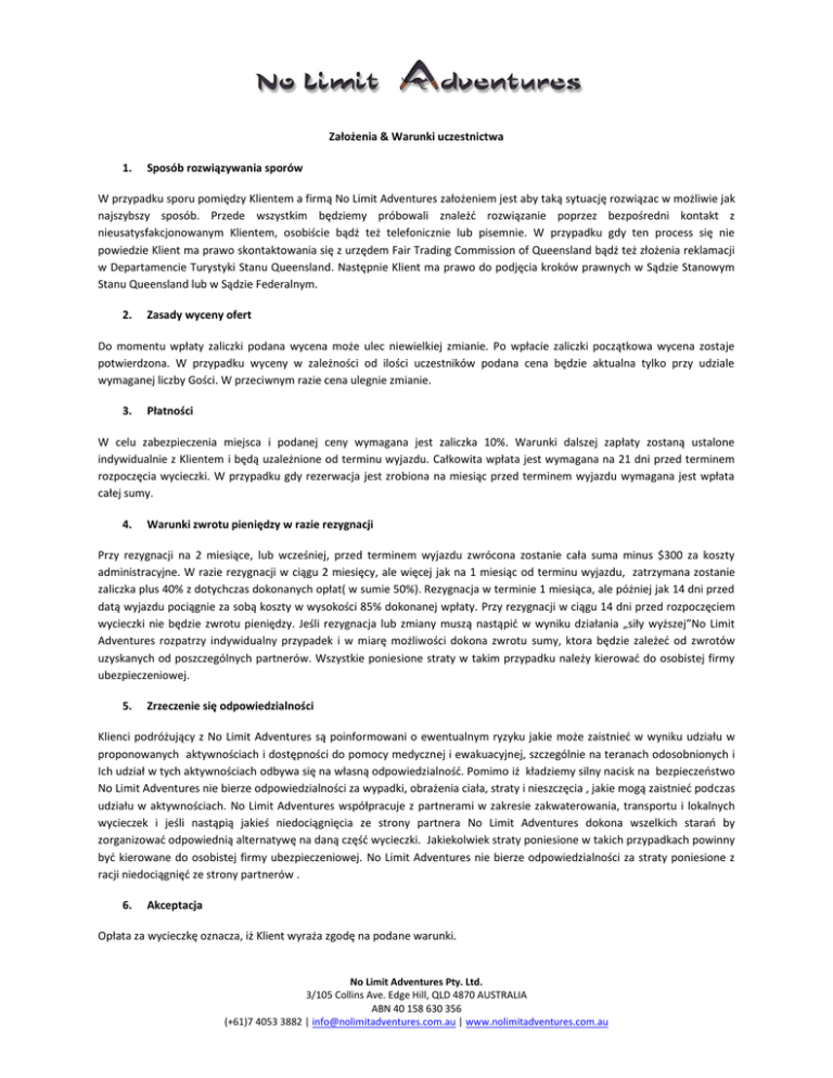 Założenia & Warunki uczestnictwa 1. Sposób rozwiązywania sporów W przypadku sporu pomiędzy Klientem a firmą No Limit Adventures założeniem jest aby taką sytuację rozwiązac w możliwie jak najszybszy sposób. Przede wszystkim będziemy próbowali znależd rozwiązanie poprzez bezpośredni kontakt z nieusatysfakcjonowanym Klientem, osobiście bądż też telefonicznie lub pisemnie. W przypadku gdy ten process się nie powiedzie Klient ma prawo skontaktowania się z urzędem Fair Trading Commission of Queensland bądż też złożenia reklamacji w Departamencie Turystyki Stanu Queensland. Następnie Klient ma prawo do podjęcia kroków prawnych w Sądzie Stanowym Stanu Queensland lub w Sądzie Federalnym. 2. Zasady wyceny ofert Do momentu wpłaty zaliczki podana wycena może ulec niewielkiej zmianie. Po wpłacie zaliczki początkowa wycena zostaje potwierdzona. W przypadku wyceny w zależności od ilości uczestników podana cena będzie aktualna tylko przy udziale wymaganej liczby Gości. W przeciwnym razie cena ulegnie zmianie. 3. Płatności W celu zabezpieczenia miejsca i podanej ceny wymagana jest zaliczka 10%. Warunki dalszej zapłaty zostaną ustalone indywidualnie z Klientem i będą uzależnione od terminu wyjazdu. Całkowita wpłata jest wymagana na 21 dni przed terminem rozpoczęcia wycieczki. W przypadku gdy rezerwacja jest zrobiona na miesiąc przed terminem wyjazdu wymagana jest wpłata całej sumy. 4. Warunki zwrotu pieniędzy w razie rezygnacji Przy rezygnacji na 2 miesiące, lub wcześniej, przed terminem wyjazdu zwrócona zostanie cała suma minus $300 za koszty administracyjne. W razie rezygnacji w ciągu 2 miesięcy, ale więcej jak na 1 miesiąc od terminu wyjazdu, zatrzymana zostanie zaliczka plus 40% z dotychczas dokonanych opłat( w sumie 50%). Rezygnacja w terminie 1 miesiąca, ale póżniej jak 14 dni przed datą wyjazdu pociągnie za sobą koszty w wysokości 85% dokonanej wpłaty. Przy rezygnacji w ciągu 14 dni przed rozpoczęciem wycieczki nie będzie zwrotu pieniędzy. Jeśli rezygnacja lub zmiany muszą nastąpid w wyniku działania „siły wyższej”No Limit Adventures rozpatrzy indywidualny przypadek i w miarę możliwości dokona zwrotu sumy, ktora będzie zależed od zwrotów uzyskanych od poszczególnych partnerów. Wszystkie poniesione straty w takim przypadku należy kierowad do osobistej firmy ubezpieczeniowej. 5. Zrzeczenie się odpowiedzialności Klienci podróżujący z No Limit Adventures są poinformowani o ewentualnym ryzyku jakie może zaistnied w wyniku udziału w proponowanych aktywnościach i dostępności do pomocy medycznej i ewakuacyjnej, szczególnie na teranach odosobnionych i Ich udział w tych aktywnościach odbywa się na własną odpowiedzialnośd. Pomimo iż kładziemy silny nacisk na bezpieczeostwo No Limit Adventures nie bierze odpowiedzialności za wypadki, obrażenia ciała, straty i nieszczęcia , jakie mogą zaistnied podczas udziału w aktywnościach. No Limit Adventures współpracuje z partnerami w zakresie zakwaterowania, transportu i lokalnych wycieczek i jeśli nastąpią jakieś niedociągnięcia ze strony partnera No Limit Adventures dokona wszelkich starao by zorganizowad odpowiednią alternatywę na daną częśd wycieczki. Jakiekolwiek straty poniesione w takich przypadkach powinny byd kierowane do osobistej firmy ubezpieczeniowej. No Limit Adventures nie bierze odpowiedzialności za straty poniesione z racji niedociągnięd ze strony partnerów . 6. Akceptacja Opłata za wycieczkę oznacza, iż Klient wyraża zgodę na podane warunki. No Limit Adventures Pty. Ltd. 3/105 Collins Ave. Edge Hill, QLD 4870 AUSTRALIA ABN 40 158 630 356 (+61)7 4053 3882 | [email protected] | www.nolimitadventures.com.au