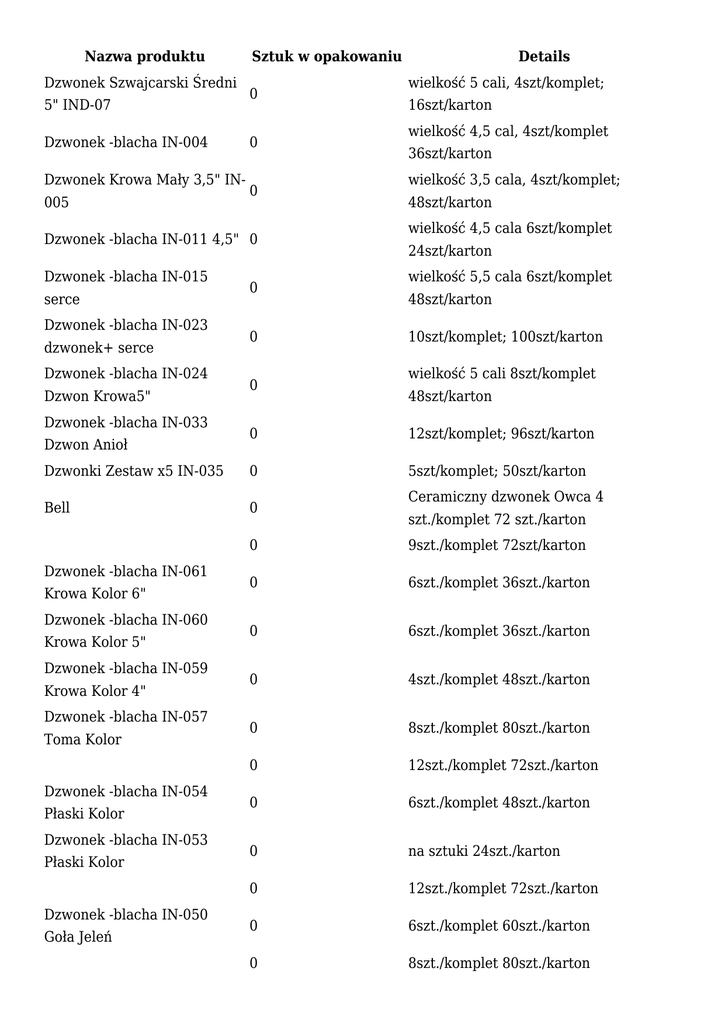 Nazwa produktu Dzwonek Szwajcarski Średni 5" IND-07 Dzwonek -blacha IN-004 Dzwonek Krowa Mały 3,5" IN005 Sztuk w opakowaniu 0 0 0 Dzwonek -blacha IN-011 4,5" 0 Dzwonek -blacha IN-015 serce Dzwonek -blacha IN-023 dzwonek+ serce Dzwonek -blacha IN-024 Dzwon Krowa5" Dzwonek -blacha IN-033 0 0 0 Details wielkość 5 cali, 4szt/komplet; 16szt/karton wielkość 4,5 cal, 4szt/komplet 36szt/karton wielkość 3,5 cala, 4szt/komplet; 48szt/karton wielkość 4,5 cala 6szt/komplet 24szt/karton wielkość 5,5 cala 6szt/komplet 48szt/karton 10szt/komplet; 100szt/karton wielkość 5 cali 8szt/komplet 48szt/karton 0 12szt/komplet; 96szt/karton Dzwonki Zestaw x5 IN-035 0 5szt/komplet; 50szt/karton Bell 0 Dzwon Anioł Dzwonek -blacha IN-061 Krowa Kolor 6" Dzwonek -blacha IN-060 Krowa Kolor 5" Dzwonek -blacha IN-059 Krowa Kolor 4" Dzwonek -blacha IN-057 Toma Kolor Dzwonek -blacha IN-054 Płaski Kolor Dzwonek -blacha IN-053 Płaski Kolor Dzwonek -blacha IN-050 Goła Jeleń Ceramiczny dzwonek Owca 4 szt./komplet 72 szt./karton 0 9szt./komplet 72szt/karton 0 6szt./komplet 36szt./karton 0 6szt./komplet 36szt./karton 0 4szt./komplet 48szt./karton 0 8szt./komplet 80szt./karton 0 12szt./komplet 72szt./karton 0 6szt./komplet 48szt./karton 0 na sztuki 24szt./karton 0 12szt./komplet 72szt./karton 0 6szt./komplet 60szt./karton 0 8szt./komplet 80szt./karton Nazwa produktu Sztuk w opakowaniu Details 0 6szt./komplet 60szt./karton 0 6szt./komplet 90szt./karton 0 16szt./komplet 72szt./karton 18cm 0 4szt./komplet 32szt/karton 26cm 0 24szt./komplet 864szt/karton 8cm 0 6szt./komplet 72szt./karton 20cm Dzwonek ALG-32 Brelok 0 24szt./komplet 144szt./karton Dzwonek 11632 Czerwony 0 6szt./komplet 60szt./karton Dzwonek 8145 24 6szt./komplet 60szt./karton 10 na sztuki 48szt./karton 0 4szt./komplet 48zt./karton 0 4szt./komplet 100szt./karton 12 4szt./komplet 60szt./karton 0 na sztuki 144szt./karton 0 4szt./komplet 100szt./karton Dzwonek ALG-33 Zestaw 0 4szt./komplet 144szt./karton Dzwonek ALG-35 Zestaw 0 na sztuki 144szt./komplet 0 4szt./komplet 100szt./karton 0 12szt./komplet 200szt./karton 0 12szt./komplet 200szt./karton 0 na sztuki 30szt./karton 0 na sztuki 12szt./karton 0 na sztuki 12szt./karton Dzwonek TO-023 serce 18cm srebro Dzwonek TO-024 serce 26cm czerwone Dzwonek TO-021 serce magnes Dzwonek TO-025 serce 20cm czerwone Dzwonek 15056 Czerwony Skóra Dzwonek 9698 Czerwony Dzwonek M-11140A Czerwony Serce Dzwonek 10927 Serce Czerwone Dzwonek ALG-34 Zestaw Dzwonek M-11138 Czerwony Serce Dzwonek M-11140 Czerwony Serce Brelok 17702 Dzwonek Czerwony Brelok 17718 Dzwonek Dzwonek 12221 Czerwony Skóra Ceramika SM-C443 Dzwonek Duży Dzwonek SG-C445 Kogut Nazwa produktu Dzwonek ES-C004 Ceramiczny Zakopane Dzwonek ES-C005 Ceramiczny Solina Sztuk w opakowaniu Details 0 1szt./komplet 120szt./karton 0 1szt./komplet 120szt./karton