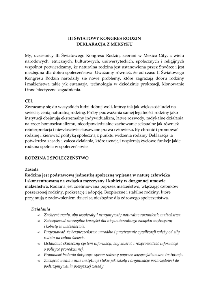 III ŚWIATOWY KONGRES RODZIN DEKLARACJA Z MEKSYKU My, uczestnicy III Światowego Kongresu Rodzin, zebrani w Mexico City, z wielu narodowych, etnicznych, kulturowych, uniwersyteckich, społecznych i religijnych wspólnot potwierdzamy, że naturalna rodzina jest ustanowiona przez Stwórcę i jest niezbędna dla dobra społeczeństwa. Uważamy również, że od czasu II Światowego Kongresu Rodzin narodziły się nowe problemy, które zagrażają dobru rodziny i małżeństwa takie jak eutanazja, technologia w dziedzinie prokreacji, klonowanie i inne bioetyczne zagadnienia. CEL Zwracamy się do wszystkich ludzi dobrej woli, którzy tak jak większość ludzi na świecie, cenią naturalną rodzinę. Próby podważania samej legalności rodziny jako instytucji obejmują ekstremalny indywidualizm, łatwe rozwody, radykalne działania na rzecz homoseksualizmu, nieodpowiedzialne zachowanie seksualne jak również reinterpretacja i niewłaściwie stosowane prawa człowieka. By chronić i promować rodzinę i kierować polityką społeczną z punktu widzenia rodziny Deklaracja ta potwierdza zasady i zaleca działania, które uznają i wspierają życiowe funkcje jakie rodzina spełnia w społeczeństwie. RODZINA I SPOŁECZEŃSTWO Zasada Rodzina jest podstawową jednostką społeczną wpisaną w naturę człowieka i skoncentrowaną na związku mężczyzny i kobiety w dozgonnej umowie małżeństwa. Rodzina jest zdefiniowana poprzez małżeństwo, włączając członków poszerzonej rodziny, prokreację i adopcję. Bezpieczne i stabilne rodziny, które przyjmują z zadowoleniem dzieci są niezbędne dla zdrowego społeczeństwa. Działania • Zachęcać rządy, aby wspierały i utrzymywały naturalne rozumienie małżeństwa. • Zabezpieczać szczególne korzyści dla niepowtarzalnego związku mężczyzny i kobiety w małżeństwie. • Przyznawać, że bezpieczeństwo narodów i przetrwanie cywilizacji zależy od siły rodzin na całym świecie. • Ustanowić skuteczny system informacji, aby zbierać i rozprowadzać informacje o polityce prorodzinnej. • Promować badania dotyczące spraw rodziny poprzez wyspecjalizowane instytucje. • Zachęcać media i inne instytucje (takie jak szkoły i organizacje pozarządowe) do podtrzymywania powyższej zasady. RODZINA I MAŁŻEŃSTWO Zasada Małżeństwo, kamień węgielny zdrowego życia rodzinnego, daje bezpieczeństwo, zadowolenie, znaczenie, radość i duchową dojrzałość mężczyźnie i kobiecie, którzy wstępują w dozgonny związek bezinteresownego przywiązania. W małżeństwie, oboje mąż i żona zobowiązują się do życia we wzajemnej miłości, szacunku, wsparciu i współczuciu. Trwały związek w małżeństwie daje poczucie bezpieczeństwa w rodzinie, które jest potrzebne dzieciom. Dzieci mają prawo do wzajemnie uzupełniającej się miłości rodzicielskiej oraz uwagi ze strony ojca jak i matki, które daje małżeństwo. Ze względu na wagę wychowywania dziecka przez matkę i ojca, polityka społeczna nie powinna zachęcać do wolnych związków lub wychowywania przez jednego rodzica. Działania • Przedstawiać małżeństwo jako pożądane dobro dla mężczyzny i kobiety. • Wprowadzać w życie programy przygotowujące mężczyzn i kobiety do małżeństwa, aby zwiększyć ich szanse powodzenia. • Promować działania, które pomagają w uzdrowieniu małżeństw doświadczających problemów i rozbitych domów. • Zmienić prawo tak, aby zachęcić do wchodzenia w związki małżeńskie. • Podejmować prawne lub inne stosowne działania w przypadkach agresywnych związków. • Zachęcić media i inne instytucje (takie jak szkoły i organizacje pozarządowe) do przestrzegania powyższych zasad. RODZINA I DZIECI Zasada Rodzina jest najlepszym środowiskiem dla zdrowego rozwoju dzieci. Zdrowe życie rodzinne zapewnia podstawowe potrzeby każdego człowieka przynależności oraz zaspokajania pragnienia ludzkiego serca, aby dawać i otrzymywać miłość. Rodzina kształtuje postawę człowieka w stosunku do tak podstawowych spraw jak tożsamość, bezpieczeństwo, odpowiedzialność, miłość, moralność i religia. W osobisty i intymny sposób rodzina troszczy się o swoje dzieci i zabezpiecza duchowy, fizyczny, intelektualny, społeczny, psychologiczny i etyczny rozwój. Działania • Zachęcać i wspierać matki w ich niezbędnej roli troszczenia się o swoje dzieci. • Uznanie żywotnej roli ojców w wychowywaniu dzieci. • • • • • Ułatwianie adopcji jako środka do zabezpieczania dzieciom rodziny i ograniczania aborcji. Uznanie prawa każdego dziecka do ojca i do matki. Wspierać instytucje, które pomagają kobietom i rodzinom w kryzysie. Dążyć do budowania społeczeństwa, w którym wszystkie rodziny mają dostęp do własnych domów, opieki medycznej, pożywienia i możliwości do fizycznego, intelektualnego i rekreacyjnego rozwoju. Zachęcać media i inne instytucje (takie jak szkoły i organizacje pozarządowe) do przestrzegania powyższych zasad. RODZINA I SEKSUALNOŚĆ Zasada Seksualność istnieje dla wyrażenia miłości pomiędzy mężem i żoną oraz dla prokreacji dzieci w związku małżeńskim. Małżeństwo pomiędzy mężczyzną i kobietą tworzy moralny kontekst dla związku seksualnego. Wzajemnie się uzupełniające cechy mężczyzny i kobiety, fizyczne jak i psychologiczne, są oczywiste poprzez bieg historii człowieczeństwa i w każdym społeczeństwie. Zboczenia od naturalnego zachowania seksualnego nie mogą w pełni zaspokoić ludzkiego ducha. Kultura, społeczeństwo i rząd powinny wspierać standardy seksualnej moralności, które wspierają i wzmacniają życie rodziny. Działania • Uznać niepowtarzalne społeczne korzyści z wzajemnie się uzupełniającego związku mężczyzny i kobiety w małżeństwie. • Podjąć stosowne działania, aby pomóc homoseksualistom w programach dobrowolnej rehabilitacji. • Zachęcać media i inne instytucje (takie jak szkoły i