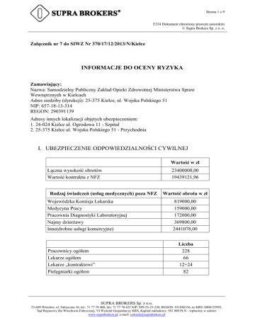 Strona 1 z 9 F334 Dokument chroniony prawem autorskim © Supra Brokers Sp. z o. o. Załącznik nr 7 do SIWZ Nr 370/17/12/2013/N/Kielce INFORMACJE DO OCENY RYZYKA Zamawiający: Nazwa: Samodzielny Publiczny Zakład Opieki Zdrowotnej Ministerstwa Spraw Wewnętrznych w Kielcach Adres siedziby (dyrekcji): 25-375 Kielce, ul. Wojska Polskiego 51 NIP: 657-18-13-314 REGON: 290391139 Adresy innych lokalizacji objętych ubezpieczeniem: 1. 24-024 Kielce ul. Ogrodowa 11 - Szpital 2. 25-375 Kielce ul. Wojska Polskiego 51 - Przychodnia I. UBEZPIECZENIE ODPOWIEDZIALNOŚCI CYWILNEJ Wartość w zł Łączna wysokość obrotów Wartość kontraktu z NFZ Rodzaj świadczeń (usług medycznych) poza NFZ Wojewódzka Komisja Lekarska Medycyna Pracy Pracownia Diagnostyki Laboratoryjnej Najmy dzierżawy Inne(drobne usługi komercyjne) 23400000,00 19439121,96 Wartość obrotu w zł 819000,00 159000,00 172000,00 369800,00 2441078,00 Liczba 228 66 12+24 82 Pracownicy ogółem Lekarze ogółem Lekarze „kontraktowi” Pielęgniarki ogółem SUPRA BROKERS Sp. z o.o. 53-609 Wrocław, ul. Fabryczna 10, tel.: 71 77 70 400, fax: 71 77 70 455 NIP: 899-25-23-230, REGON: 931886336, nr KRS: 0000155993, Sąd Rejonowy dla Wrocławia-Fabrycznej, VI Wydział Gospodarczy KRS, Kapitał zakładowy: 501 800 PLN - wpłacony w całości www.suprabrokers.pl, e-mail: [email protected] Strona 2 z 9 F334 Dokument chroniony prawem autorskim © Supra Brokers Sp. z o. o. Liczba przyjętych w ostatnim roku pacjentów 121096 4108 Lecznictwo otwarte Lecznictwo zamknięte Oddział Oddział chirurgii Oddział wewnętrzny Oddział Intensywnej Terapii Pododdział ortopedii Pododdział chirurgii szczękowej Przychodnia-poliklinika Liczba lekarzy kontraktowych 2 3 4 2 Liczba łóżek 39 44 3 7 1 7 24 x Sposób organizacji opieki lekarskiej podczas dyżurów: Dyżury pełnią lekarze kontraktowi i zatrudnieni na umowę o pracę. OCENA RYZYKA ZAKAŻEŃ SZPITALNYCH 1 2 3 4 5 6 7 8 W podmiocie leczniczym działa Zespół d/s. Zakażeń Szpitalnych W podmiocie leczniczym rejestrowane są zakażenia szpitalne wszystkie wybiórczo Liczba stwierdzanych rocznie zakażeń szpitalnych krwiopochodnych (wzw B, wzw C, hiv) gronkowca innych Podmiot leczniczy zgłasza do Sanepid zakażenia szpitalne/choroby zakaźne wszystkie krwiopochodne Podmiot leczniczy posiada centralną sterylizatornię W podmiocie leczniczym używane są sterylizatory narzędzi na suche, gorące powietrze Prowadzona jest wewnętrzna kontrola procesów sterylizacji Testy używane do kontroli procesów sterylizacji i pracy sterylizatorów: wskaźniki fizyczne wydruk komputerowy TAK NIE X X X 0 0 0 X X X X X X SUPRA BROKERS Sp. z o.o. 53-609 Wrocław, ul. Fabryczna 10, tel.: 71 77 70 400, fax: 71 77 70 455 NIP: 899-25-23-230, REGON: 931886336, nr KRS: 0000155993, Sąd Rejonowy dla Wrocławia-Fabrycznej, VI Wydział Gospodarczy KRS, Kapitał zakładowy: 501 800 PLN - wpłacony w całości www.suprabrokers.pl, e-mail: [email protected] Strona 3 z 9 F334 Dokument chroniony prawem autorskim © Supra Brokers Sp. z o. o. 9 10 11 12 13 14 testy Bowie-Dicka testy paskowe testy zintegrowane testy biologiczne Używane są puszki Schimmelbuscha jako opakowania do sterylizacji Inne opakowania używane do sterylizacji puszki kontenerowe rękawy papierowo – foliowe inne Do mycia rąk używane jest mydło w: dozownikach kostkach Do dezynfekcji rąk używany jest środek dezynfekcyjny w dozownikach Cały personel poddawany jest szkoleniom z zakresu zapobiegania infekcjom szkolenie tylko przy przyjęciu do pracy systematycznie W podmiocie leczniczym opracowane są następujące procedury postępowania mycia i dezynfekcji rąk w czasie pobierania krwi 15 16 17 18 przy wykonywaniu iniekcji podczas dezynfekcji podczas sterylizacji ze sprzętem endoskopowym z zużytym sprzętem jednorazowym ze skażonym mat. biologicznym Przestrzeganie procedur jest systematycznie kontrolowane Możliwa jest izolacja pacjentów chorych zakaźnie Podmiot leczniczy posiada myjnię do endoskopów półautomatyczną automatyczną sterylizator Cały personel narażony na zakażenie wzw jest zaszczepiony przeciwko żółtaczce typu B (na podstawie dokumentacji w Zakł. Leczniczym) X X X X X X X X X X X X X X X X X X X X X X X X SUPRA BROKERS Sp. z o.o. 53-609 Wrocław, ul. Fabryczna 10, tel.: 71 77 70 400, fax: 71 77 70 455 NIP: 899-25-23-230, REGON: 931886336, nr KRS: 0000155993, Sąd Rejonowy dla Wrocławia-Fabrycznej, VI Wydział Gospodarczy KRS, Kapitał zakładowy: 501 800 PLN - wpłacony w całości www.suprabrokers.pl, e-mail: [email protected] Strona 4 z 9 F334 Dokument chroniony prawem autorskim © Supra Brokers Sp. z o. o. Zakres świadczonych usług medycznych Lecznictwo zamknięte Poradnie specjalistyczne Podstawowa Opieka Zdrowotna Zakład rehabilitacji Fizykoterapia Diagnostyka specjalistyczna Stomatologia Apteka szpitalna Transport chorych Zakres świadczonych usług pozamedycznych Wynajem pomieszczeń Podmiot leczniczy : posiada laboratorium diagnostyczne Posiadane certyfikaty Certyfikat ISO 9001 ZARZĄDZANIE RYZYKIEM OC W podmiocie leczniczym został powołany Pełnomocnik (nie dotyczy pełnomocnika prawnego) do spraw postępowania z roszczeniem medycznym. II. UBEZPIECZENIA MIENIA ZASTOSOWANE ZABEZPIECZENIA PRZECIWPOŻAROWE gaśnice hydranty wewnętrzne hydranty zewnętrzne stały dozór SUPRA BROKERS Sp. z o.o. 53-609 Wrocław, ul. Fabryczna 10, tel.: 71 77 70 400, fax: 71 77 70 455 NIP: 899-25-23-230, REGON: 931886336, nr KRS: 0000155993, Sąd Rejonowy dla Wrocławia-Fabrycznej, VI Wydział Gospodarczy KRS, Kapitał zakładowy: 501 800 PLN - wpłacony w całości www.suprabrokers.pl, e-mail: [email protected] Strona 5 z 9 F334 Dokument chroniony prawem autorskim © Supra Brokers Sp. z o. o. OCENA BUDYNKÓW I BUDOWLI Minimalne odległości między budynkami 2 000 m Budynki stoją na posesji ogrodzonej Posesja jest oświetlona Konstrukcja budynków: materiały niepalne, materiały mieszane Budynki są wykonane z płyt wa