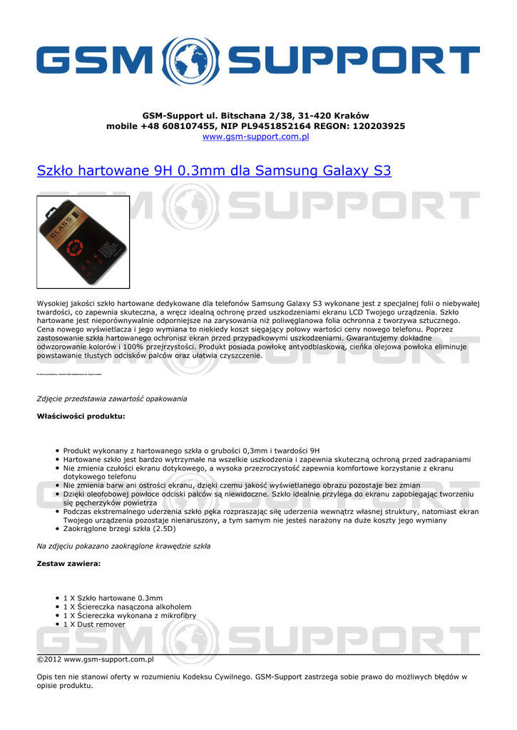 GSM-Support ul. Bitschana 2/38, 31-420 Kraków mobile +48 608107455, NIP PL9451852164 REGON: 120203925 www.gsm-support.com.pl Szkło hartowane 9H 0.3mm dla Samsung Galaxy S3 Wysokiej jakości szkło hartowane dedykowane dla telefonów Samsung Galaxy S3 wykonane jest z specjalnej folii o niebywałej twardości, co zapewnia skuteczna, a wręcz idealną ochronę przed uszkodzeniami ekranu LCD Twojego urządzenia. Szkło hartowane jest nieporównywalnie odporniejsze na zarysowania niż poliwęglanowa folia ochronna z tworzywa sztucznego. Cena nowego wyświetlacza i jego wymiana to niekiedy koszt sięgający połowy wartości ceny nowego telefonu. Poprzez zastosowanie szkła hartowanego ochronisz ekran przed przypadkowymi uszkodzeniami. Gwarantujemy dokładne odwzorowanie kolorów i 100% przejrzystości. Produkt posiada powłokę antyodblaskową, cieńka olejowa powłoka eliminuje powstawanie tłustych odcisków palców oraz ułatwia czyszczenie. W ofercie posiadamy również szkła dedykowane do innych modeli. Zdjęcie przedstawia zawartość opakowania Właściwości produktu: Produkt wykonany z hartowanego szkła o grubości 0,3mm i twardości 9H Hartowane szkło jest bardzo wytrzymałe na wszelkie uszkodzenia i zapewnia skuteczną ochroną przed zadrapaniami Nie zmienia czułości ekranu dotykowego, a wysoka przezroczystość zapewnia komfortowe korzystanie z ekranu dotykowego telefonu Nie zmienia barw ani ostrości ekranu, dzięki czemu jakość wyświetlanego obrazu pozostaje bez zmian Dzięki oleofobowej powłoce odciski palców są niewidoczne. Szkło idealnie przylega do ekranu zapobiegając tworzeniu się pęcherzyków powietrza Podczas ekstremalnego uderzenia szkło pęka rozpraszając siłę uderzenia wewnątrz własnej struktury, natomiast ekran Twojego urządzenia pozostaje nienaruszony, a tym samym nie jesteś narażony na duże koszty jego wymiany Zaokrąglone brzegi szkła (2.5D) Na zdjęciu pokazano zaokrąglone krawędzie szkła Zestaw zawiera: 1 1 1 1 X X X X Szkło hartowane 0.3mm Ściereczka nasączona alkoholem Ściereczka wykonana z mikrofibry Dust remover ©2012 www.gsm-support.com.pl Opis ten nie stanowi oferty w rozumieniu Kodeksu Cywilnego. GSM-Support zastrzega sobie prawo do możliwych błędów w opisie produktu. Prosimy o weryfikację z Państwa strony, a w razie wątpliwości o kontakt. GSM-Support ul. Bitschana 2/38 31-420 Kraków POLSKA tel. 608107455 e-mail: [email protected] Powered by TCPDF (www.tcpdf.org)