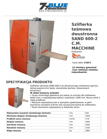 Szlifierka taśmowa dwustronna SAND 600-2 C.M. MACCHINE Producent: Cena netto: 0.00 € 12 miesięcy gwarancji Czas realizacji ustalany indywidualnie SPECYFIKACJA PRODUKTU Szlifierka taśmowa SAND 600-2 do dwustronnego szlifowania (górnej i dolnej powierzchni) belek, elementów dachów i drewnianych konstrukcji. W skład maszyny wchodzi: • Grupy zmiennego gładzenia (po jednej na stronie) dla szlifowania belek wraz z rozbudowaną taśmą o szerokości 1900 mm. Mocny silnik o stałej prędkości. • Maszyna wyposażona jest w specjalne opatentowane, w pełni wymienne narzędzia ścierne oraz oscylacyjną taśmę do szlifowania. • Panel sterowania wyposażony w dotykowy ekran. Maksymalna wysokość obrabianego elementu mm 620 Minimalna długość obrabianego elementu mm 1000 Prędkość pracy maszyny m/min 3-20 Długość maszyny mm 2000 Szerokość maszyny mm 2400 Wysokość maszyny mm 2150 Waga maszyny kg 2800