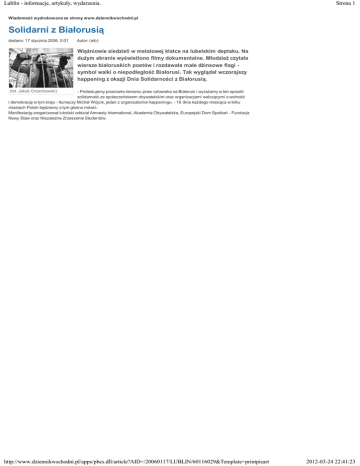 Lublin - informacje, artykuły, wydarzenia. Strona 1 Wiadomość wydrukowana ze strony www.dziennikwschodni.pl Solidarni z Białorusią dodano: 17 stycznia 2006, 0:01 Autor: (mb) Więźniowie siedzieli w metalowej klatce na lubelskim deptaku. Na dużym ekranie wyświetlono filmy dokumentalne. Młodzież czytała wiersze białoruskich poetów i rozdawała małe dżinsowe flagi symbol walki o niepodległość Białorusi. Tak wyglądał wczorajszy happening z okazji Dnia Solidarności z Białorusią. (fot. Jakub Orzechowski) - Protestujemy przeciwko łamaniu praw człowieka na Białorusi i wyrażamy w ten sposób solidarność ze społeczeństwem obywatelskim oraz organizacjami walczącymi o wolność i demokrację w tym kraju - tłumaczy Michał Wójcik, jeden z organizatorów happeningu. - 16 dnia każdego miesiąca w kilku miastach Polski będziemy o tym głośno mówić. Manifestację zorganizował lubelski oddział Amnesty International, Akademia Obywatelska, Europejski Dom Spotkań - Fundacja Nowy Staw oraz Niezależne Zrzeszenie Studentów. http://www.dziennikwschodni.pl/apps/pbcs.dll/article?AID=/20060117/LUBLIN/60116029&Template=printpicart 2012-03-24 22:41:23