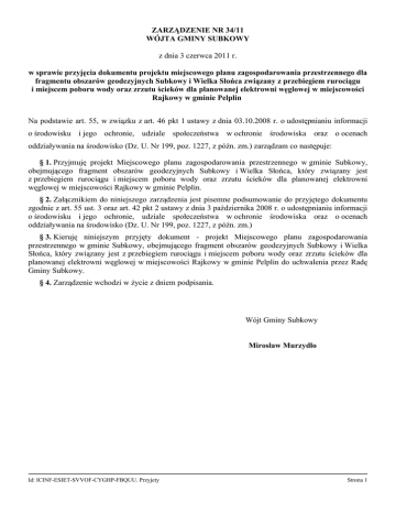 ZARZĄDZENIE NR 34/11 WÓJTA GMINY SUBKOWY z dnia 3 czerwca 2011 r. w sprawie przyjęcia dokumentu projektu miejscowego planu zagospodarowania przestrzennego dla fragmentu obszarów geodezyjnych Subkowy i Wielka Słońca związany z przebiegiem rurociągu i miejscem poboru wody oraz zrzutu ścieków dla planowanej elektrowni węglowej w miejscowości Rajkowy w gminie Pelplin Na podstawie art. 55, w związku z art. 46 pkt 1 ustawy z dnia 03.10.2008 r. o udostępnianiu informacji o środowisku i jego ochronie, udziale społeczeństwa w ochronie środowiska oraz o ocenach oddziaływania na środowisko (Dz. U. Nr 199, poz. 1227, z późn. zm.) zarządzam co następuje: § 1. Przyjmuję projekt Miejscowego planu zagospodarowania przestrzennego w gminie Subkowy, obejmującego fragment obszarów geodezyjnych Subkowy i Wielka Słońca, który związany jest z przebiegiem rurociągu i miejscem poboru wody oraz zrzutu ścieków dla planowanej elektrowni węglowej w miejscowości Rajkowy w gminie Pelplin. § 2. Załącznikiem do niniejszego zarządzenia jest pisemne podsumowanie do przyjętego dokumentu zgodnie z art. 55 ust. 3 oraz art. 42 pkt 2 ustawy z dnia 3 października 2008 r. o udostępnianiu informacji o środowisku i jego ochronie, udziale społeczeństwa w ochronie środowiska oraz o ocenach oddziaływania na środowisko (Dz. U. Nr 199, poz. 1227, z późn. zm.) § 3. Kieruję niniejszym przyjęty dokument - projekt Miejscowego planu zagospodarowania przestrzennego w gminie Subkowy, obejmującego fragment obszarów geodezyjnych Subkowy i Wielka Słońca, który związany jest z przebiegiem rurociągu i miejscem poboru wody oraz zrzutu ścieków dla planowanej elektrowni węglowej w miejscowości Rajkowy w gminie Pelplin do uchwalenia przez Radę Gminy Subkowy. § 4. Zarządzenie wchodzi w życie z dniem podpisania. Wójt Gminy Subkowy Mirosław Murzydło Id: ICINF-ESIET-SVVOF-CYGHP-FBQUU. Przyjety Strona 1 Załącznik do Zarządzenia Nr 34/11 Wójta Gminy Subkowy z dnia 3 czerwca 2011 r. w sprawie przyjęcia dokumentu projektu miejscowego planu zagospodarowania przestrzennego dla obszaru obejmującego w gminie Subkowy fragment obszarów geodezyjnych Subkowy i Wielka Słońca, który związany jest z przebiegiem rurociągu i miejscem poboru wody oraz zrzutu ścieków dla planowanej elektrowni węglowej w miejscowości Rajkowy Pisemne podsumowanie do przyjętego dokumentu projektu miejscowego planu zagospodarowania przestrzennego dla obszaru obejmującego w gminie Subkowy fragment obszarów geodezyjnych Subkowy i Wielka Słońca, który związany jest z przebiegiem rurociągu i miejscem poboru wody oraz zrzutu ścieków dla planowanej elektrowni węglowej w miejscowości Rajkowy Na podstawie art. 55 ust. 3 ustawy z dnia 03 października 2008r. o udostępnianiu informacji o środowisku i jego ochronie, udziale społeczeństwa w ochronie środowiska oraz o ocenach oddziaływania na środowisko (Dz. U. Nr 199, poz. 1227, z późn. zm.) informuję: 1. Zgodnie z przepisami ww. ustawy o udostępnianiu informacji o środowisku i jego ochronie, udziale społeczeństwa w ochronie środowiska oraz o ocenach oddziaływania na środowisko projekty m.in. planów zagospodarowania przestrzennego wymagają przeprowadzenia strategicznej oceny oddziaływania na środowisko. Przedmiotem takiej oceny jest postępowanie w sprawie oceny oddziaływania na środowisko skutków realizacji planu, obejmujące w szczególności: a) uzgodnienie stopnia szczegółowości informacji zawartych w prognozie oddziaływania na środowisko, b) sporządzenie prognozy oddziaływania na środowisko, c) uzyskanie wymaganych ustawą opinii, d) zapewnienie możliwości udziału społeczeństwa w postępowaniu. Zasadniczym dokumentem diagnostycznym w zakresie oddziaływania na środowisko skutków realizacji planu jest dokument prognozy oddziaływania na środowisko. Podstawowym celem prognozy oddziaływania na środowisko realizacji ustaleń miejscowego planu zagospodarowania przestrzennego fragmentu gminy Subkowy, sporządzonej w ramach zespołu autorskiego Planu przez Pro Digital GIS Consulting Solutions w Gdyni, było określenie i ocena potencjalnych oddziaływań na środowisko skutków realizacji ustaleń projektu miejscowego planu zagospodarowania przestrzennego. Oddziaływania te zachodzą na skutek zmian przeznaczenia terenu i lokalizacji określonych funkcji i obiektów infrastruktury. Celem prognozy jest również przedstawienie rozwiązań eliminujących lub ograniczających negatywny wpływ na środowisko. Zakres prognozy został uzgodniony przez Regionalnego Dyrektora Ochrony Środowiska w Gdańsku oraz Państwowego Powiatowego Inspektora Sanitarnego w Tczewie. Uzgodnienia te zostały wydane pismami: - Regionalnego Dyrektora Ochrony Środowiska w Gdańsku z dnia 29 lipca 2010 r. (pismo znak RDOŚ-22-PN.II -7041-19-29/10/mp/as); - Państwowego Powiatowego Inspektora Sanitarnego w Tczewie z dnia 17 lipca 2010 r. (pismo znak : SE-XI-750/25/10). Podstawą wnioskowania w prognozie o zakresie oddziaływania na środowisko realizacji ustaleń projektu Planu była szczegółowa analiza jego zapisów pod kątem zmian przestrzennych zmierzających do lokalizacji nowych lub modyfikacji istniejących źródeł Id: ICINF-ESIET-SVVOF-CYGHP-FBQUU. Przyjety Strona 1 oddziaływania na środowisko. W prognozie zidentyfikowano poszczególne czynniki oddziaływania na środowisko związane z wprowadzeniem zmian w strukturze funkcjonalno–przestrzennej obszaru objętego Planem. Przy ustaleniu ich potencjalnego oddziaływania na środowisko wykorzystano dotychczasowe doświadczenia empiryczne i dane literaturowe. Wykorzystano także wnioski i ustalenia wynikające z opracowań specjalistycznych dla rozpatrywanego terenu. Skutki realizacji ustaleń projektu Planu odnoszono do obowiązujących norm i przepisów prawnych. Oceniono także zgodność ustaleń z wnioskami sformułowanymi w opracowaniach studialnych dotyczących środowiska przy