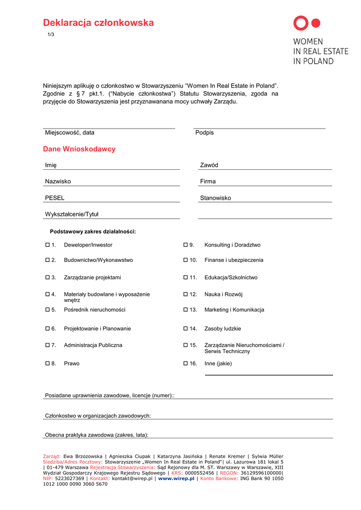 Deklaracja członkowska 1/3 Niniejszym aplikuję o członkostwo w Stowarzyszeniu “Women In Real Estate in Poland”. Zgodnie z § 7 pkt.1. (“Nabycie członkostwa”) Statutu Stowarzyszenia, zgoda na przyjęcie do Stowarzyszenia jest przyznawanana mocy uchwały Zarządu. Miejscowość, data Podpis Dane Wnioskodawcy Imię Zawód Nazwisko Firma PESEL Stanowisko Wykształcenie/Tytuł Podstawowy zakres działalności:  1. Deweloper/Inwestor  9. Konsulting i Doradztwo  2. Budownictwo/Wykonawstwo  10. Finanse i ubezpieczenia  3. Zarządzanie projektami  11. Edukacja/Szkolnictwo  4. Materiały budowlane i wyposażenie wnętrz  12. Nauka i Rozwój  5. Pośrednik nieruchomości  13. Marketing i Komunikacja  6. Projektowanie i Planowanie  14. Zasoby ludzkie  7. Administracja Publiczna  15. Zarządzanie Nieruchomościami / Serwis Techniczny  8. Prawo  16. Inne (jakie)   Posiadane uprawnienia zawodowe, licencje (numer):: Członkostwo w organizacjach zawodowych: Obecna praktyka zawodowa (zakres, lata): Zarząd: Ewa Brzozowska | Agnieszka Ciupak | Katarzyna Jasińska | Renate Kremer | Sylwia Müller Siedziba/Adres Pocztowy: Stowarzyszenie „Women In Real Estate in Poland“| ul. Lazurowa 181 lokal 5 | 01-479 Warszawa Rejestracja Stowarzyszenia: Sąd Rejonowy dla M. ST. Warszawy w Warszawie, XIII Wydział Gospodarczy Krajowego Rejestru Sądowego | KRS: 0000552456 | REGON: 36129596100000| NIP: 5223027369 | Kontakt: [email protected] | www.wirep.pl | Konto Bankowe: ING Bank 90 1050 1012 1000 0090 3060 5670 Deklaracja członkowska 2/3 Czego oczekuję od członkostwa w Women In Real Estate in Poland? Języki: ___________________________________ Hobby / Sport: ___________________________________ Adres prywatny Adres firmowy Ulica, nr domu / m Ulica, nr domu / m Kod pocztowy, miejscowość Kod pocztowy, miejscowość Telefon stacjonarny Telefon stacjonarny Telefon komórkowz Telefon komórkowy E-Mail E-Mail Strona internetowa Strona internetowa Korespondencja Proszę o kontakt w następujący sposób: E-mail do:  mój prywatny adres mailowy  mój firmowy adres mailowy Ogólna korespondencja:  mój adres prywatny  mój adres firmowy Chciałabym przynależeć do Grupy Regionalnej: ____________________________ Składam wniosek o członkostwo z rekomendacji: ____________________________ oraz: ____________________________ Zarząd: Ewa Brzozowska | Agnieszka Ciupak | Katarzyna Jasińska | Renate Kremer | Sylwia Müller Siedziba/Adres Pocztowy: Stowarzyszenie „Women In Real Estate in Poland“| ul. Lazurowa 181 lokal 5 | 01-479 Warszawa Rejestracja Stowarzyszenia: Sąd Rejonowy dla M. ST. Warszawy w Warszawie, XIII Wydział Gospodarczy Krajowego Rejestru Sądowego | KRS: 0000552456 | REGON: 36129596100000| NIP: 5223027369 | Kontakt: [email protected] | www.wirep.pl | Konto Bankowe: ING Bank 90 1050 1012 1000 0090 3060 5670 Deklaracja członkowska 3/3 Składki Wysokość składek członkowskich wynosi 400.00 PLN, a dla studentów 200.00 PLN (do wniosku proszę dołączyć kopię legitymacji studenckiej). W przypadku złożenia aplikacji po 30 czerwca, na dany rok obowiązuje składka obniżona o 50%. Składki członkowskie za dany rok należy regulować w styczniu przelewem na wskazany poniżej numer rachunku. Uznanie zasad stowarzyszenia Wraz z przyjęciem wyrażam zgodę na warunki Stowarzyszenia, w szczególności: - Statut i przepisy wewnętrzne Stowarzyszenia - Wysokość składek członkowskich _____________________________ Miesce, Data _____________________________ Podpis Polityka Prywatności Wyrażam zgodę na gromadzenie, przesyłanie i przetwarzanie powyższych moich danych osobowych na zasadach i w zakresie określonym w Polityce Prywatności Stowarzyszenia Women In Real Estate in Poland zgodnie z Ustawą o Ochronie Danych Osobowych ((Dz.U. 1997 nr 133 poz. 883).Mam w każdym momencie prawo dostępu do informacji o mnie gromadzonych przez Stowarzyszenie. Po rezygnacji z członkostwa moje dane zostaną usunięte. Wyrażam zgodę na przekazanie moich danych współpracującym z Women In Real Estate in Poland. _____________________________ Miejsce, Data kontaktowych organizacjom _____________________________ Podpis Prosimy o przesłanie niniejszego wypełnionego trzystronicowego formularza na adres: [email protected] oraz oryginału pocztą na adres stowarzyszenia : ul. Lazurowa 181 m. 5, 01-479 Warszawa Zarząd: Ewa Brzozowska | Agnieszka Ciupak | Katarzyna Jasińska | Renate Kremer | Sylwia Müller Siedziba/Adres Pocztowy: Stowarzyszenie „Women In Real Estate in Poland“| ul. Lazurowa 181 lokal 5 | 01-479 Warszawa Rejestracja Stowarzyszenia: Sąd Rejonowy dla M. ST. Warszawy w Warszawie, XIII Wydział Gospodarczy Krajowego Rejestru Sądowego | KRS: 0000552456 | REGON: 36129596100000| NIP: 5223027369 | Kontakt: [email protected] | www.wirep.pl | Konto Bankowe: ING Bank 90 1050 1012 1000 0090 3060 5670