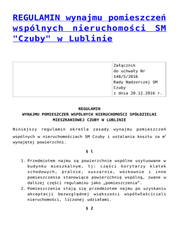 REGULAMIN wynajmu pomieszczeń wspólnych nieruchomości SM "Czuby" w Lublinie Załącznik do uchwały Nr 148/5/2016 Rady Nadzorczej SM Czuby z dnia 20.12.2016 r. REGULAMIN WYNAJMU POMIESZCZEŃ WSPÓLNYCH NIERUCHOMOŚCI SPÓŁDZIELNI MIESZKANIOWEJ CZUBY W LUBLINIE Niniejszy regulamin określa zasady wynajmu pomieszczeń wspólnych w nieruchomościach SM Czuby i ustalania kosztu za m2 wynajętej powierzchni. § l 1. Przedmiotem najmu są powierzchnie wspólne usytuowane w budynku mieszkalnym, tj: części korytarzy klatek schodowych, pralnie, suszarnie, wózkownie i inne pomieszczenia stanowiące powierzchnię wspólną, zwane w dalszej części regulaminu jako „pomieszczenia”. 2. Pomieszczenia stają się przedmiotem najmu po uzyskaniu akceptacji bezwzględnej większości współwłaścicieli nieruchomości, liczonej udziałami. § 2 1. Osoby ubiegające się o wynajęcie składają podanie do Administracji osiedla. 2. Umowy najmu zawiera Zarząd. § 3 1. Przejęcie w użytkowanie pomieszczenia wspólnego w budynku następuje w oparciu o zawartą pomiędzy Spółdzielnią zainteresowaną osobą umowę określającą szczegółowe warunki najmu. 2. Najemca zobowiązany jest ściśle przestrzegać warunków zapisanych w zawartej umowie. § 4 Wynajmujący może rozwiązać umowę najmu bez wypowiedzenia, gdy Najemca: a) używa pomieszczenia w sposób niezgodny z jego przeznaczeniem lub dokonuje zmian naruszających substancję pomieszczenia, budynku, albo używa pomieszczenia w sposób powodujący zniszczenie pomieszczenia, b) nie przestrzega obowiązującego regulaminu porządku domowego, c) zalega z zapłatą czynszu za wynajmowany lokal co najmniej trzy miesiące, d) narusza powszechnie obowiązujące przepisy prawa lub postanowienia umowy najmu. § 5 W przypadku zajmowania pomieszczenia bez tytułu prawnego, Najemca niezależnie od opłat określonych w umowie zapłaci Wynajmującemu karę umowną w wysokości 200% obowiązującego czynszu za każdy miesiąc zajmowania pomieszczenia. § 6 Zmiana wysokości czynszu określonego w umowie , nie wymaga formy aneksu i następuje poprzez jednostronne oświadczenie Wynajmującego złożone Najemcy. § 7 W przypadku nie przekazania pomieszczenia przez Najemcę po rozwiązaniu umowy w oznaczonym przez Wynajmującego terminie Wynajmujący ma prawo jednostronnego przejęcia pomieszczenia, a zgromadzone w nim przedmioty będą przechowywane w płatnym depozycie. § 8 1. Miesięczna stawka opłaty z tytułu najmu pomieszczeń niezależnie od ich usytuowania będzie ustalana na poziomie aktualnych kosztów utrzymania danej nieruchomości według obowiązujących stawek. 2. Jeżeli wynajmowane pomieszczenie jest wyposażone w c.o., c.w., instalację wod-kan, instalację elektryczną, Najemca będzie dodatkowo obciążany odpowiednio kosztami mediów wg zasad obowiązujących w spółdzielni. § 9 Środki finansowe uzyskane z tytułu najmu pomieszczeń będących przedmiotem niniejszego regulaminu stanowią pożytki danej nieruchomości. § 10 Czynsz za wynajem pomieszczenia płatny będzie w ramach opłat eksploatacyjnych jako dodatkowy składnik – „opłata za użytkowanie dodatkowego pomieszczenia”, w przypadku zabudowy części korytarza przylegającego do mieszkania – „opłata za użytkowanie części korytarza”. § 11 1. W sprawach nieuregulowanych w niniejszym regulaminie mają zastosowanie odpowiednie przepisy prawa obowiązujące w Spółdzielni. 2. Postanowienia niniejszego Regulaminu stosuje się również do pomieszczeń gospodarczych, z zastrzeżeniem § 1 ust.2.” § 12 Regulamin niniejszy wchodzi w życie z dniem uchwalenia. Sekretarz Rady Nadzorczej Przewodniczący Rady Nadzorczej Grażyna Kasprzak Alicja Stadnicka